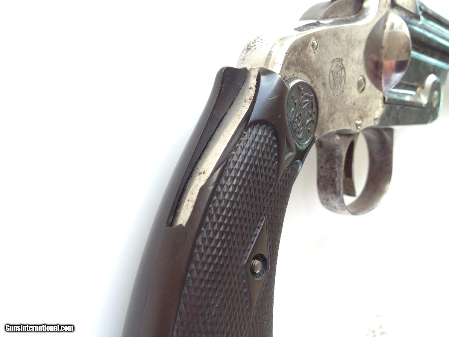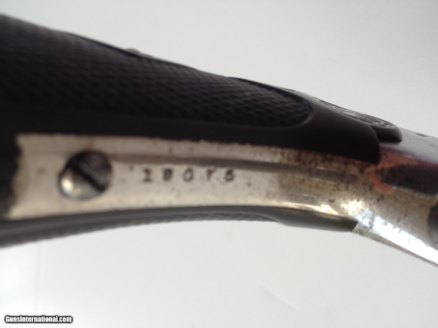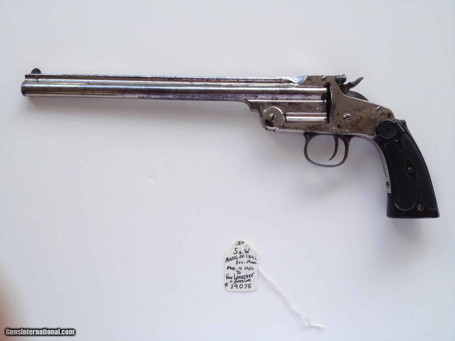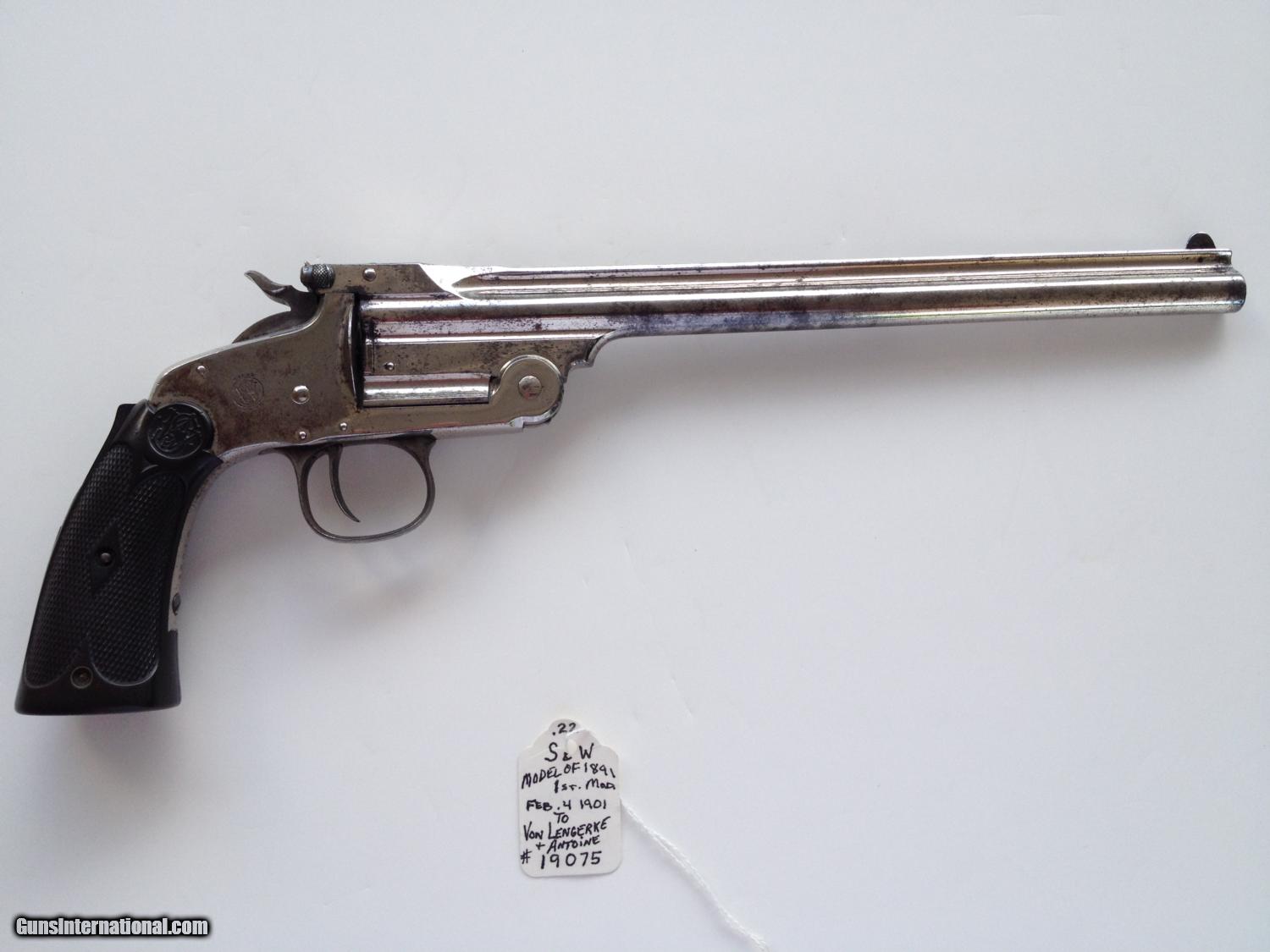 Description: This Single Shot, serial number 19075, was shipped Feb. 4th 1901 and delivered to Von Lengerke & Antoine, Chicago, IL Ten inch barrel, nickel finish, and black hard rubber target grips. It comes with a factory letter. The finish is as you see in the pictures and the top rear of the grips are chipped. All first model single shots are antiques, made prior to 1898, no matter when they were shipped. Was 1175.00.... REDUCED to 1050.00 SOLD Antique: Yes Manufacturer: S&W Model: Model of 1891 Single Shot Serial Number: 19075 Caliber Info: .22RF |