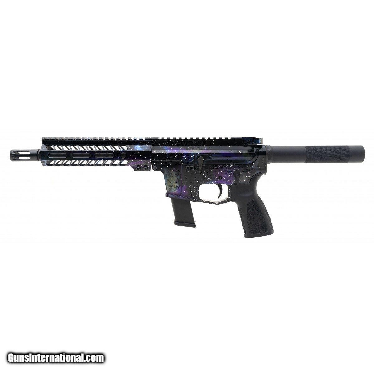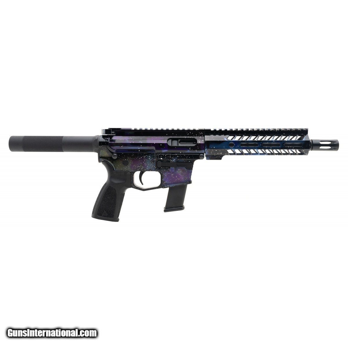 Houston-made tactical pistol with 8"" barrel, 7.5"" free-floating M-Lok rail, and SB tactical brace. Accepts Glock Pattern magazines. In ""Galaxy"" polished anodized finish. NEW. SKU:BD-9Galaxy.