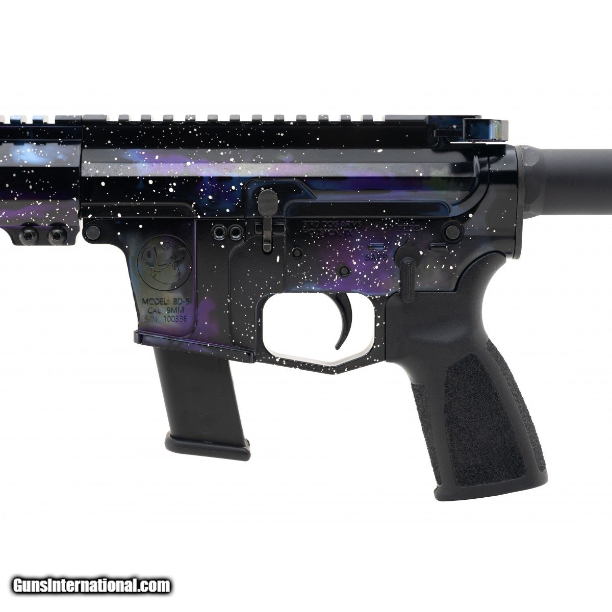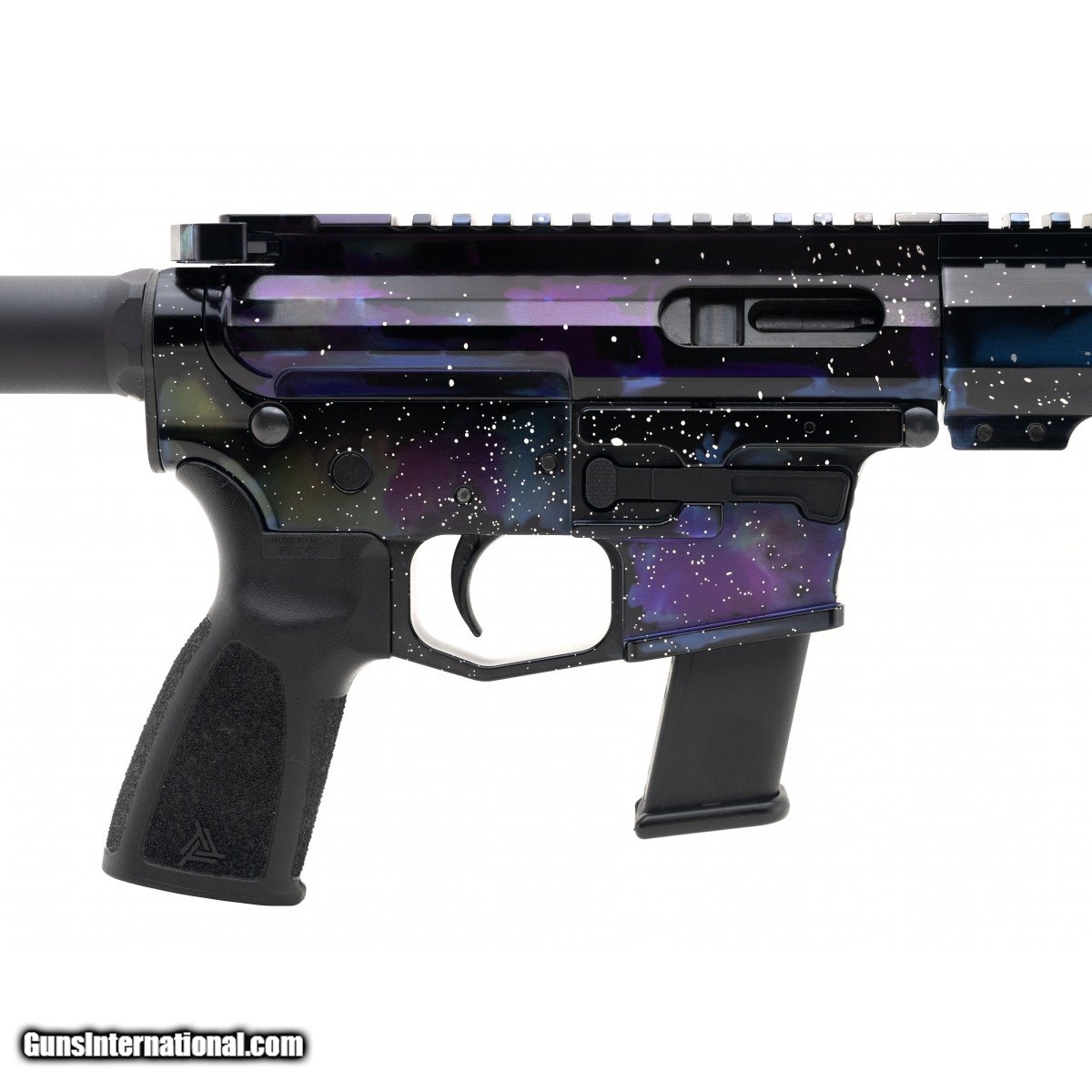 Description: " Houston-made tactical pistol with 8"" barrel, 7.5"" free-floating M-Lok rail, and SB tactical brace. Accepts Glock Pattern magazines. In ""Galaxy"" polished anodized finish. NEW. SKU:BD-9Galaxy. SOLD |