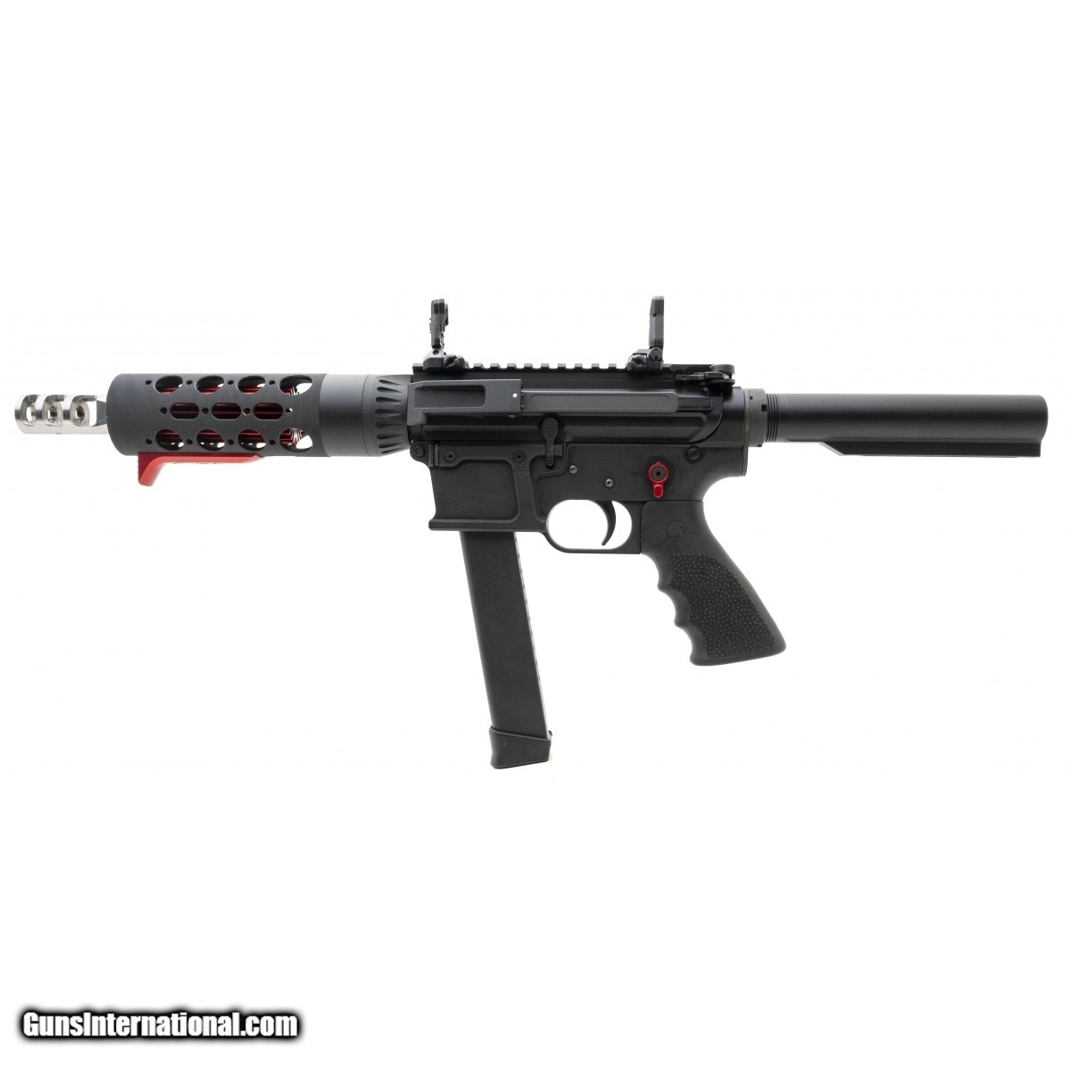 Tactical pistol with a 8"" barrel and red accents that accepts Glock mags. Overall in excellent condition, with flip up iron sights.