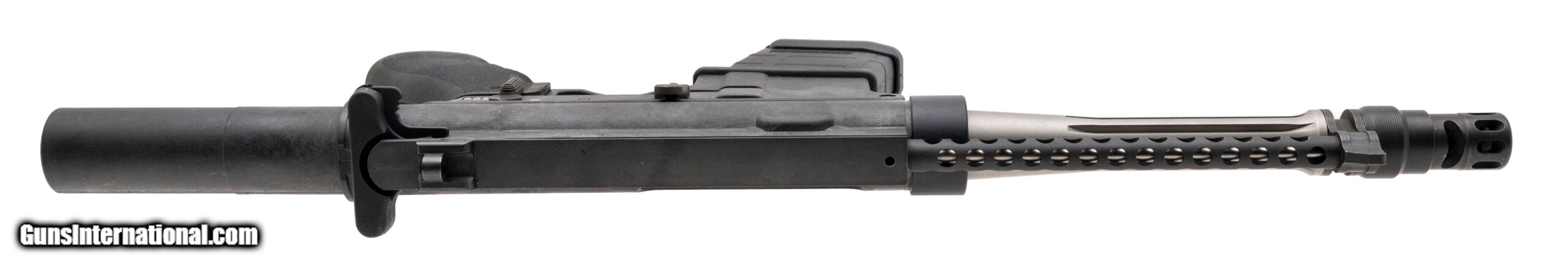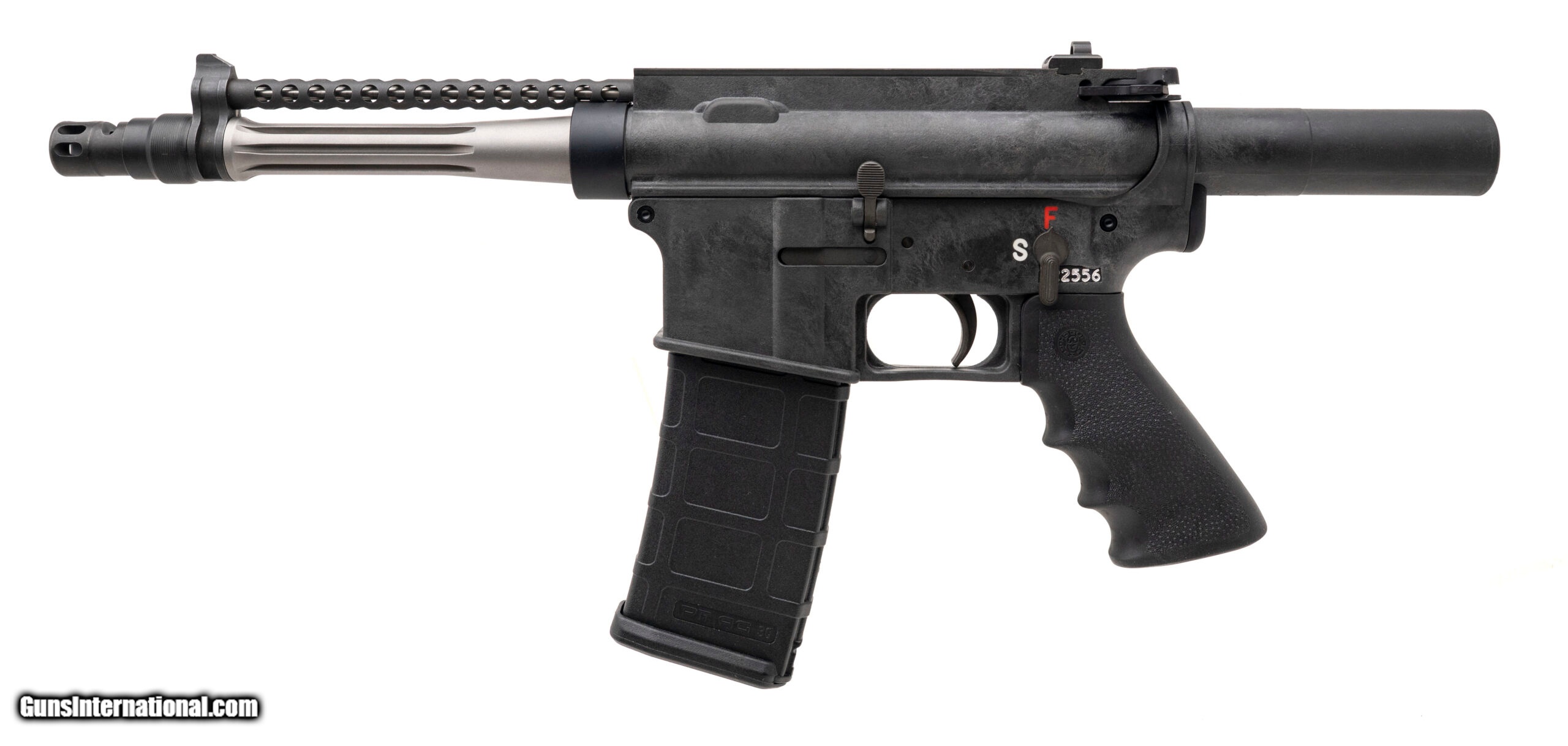 Description: "SN: B22556. 1990s vintage, 5.56 NATO with a 7"" fluted barrel w/muzzle brake. Bore is excellent. Semi-auto tactical pistol with bladed front sight, ghost ring rear sight, stainless barrel, and polymer upper & lower receiver. Includes original box. Overall condition is near excellent. SOLD |