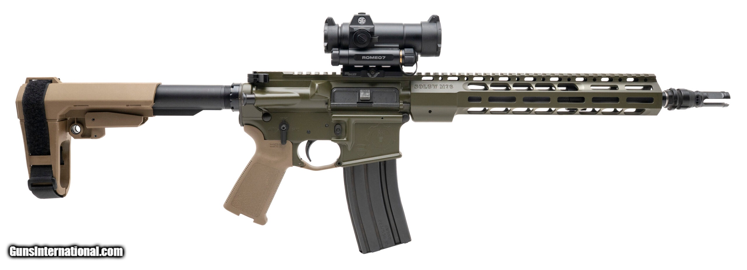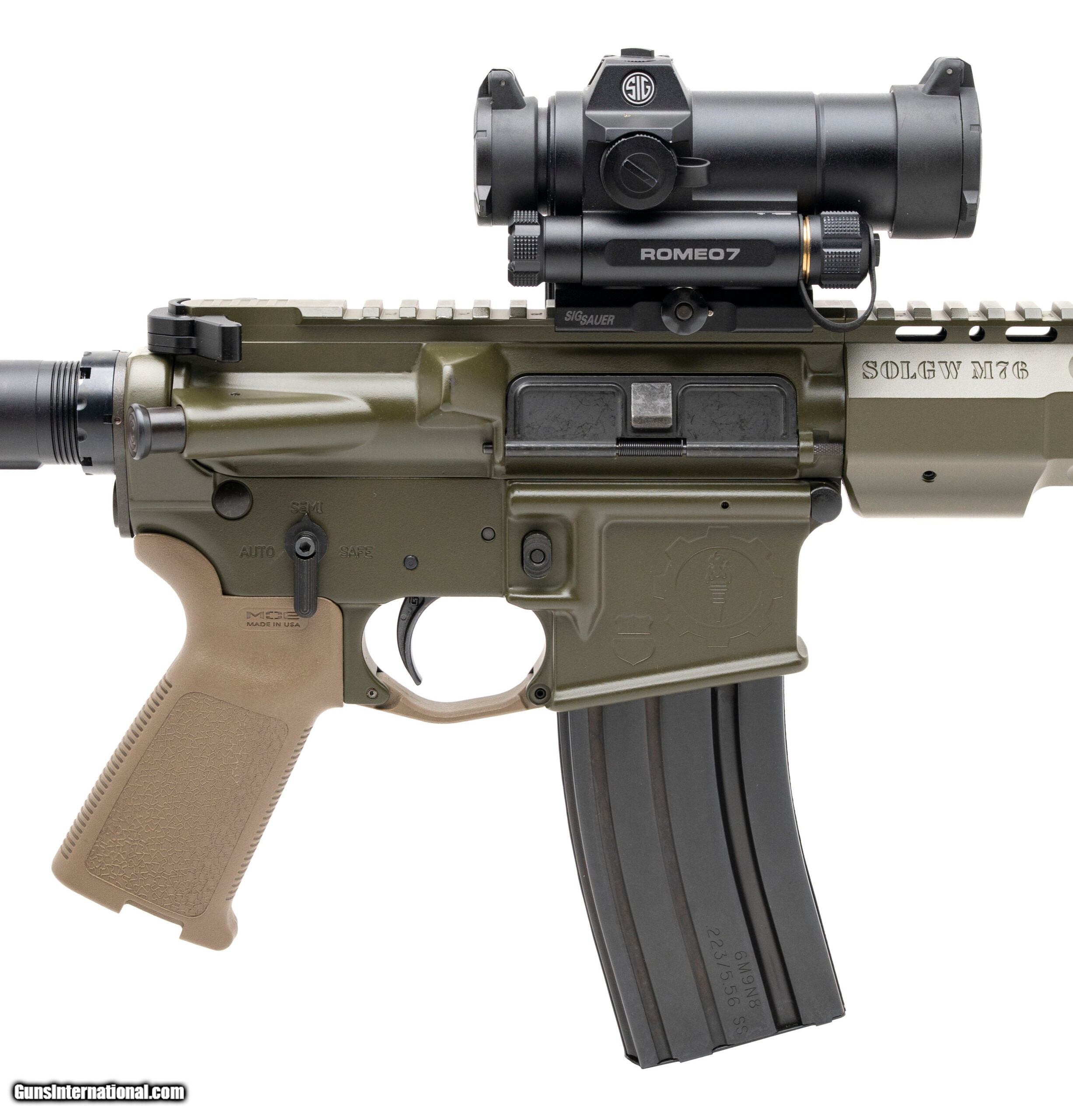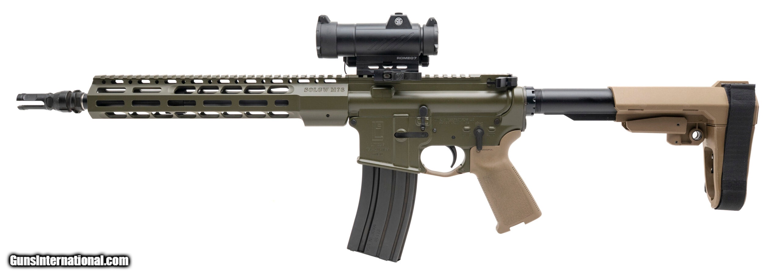 Description: "SN: TBL-109764. Modern production, 5.56 NATO with a 12.5"" barrel w/Nox flash hider. Bore is excellent. Sage Dynamics & SOLGW collaboration semi-auto tactical pistol with a Sig Sauer Romeo 7 red dot optic, Noveske Love Handle charging handle, Geissele trigger, FDE SBA3 brace, FDE Magpul pistol grip, MLOK rail system, and OD green matte finish. Overall condition is near excellent. SOLD |
