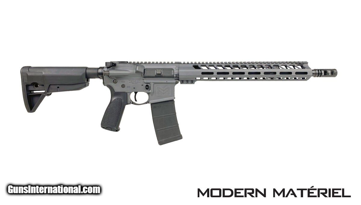 Description: Guns Listing ID: 619741 100% MADE IN AMERICA. All MODMAT rifles are made from domestic parts and assembled in New Jersey. Fully Federally compliant. CERAKOTE FINISH: Slate Grey Length: 32? – 35 1/8? Weight: 6 lb 1.3 oz MM Exit 5.56 V2 Muzzle Brake virtually eliminates muzzle climb while shooting. NATO grooves allow for installation of blast shield or silencer. MODERN MATERIEL 5.56 Custom Profile, 14.5? or 16\" Midlength AR15 Barrel. Machined from 4150 chrome moly, with M4 feed ramps and rifled with a 1:8 twist. Processed with a Black Nitride corrosion resistant finish. MODERN MATERIEL .750” low profile gas block. Paired and custom pinned to the barrel. Processed with a Black Nitride corrosion resistant finish. MODERN MATERIEL 13.5? ultralight free float hand guard – Full Picatinny top rail and M-LOK mounting in 3, 6 & 9 o’clock positions. Domestic 8620 M16 Bolt Carrier Group and 9310 bolt with QPQ corrosion resistant finish. Griffin Armament SN-ACH™ Charging Handle for ambidextrous capabilities. Flattop Upper Receiver – 7075 T6 forged aluminum with ejection port cover, Mil-spec forward assist and brass deflector. MM Lower Receiver – 7075 T6 forged aluminum with magwell texture. HIPERFIRE Enhanced Trigger with 5.5 lbs pull for crisp and clean operation. SPRINCO RECOIL SOLUTIONS tactical buffer (action) spring. IWC Receiver End Plate with ROTATION LIMITED QD Sling Swivel Socket. B5 Systems TYPE 22 P-Grip with plug. B5 Systems BRAVO Stock. B5 Systems Polymer Trigger Guard. Also includes: One Mission First Tactical (MFT) magazine. SOLD Manufacturer: MODERN MATERIEL Model: MODMAT PATROL 14.5" SLATE GREY Caliber Info: 5.56X45MM NATO Condition: new Barrels: 14.5 BARREL |