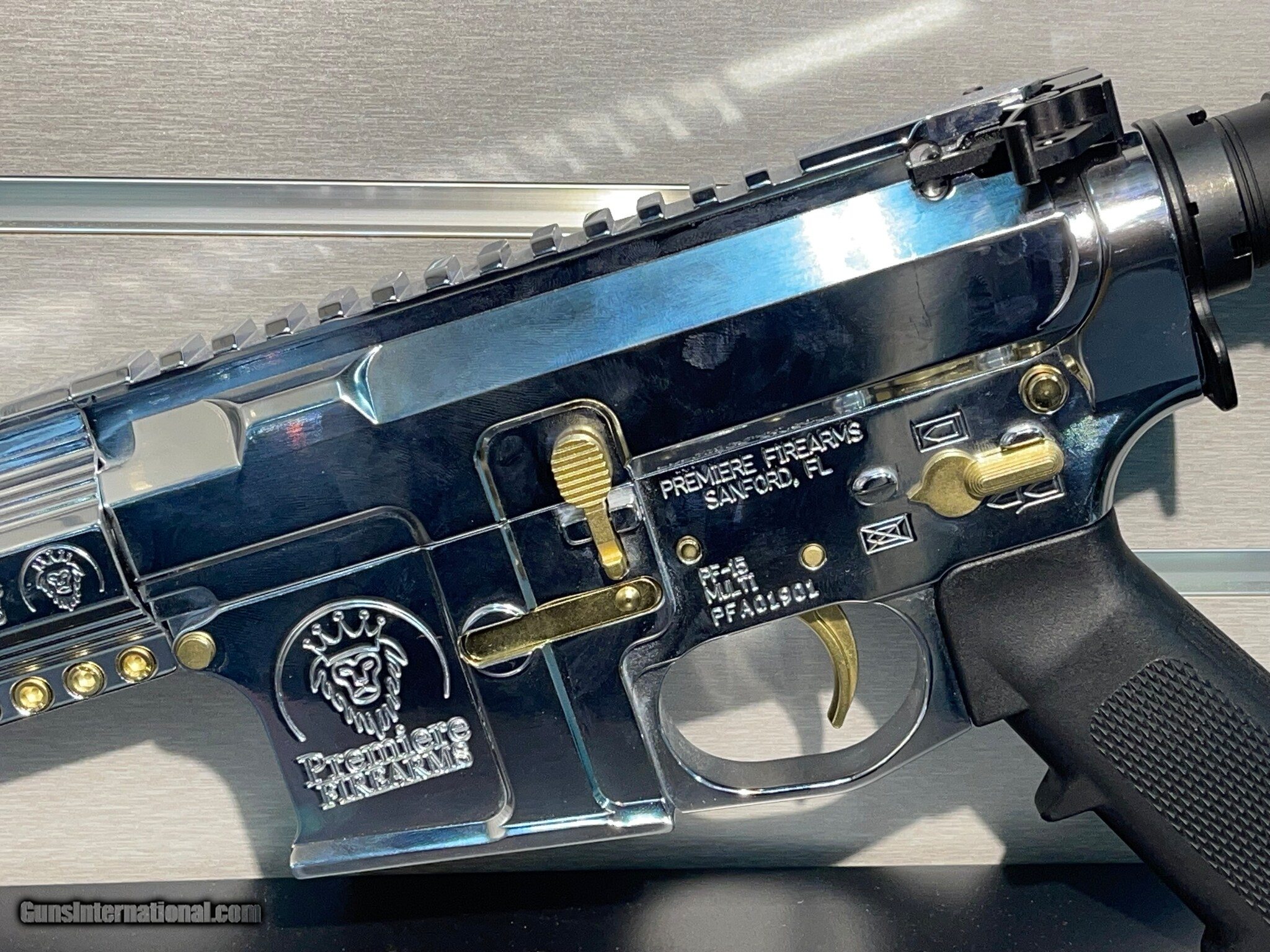 Description: Guns Listing ID: 1132594 New Premier Firearms “El Jefe” PF15 pistol. Chambered in 5.56 NATO 8” barrel Silver Lower and upper , gold barrel, muzzle , mag release, bolts , pins, trigger, and safety. SOLD Manufacturer: PREMIER Model: PF-15 Caliber Info: 5.56X45MM NATO Condition: Used - Non-Certified Barrels: 8 BARREL Finish: SILVER CHROME |