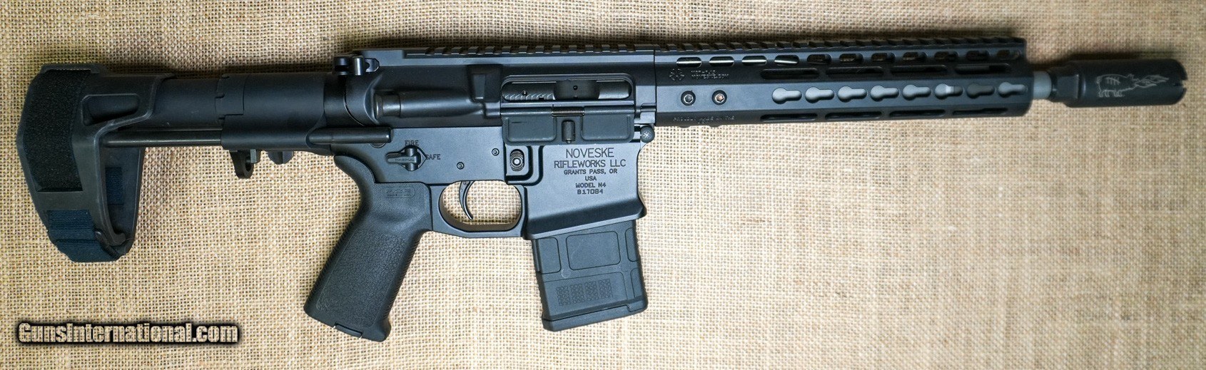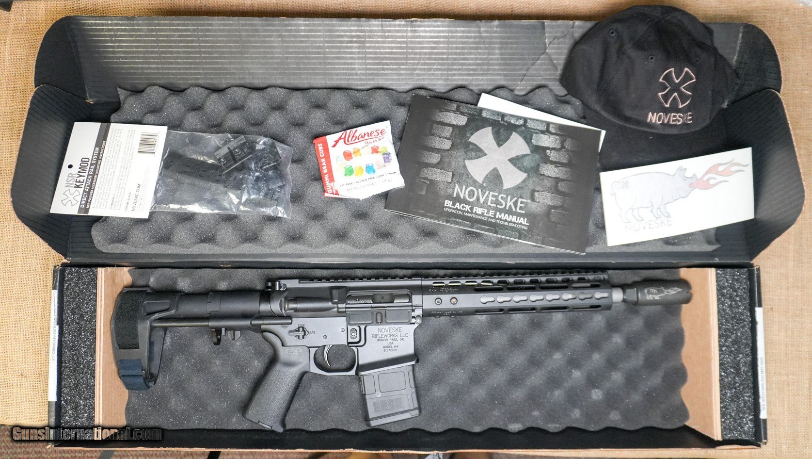 Description: This used Noveske N4 is chambered in 5.56mm and has a 10.5" barrel. The 60-degree throw safety selector feels quick and natural, and the Geissele trigger is crisp and light. It's running a PDW-style brace from SB Tactical and an ambidextrous charging handle.The handguard is KeyMod and comes with a QD sling mount installed. Comes in original box with sticker, hat, rail covers, product manual, and gummy bears. Warning to those with a sweet tooth, the bears are hard as diamonds. Do not eat. $65 shipping to the lower 48, 3% surcharge for using a credit card. If you choose to pay with a personal check, we will hold the item for up to 10 days to make sure that it clears. Please expedite such payments as we will hold an item on your word for 5 days. SOLD Rifle Caliber: 5.56x45mm NATO |