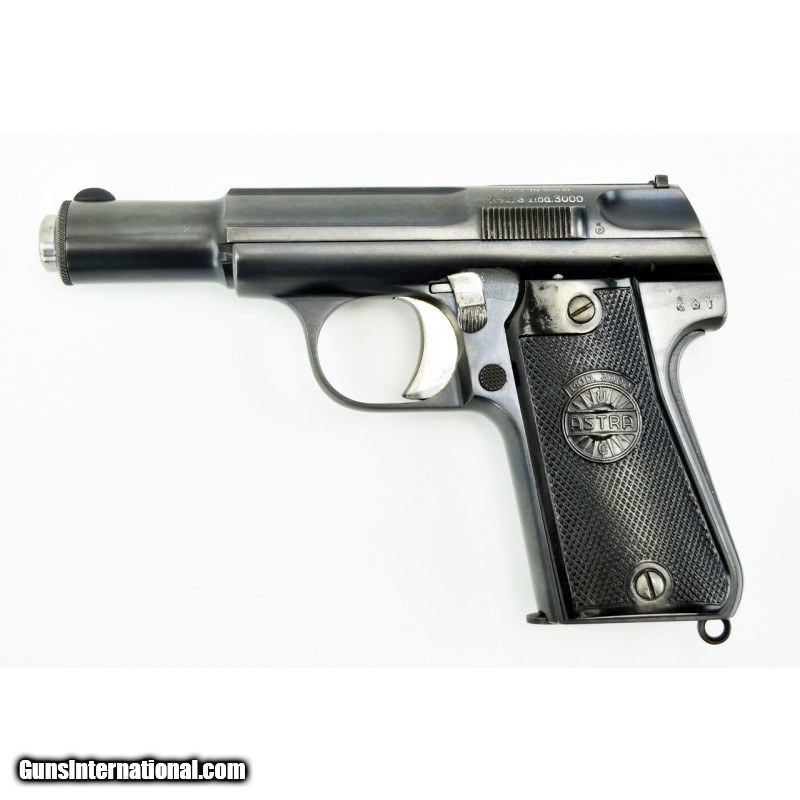 Description: "Astra 3000 7.65mm caliber pistol. Mint condition Astra pocket auto. Excellent bore. Gun has 98-99% blue. Grips are excellent. SOLD |