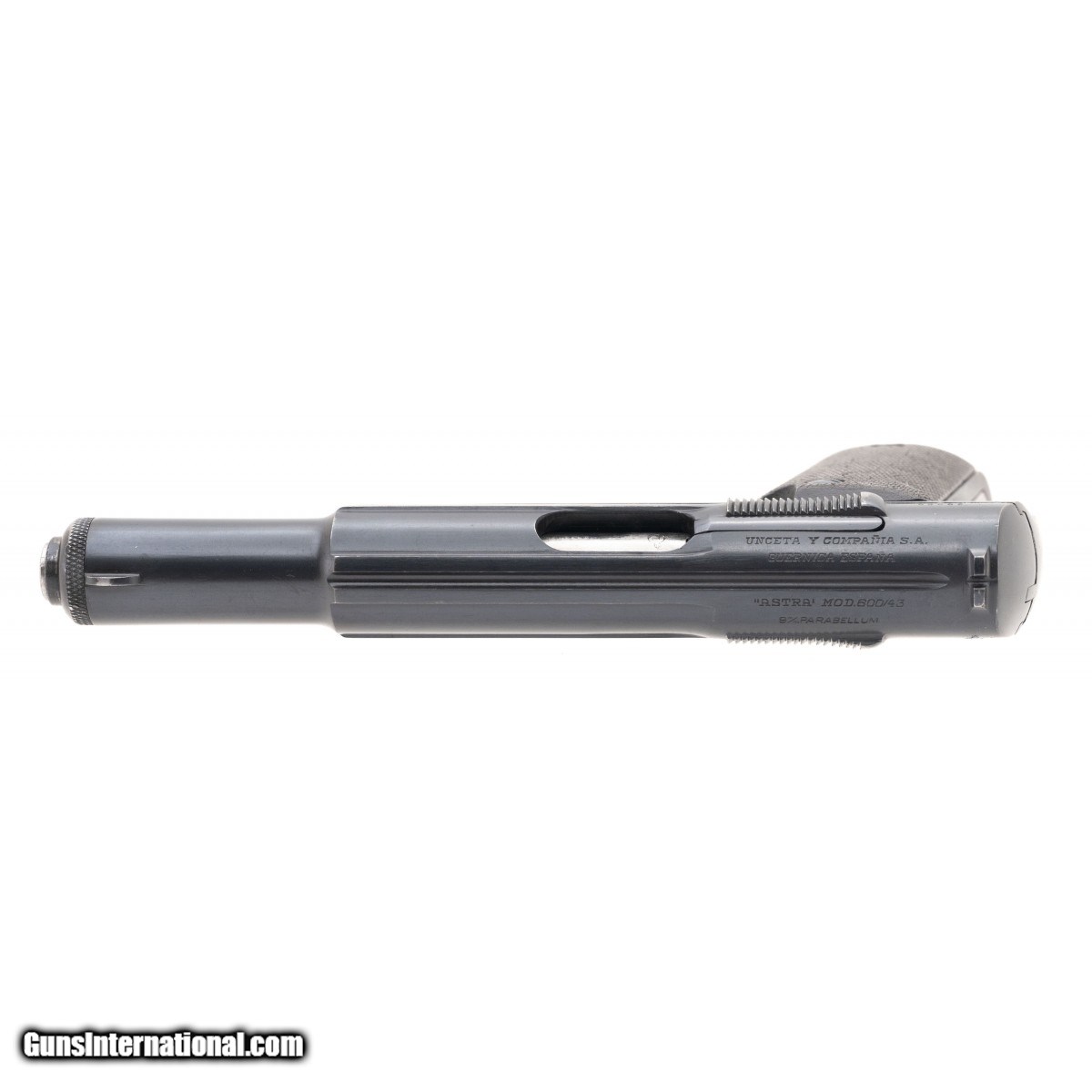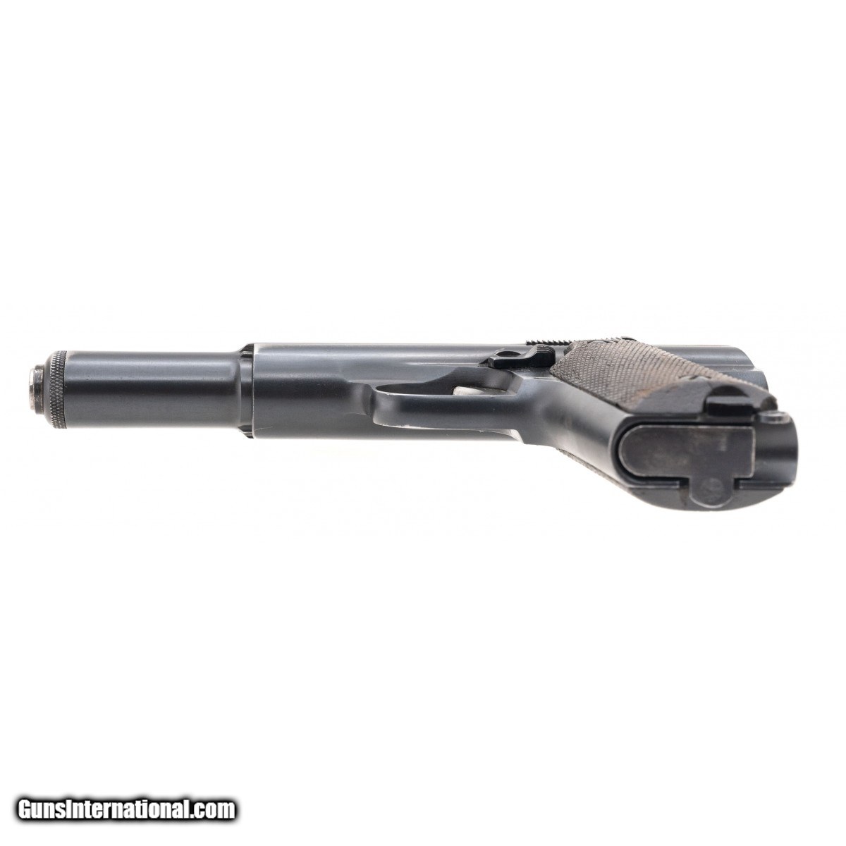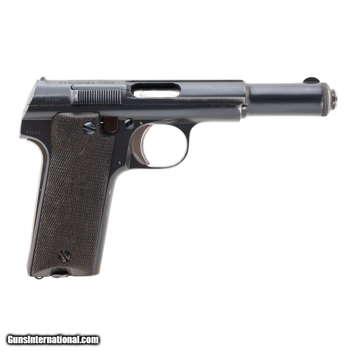 Description: " SN: 29058. Circa 1945. 9x19 parabellum with a 5.3"" barrel, bore is excellent. Spanish made handgun with approximately 95% original bluing, grip safety, fixed sights and checkered wood drips. Overall very good condition. SOLD |