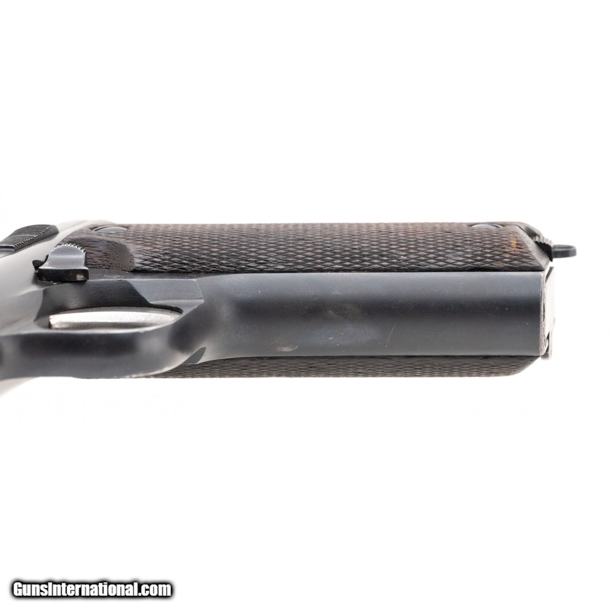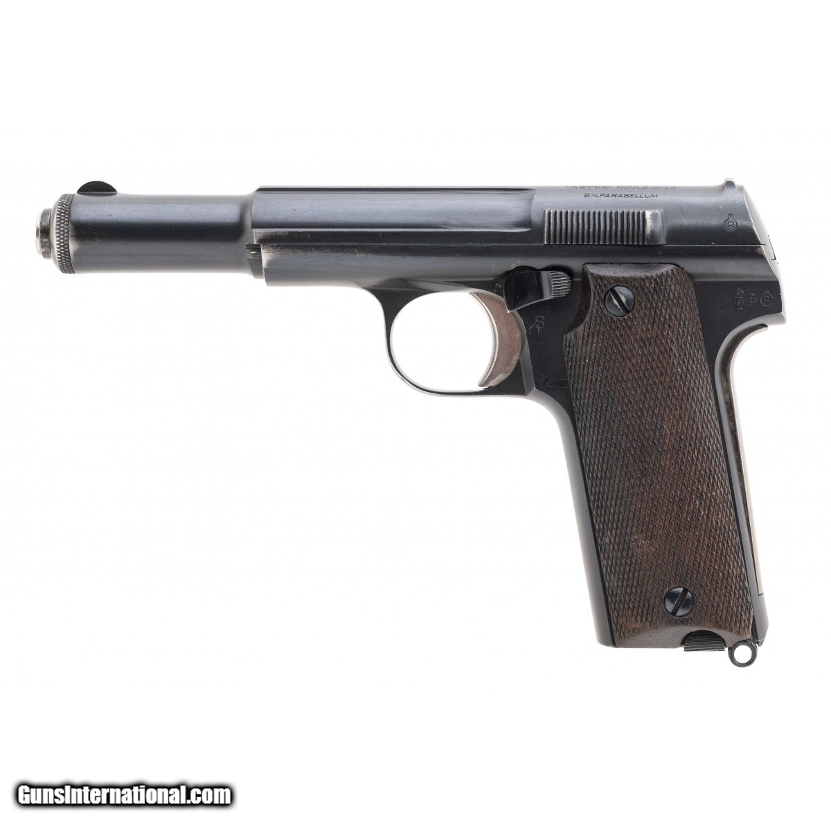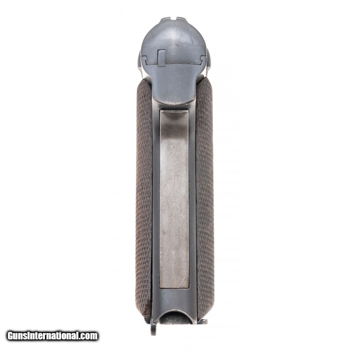 Description: " SN: 29058. Circa 1945. 9x19 parabellum with a 5.3"" barrel, bore is excellent. Spanish made handgun with approximately 95% original bluing, grip safety, fixed sights and checkered wood drips. Overall very good condition. SOLD |