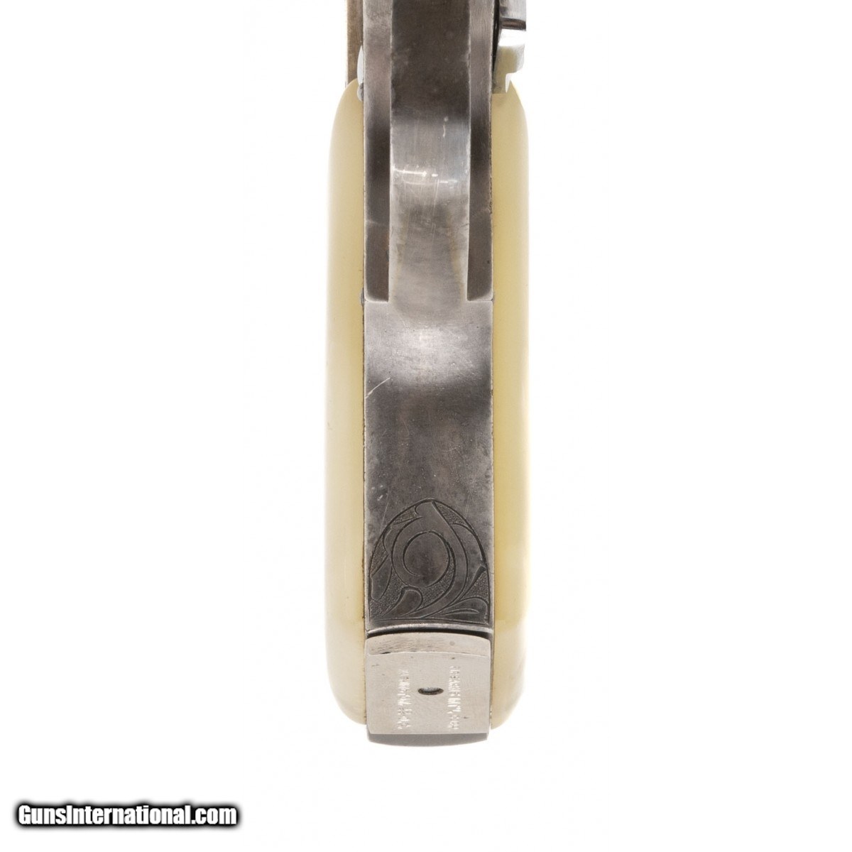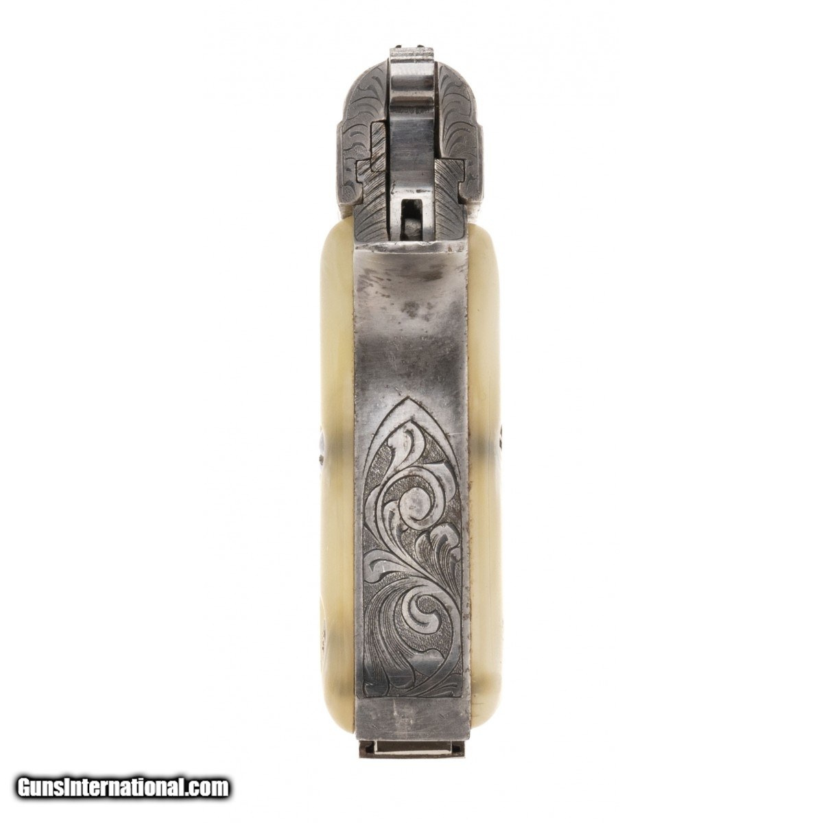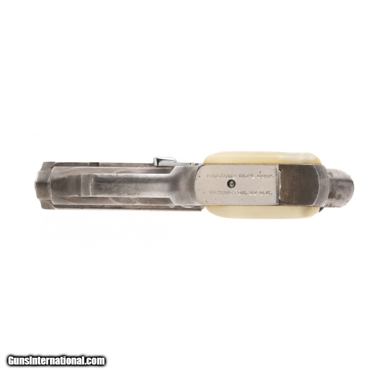 Description: " 1950's vintage pocket pistol, with scroll engraving, faux pearl grips and a silver plated finish. The finish has tarnished with age and we left it as is, but it would polish up bright and shiny easily. A pretty little gun, in very good condition. SOLD |