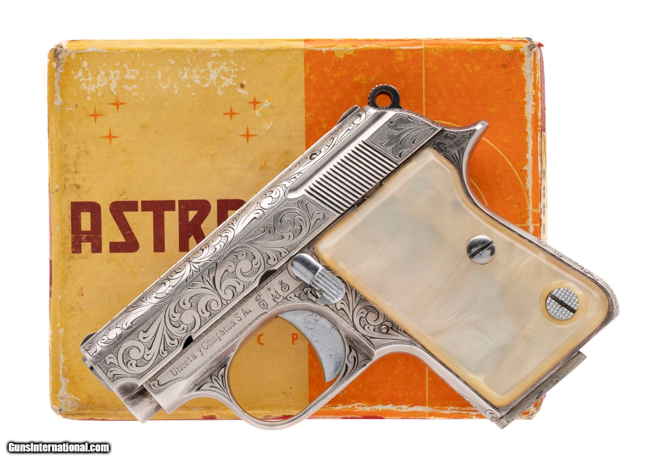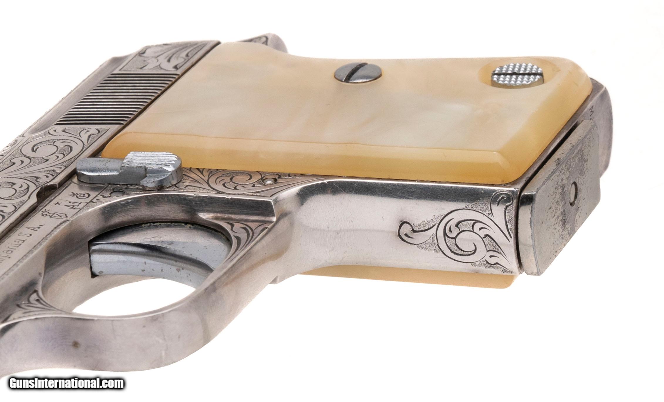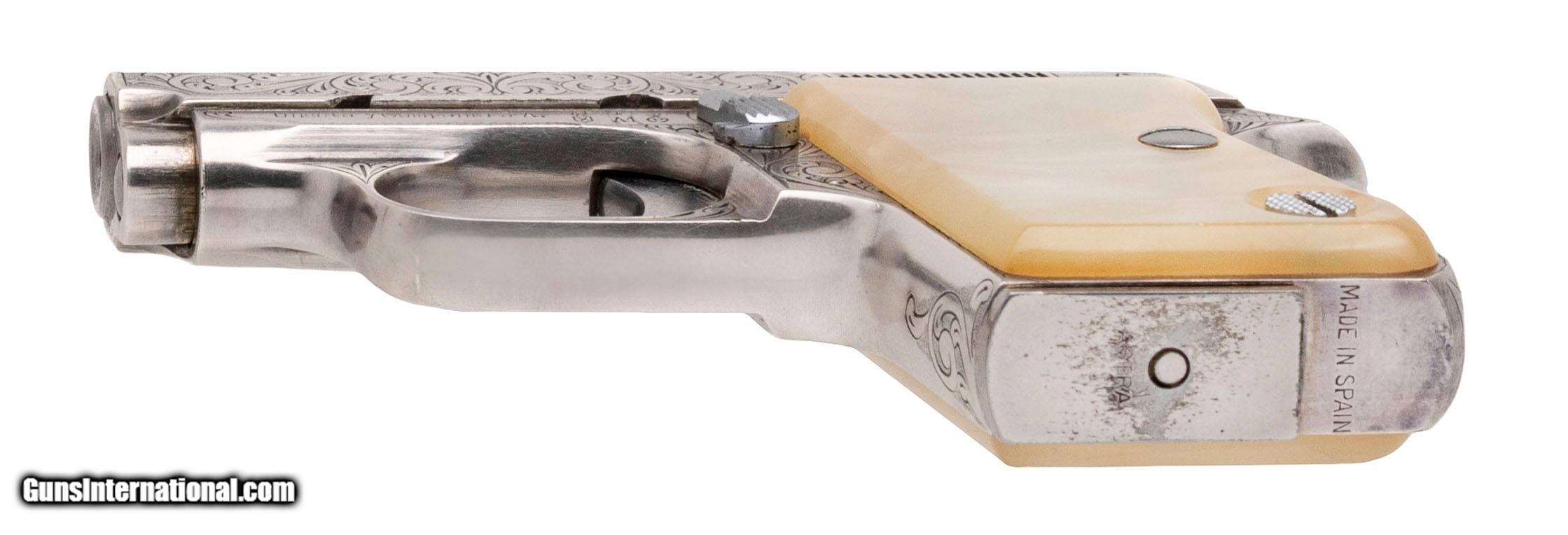 Description: "SN: 62435, made in Spain circa 1950's, factory engraved semi-auto 25 acp pocket pistol with a 2.25"" barrel and faux pearl grips. Overall in very good condition. Comes with a period box numbered 62360. Dallas location Price: $1,195.00 Contact Seller |