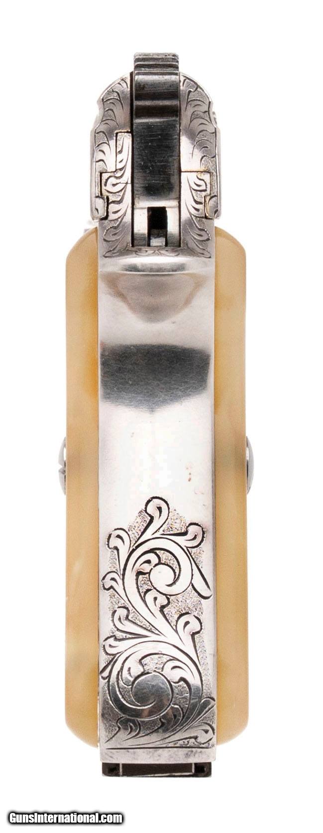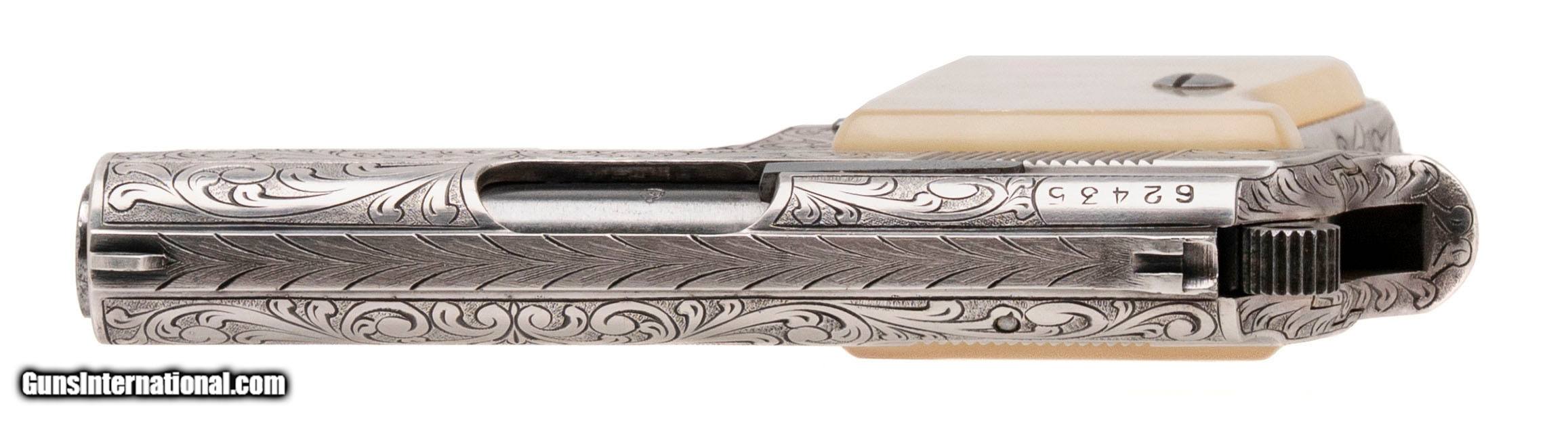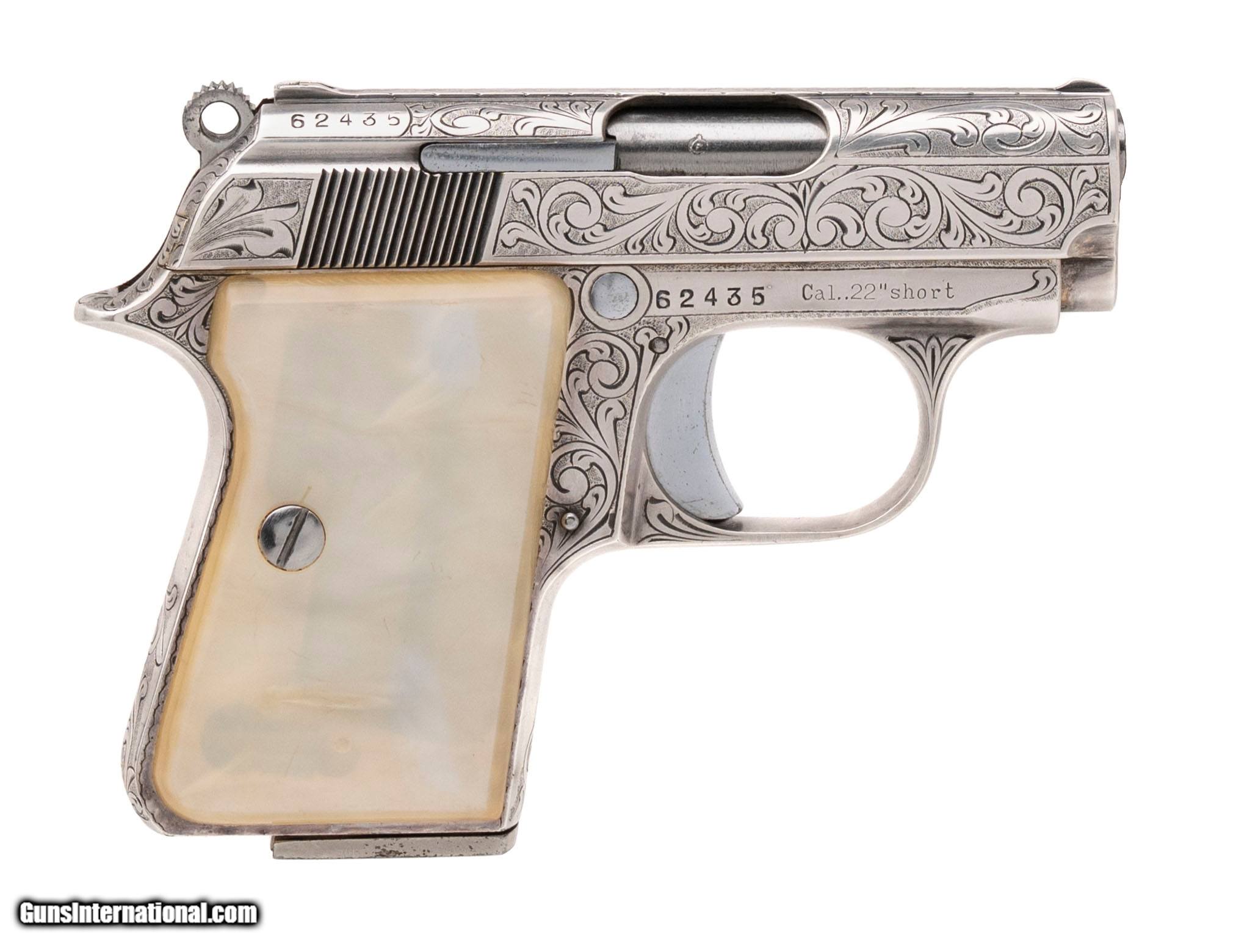 Description: "SN: 62435, made in Spain circa 1950's, factory engraved semi-auto 25 acp pocket pistol with a 2.25"" barrel and faux pearl grips. Overall in very good condition. Comes with a period box numbered 62360. Dallas location Price: $1,195.00 Contact Seller |