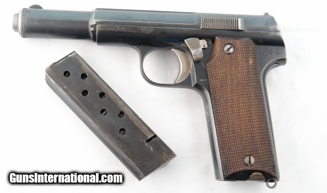 Description: 1945 ASTRA MODEL 600/43 OR 600 SEMI-AUTO 9MM LUGER CALIBER PISTOL. Serial number "571XX" and all matching. 9mm parabellum caliber(hence the "43" designation as was the change made at the request of the Germans during the War). A superior example with 95 to 97 percent of the original blue finish with balance just beginning to fade. Excellent factory wood grips with crisp checkering. Mint bore. All the original polish on the trigger and slide catch. Original "Astra" stamped magazine and one aftermarket one. Produced in 1945 with NO waffenamts so part of the batch not delivered and subsequently purchased by the Infamous Sam Cummings of InterArms for US export. Correct four line address on top of slide with NO "Made in Germany" nor Astra circle logo. SOLD Curio/Relic: Yes |