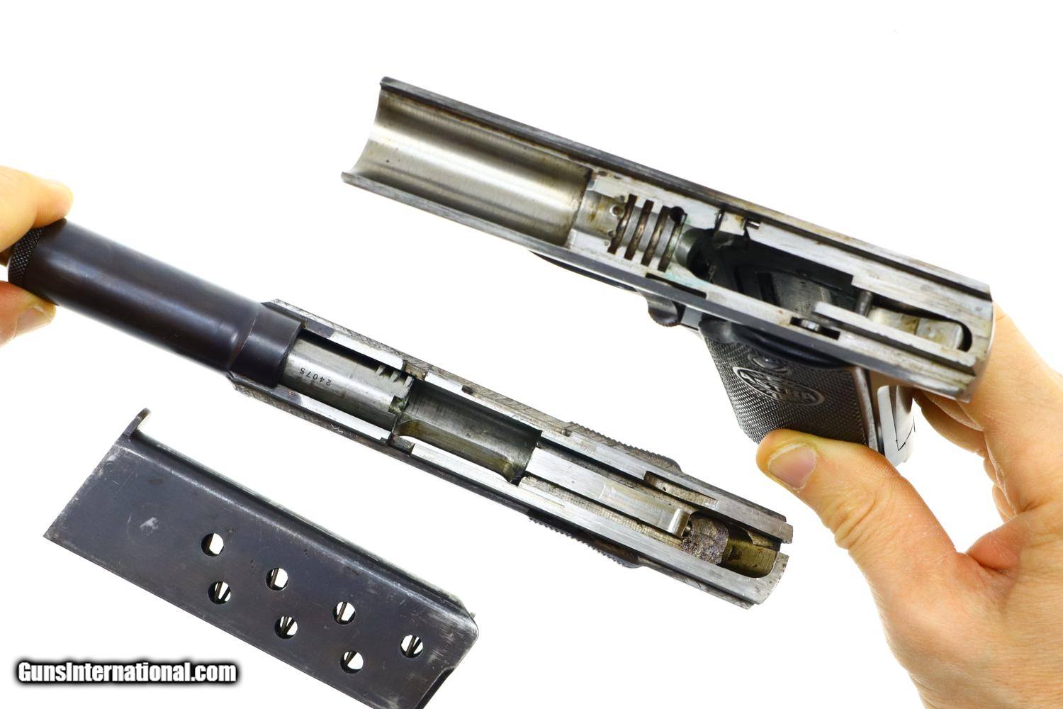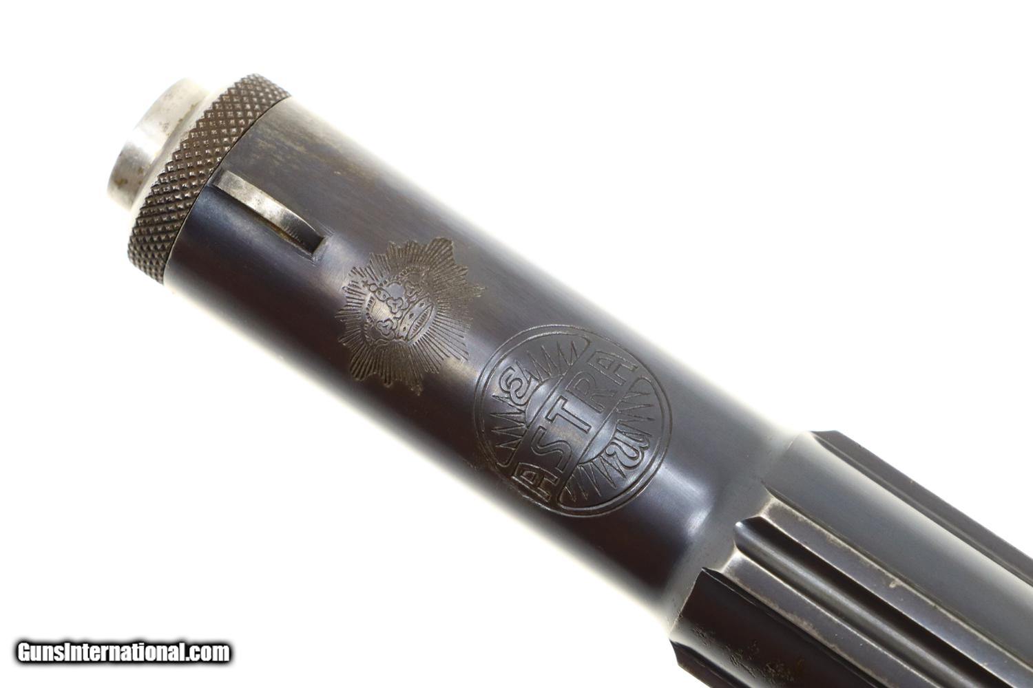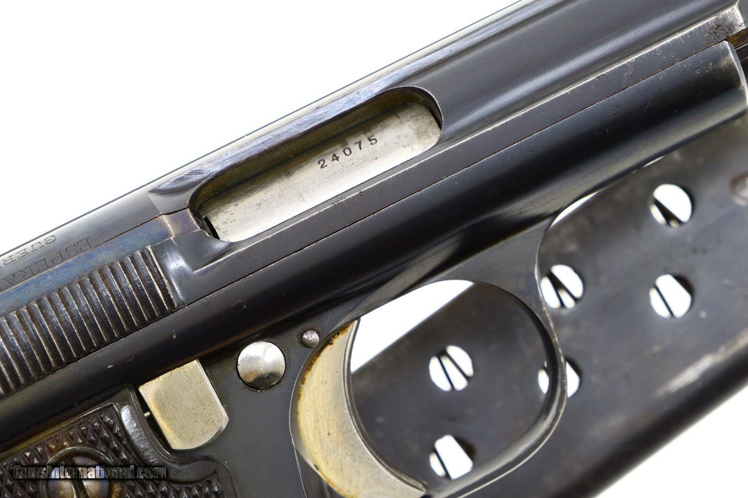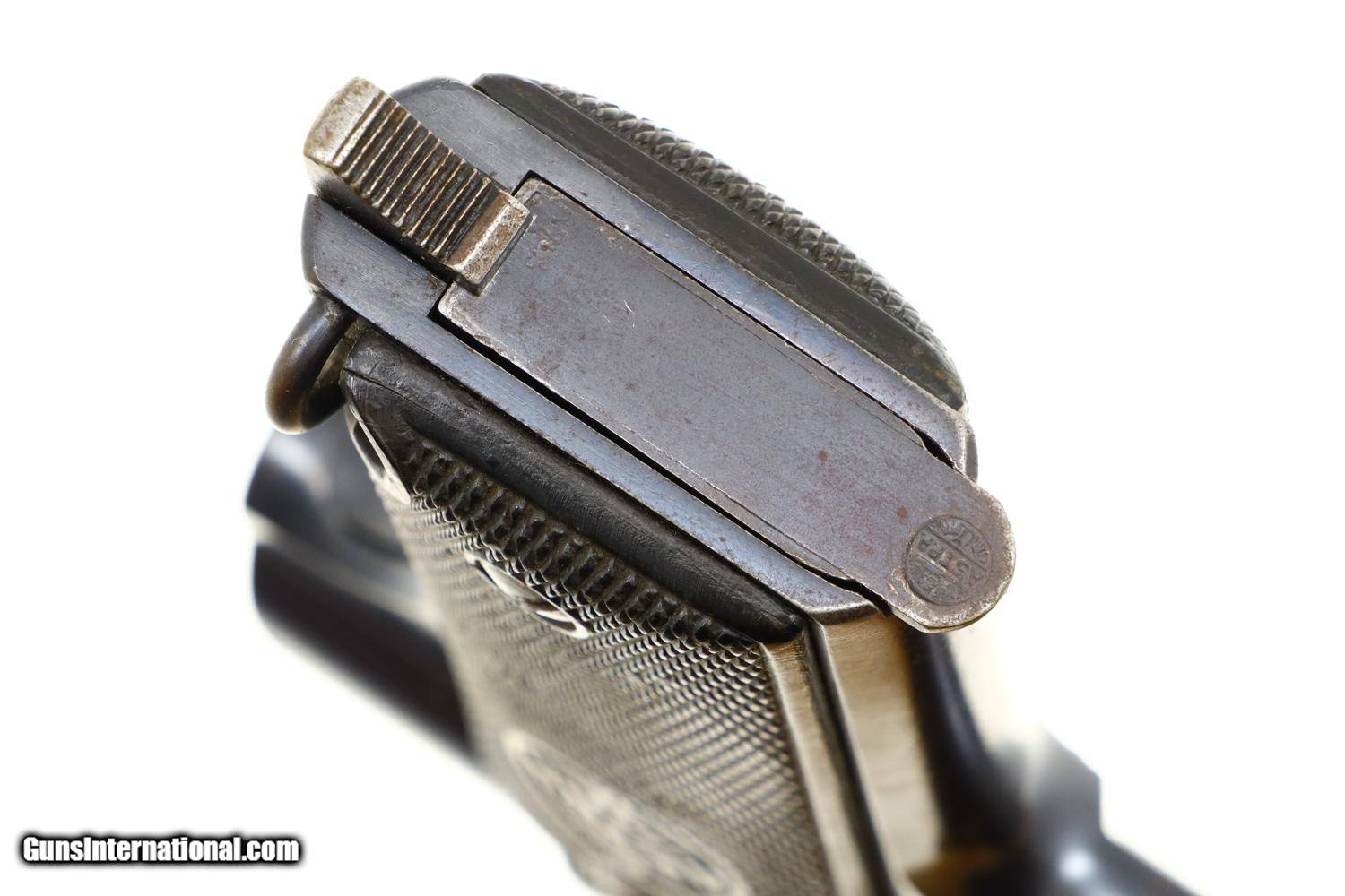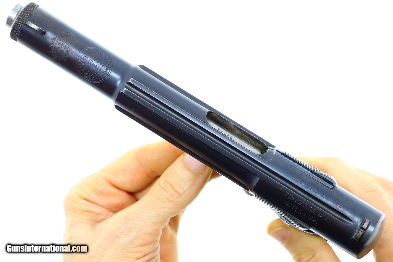 Description: Standard configuration M1921 (400) as made and marked for the Spanish Guardia Civil, with its large, iconic crest on the slide above the usual Astra E/U logo. Shipped as part of a lot of 300 guns to the Guardia Civil in Madrid on 30 August 1924. Other markings as typical for the Astra 400 pistols with matching serial numbers on the slide, frame and barrel. Later marked "SPAIN" when exported. Fitted with the early Astra E/U hard rubber grips and comparably marked magazine with 7 indicator holes and a fixed floorplate. Synopsis: Astra 1921 (400) Spanish Guardia Civil of Madrid, matching Condition: VG original finish with holster wear as one would expect from a military/police pistol that has seen light/moderate use. Comparable condition grips and magazine. Bright bore with sharp rifling. Perfect manual mechanics. An iconic and matching Spanish military/police pistol, this one shipped to Madrid in 1924, marked with the unmistakable Guardia Civil crest. ~~Insured shipping fee of $45; most packages shipped using FedEx 2nd Day.~~ SOLD Curio/Relic: Yes Manufacturer: Astra Serial Number: 24075 Caliber Info: 9mmL |