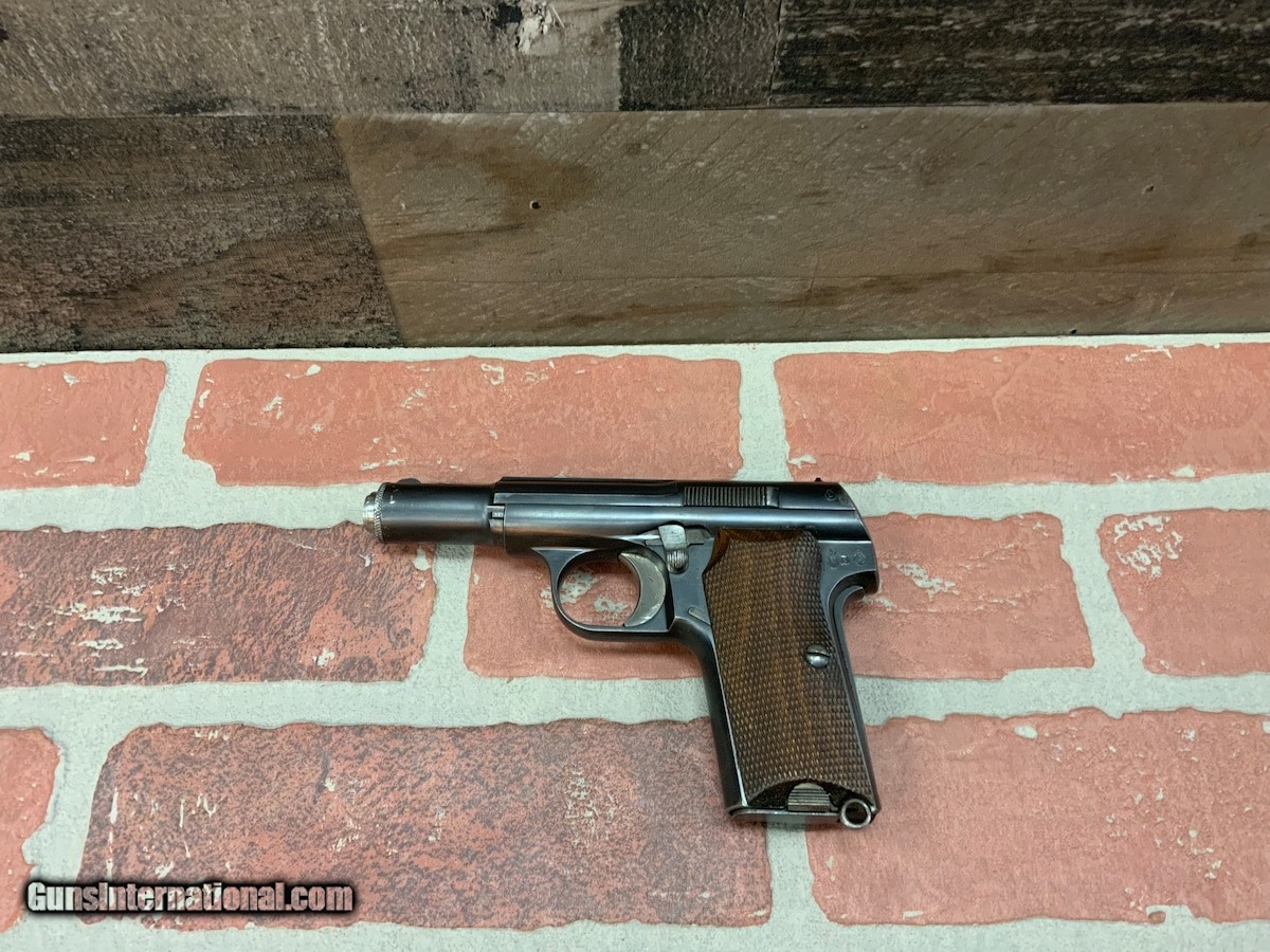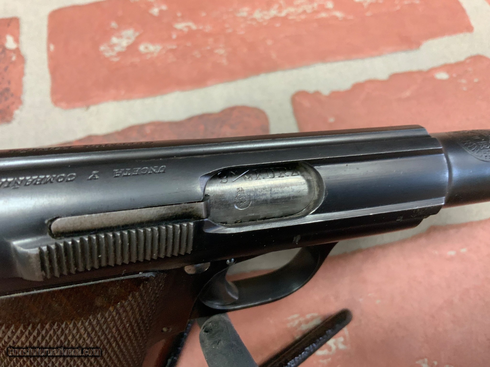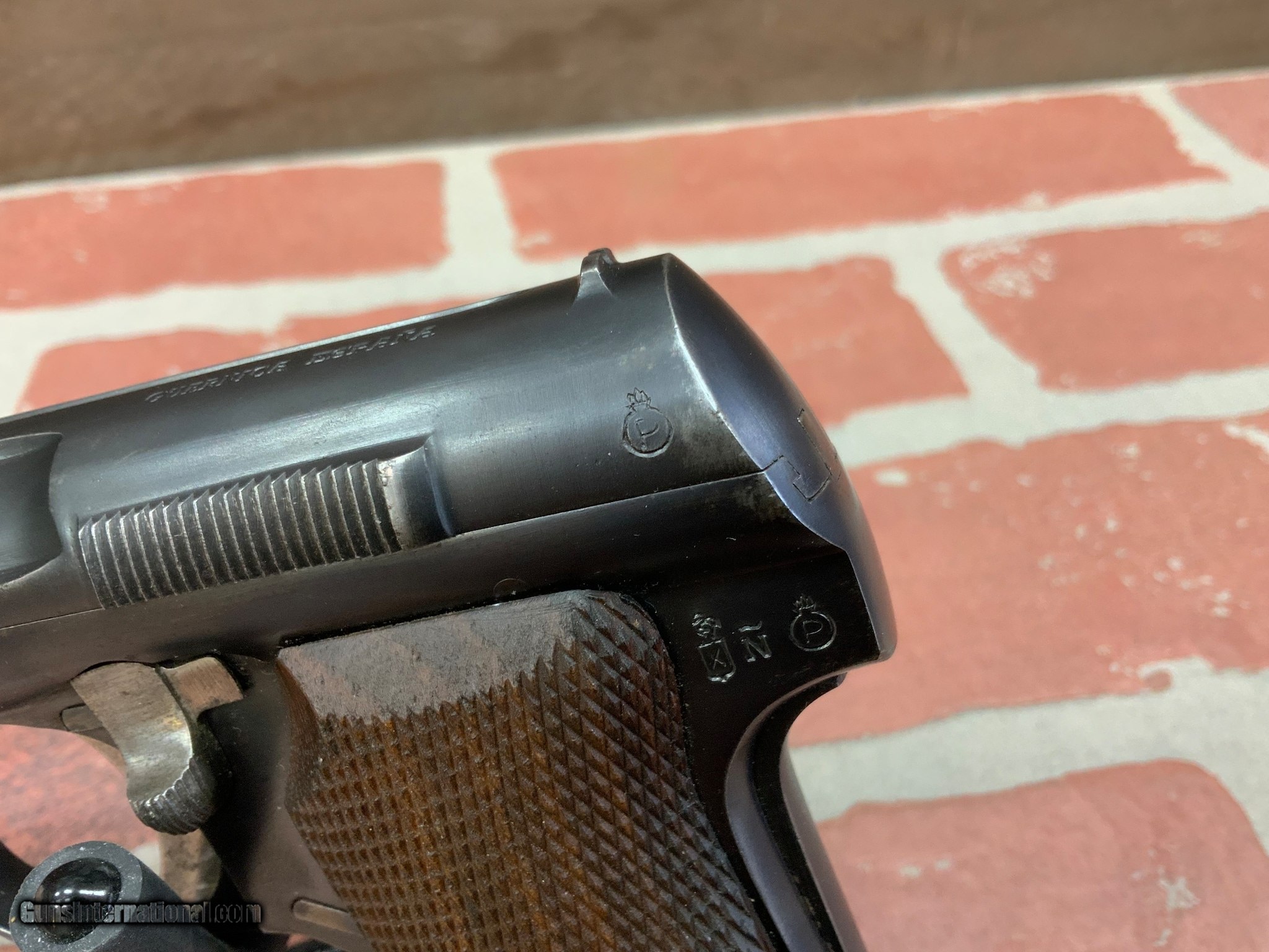 Description: Guns Listing ID: 499083 Here is a hard to find Spanish Astra model 300 chambered in .380 ACP used by German Army in WWII. This was made in 1943 and has correct German Army Acceptance E/WaA251. Matching numbers on frame and slide. With Astra magazine. SOLD Manufacturer: ASTRA Model: 300 Caliber Info: .380 ACP Condition: Used - Non-Certified Barrels: 4 BARREL Finish: BLUE |