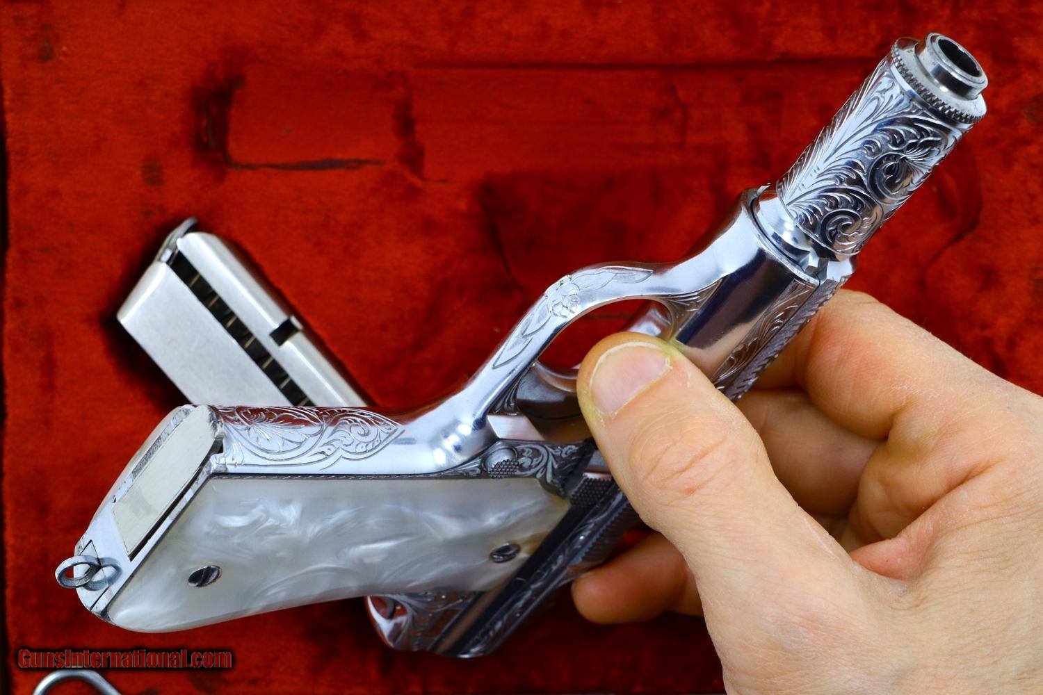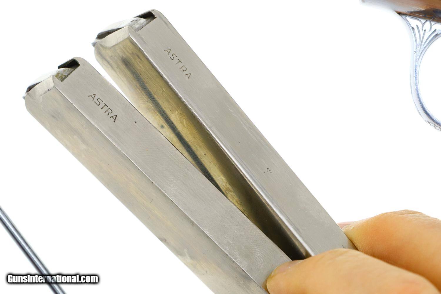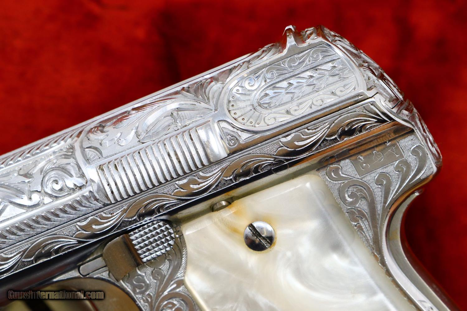 Description: Beautiful Astra 3003, made in 1953, with full factory engraving, especially deep over slide, with relocated factory markings as typically done for the most highly embelished pistols. As per standard production guns, it was completed with a fixed front and rear sight, mid frame rotating safety, grip safety, and magazine safety. Triad of Eibar markings on left tang with "Y" reflecting 1953, the automatic pistol proof repeated on the left side of the slide and the exposed barrel hood underneath the caliber. Full serial number on right tang. This was one of the 3003 level pistols that was chromed rather than silver plated. Fitted with smooth pearlite grips and magazines, correspondingly plated, each marked with the word "ASTRA" at the top of the spine. Accompanied by correct chrome plated cleaning rod and custom form fitted presentation case. Synopsis: Fabulous Astra 3003 deep factory engraved, chromed, circa 1953, nearly new in custom presentation case Condition: 99% original chrome finish over luxurious engraving, a few small spots of flaking only visible on careful inspection. Comparable condition grips. Magazines with minor insertional wear. Mirror bright bore with sharp rifling. Excellent carrying case as custom made for the pistol spare magazine and cleaning rod. A stunning ensemble sure to please the most advanced collector. ~~Insured shipping fee of $65; most packages shipped using FedEx 2nd Day.~~ SOLD Manufacturer: Astra Serial Number: 716032 Caliber Info: .380ACP |