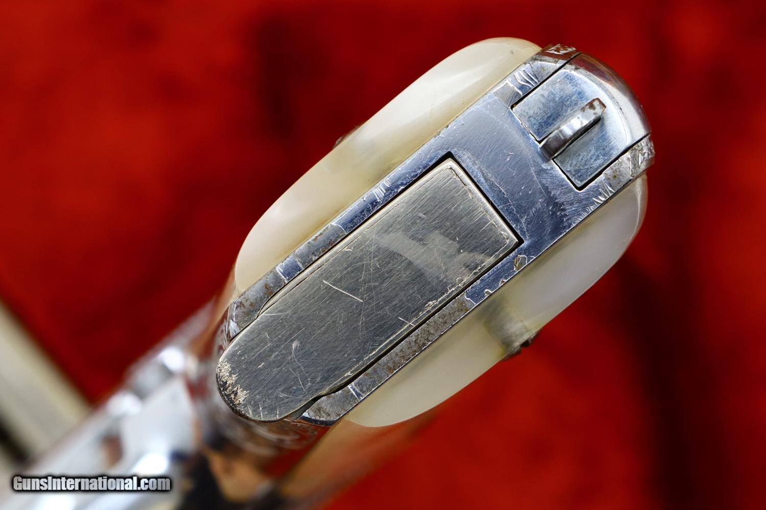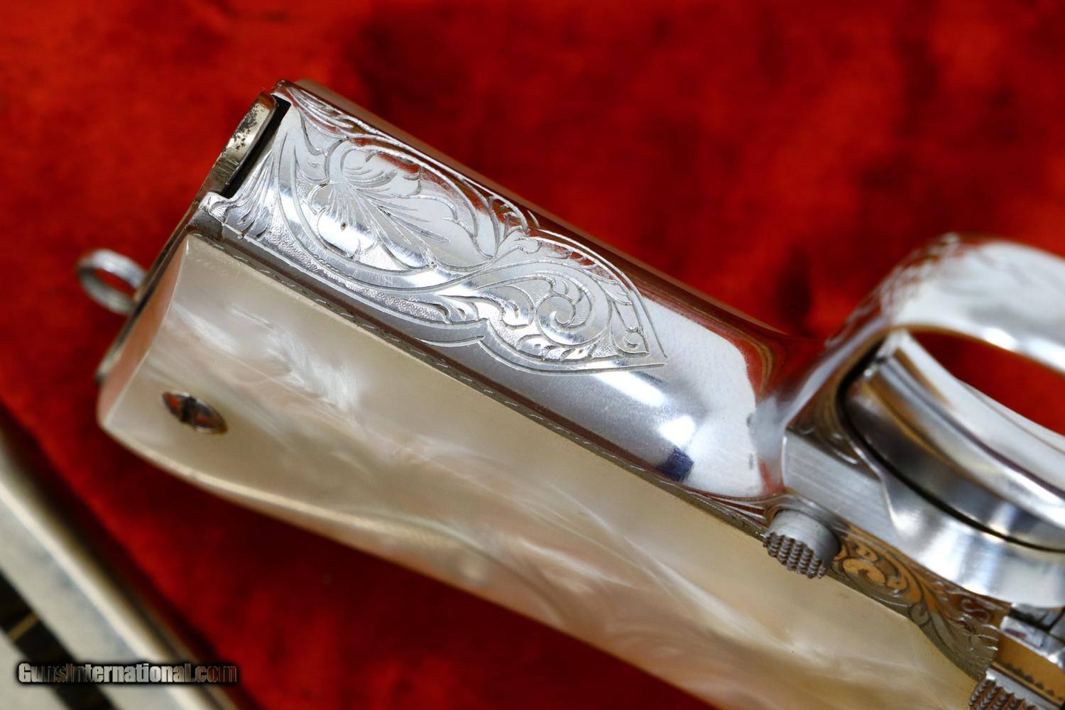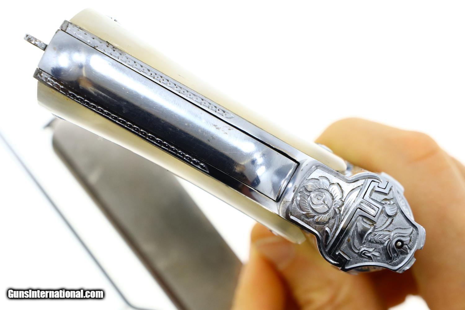 Description: Beautiful Astra 3003, made in 1953, with full factory engraving, especially deep over slide, with relocated factory markings as typically done for the most highly embelished pistols. As per standard production guns, it was completed with a fixed front and rear sight, mid frame rotating safety, grip safety, and magazine safety. Triad of Eibar markings on left tang with "Y" reflecting 1953, the automatic pistol proof repeated on the left side of the slide and the exposed barrel hood underneath the caliber. Full serial number on right tang. This was one of the 3003 level pistols that was chromed rather than silver plated. Fitted with smooth pearlite grips and magazines, correspondingly plated, each marked with the word "ASTRA" at the top of the spine. Accompanied by correct chrome plated cleaning rod and custom form fitted presentation case. Synopsis: Fabulous Astra 3003 deep factory engraved, chromed, circa 1953, nearly new in custom presentation case Condition: 99% original chrome finish over luxurious engraving, a few small spots of flaking only visible on careful inspection. Comparable condition grips. Magazines with minor insertional wear. Mirror bright bore with sharp rifling. Excellent carrying case as custom made for the pistol spare magazine and cleaning rod. A stunning ensemble sure to please the most advanced collector. ~~Insured shipping fee of $65; most packages shipped using FedEx 2nd Day.~~ SOLD Manufacturer: Astra Serial Number: 716032 Caliber Info: .380ACP |