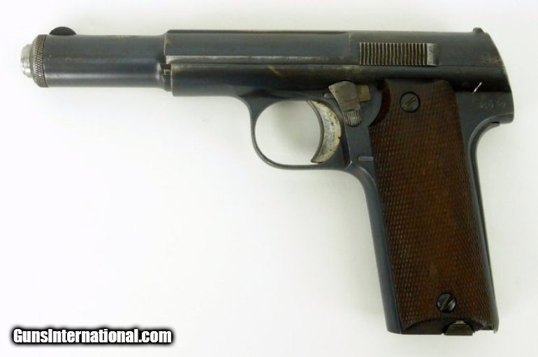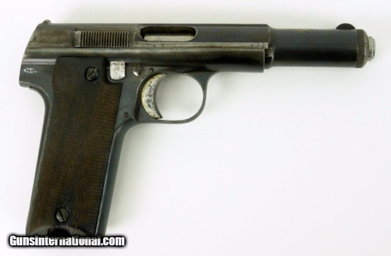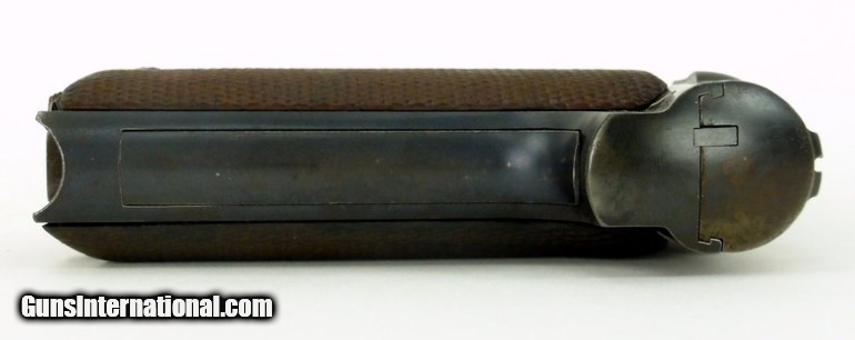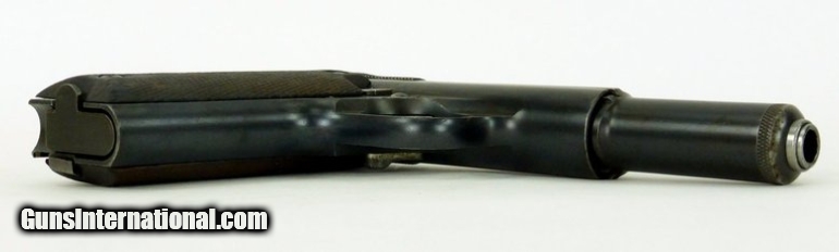 Description: " Astra 600 9mm Luger caliber pistol. WWII German issue, marked W. a. A D20 on the right tang. Matching serial numbers. Gun is missing the lanyard ring. The bore has strong rifling and shows frosting in the grooves. About 85% finish with patina and some etching. Good condition. SOLD |