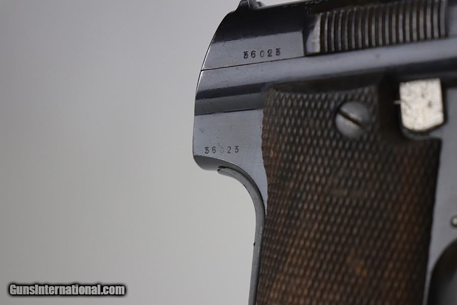 Description: This is a very nice example of an Astra 600 that was ordered by the German military in 1943. It was never actually delivered and has no German military proofs, often referred to as the "second contract". It is all matching and has the proper Spanish proofs. This one also has an "LBPN" marking on the front strap, indicating it was then issued to the West German police force after WW2. It comes with a nice 1944-dated holster, one un-numbered magazine, and one matching magazine, numbered at the police arsenal. The gun has excellent wood grips and has retained about 95% of its finish. Most of the wear is splotchy on the right side of the gun. There is also very minor wear along the high edges and an area of wear on the front strap. Spotty oxidation here and there and freckling on the straps. Excellent bore - shiny with strong rifling. SOLD Curio/Relic: Yes Handgun Caliber: 9x19mm Parabellum (9mm Luger, 9x19mm NATO) Manufacturer: Astra Bore: 9/10 Condition: ~95% |