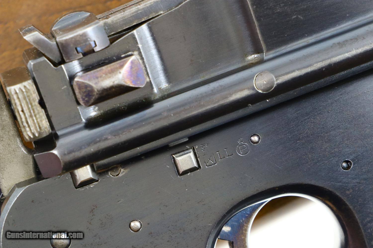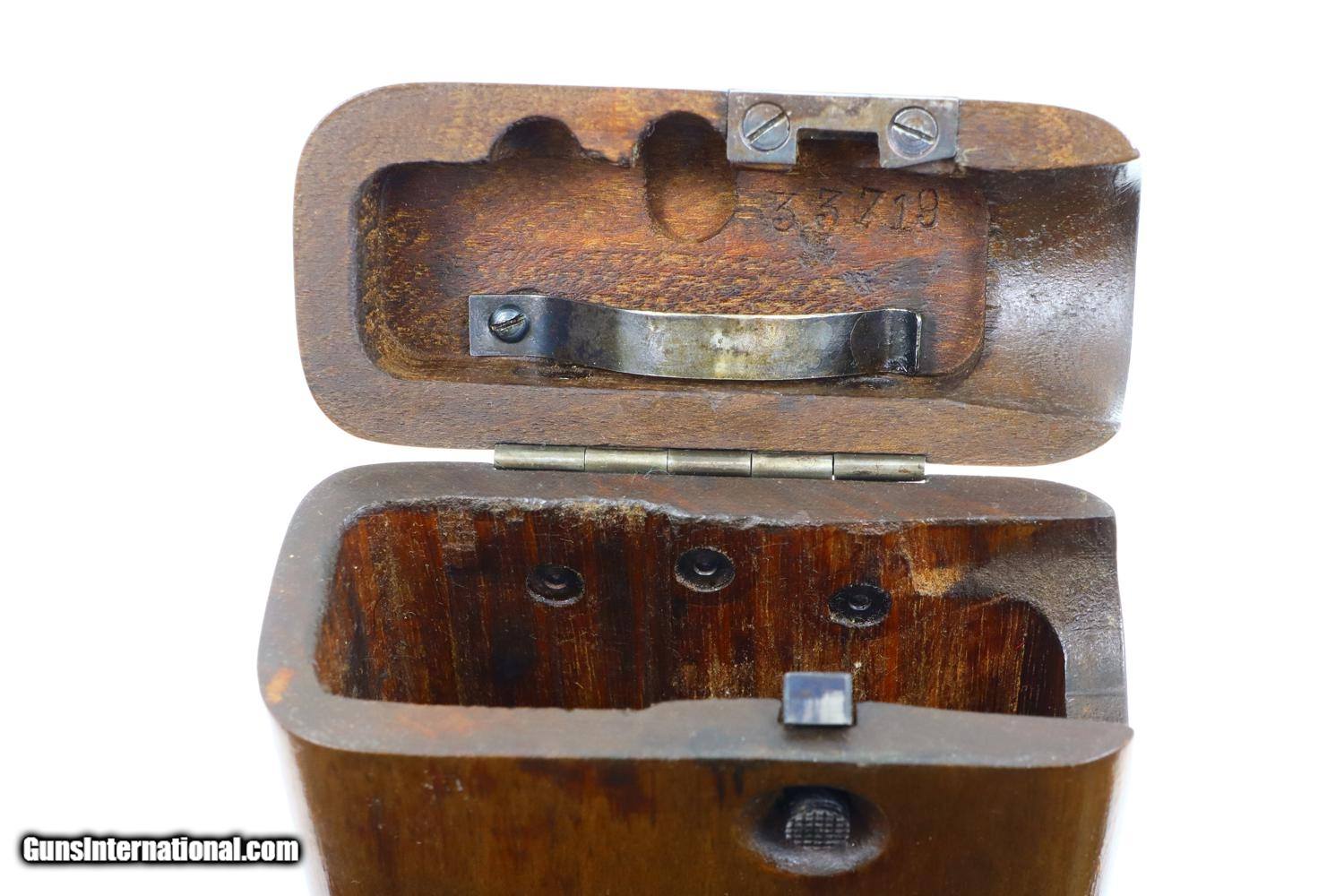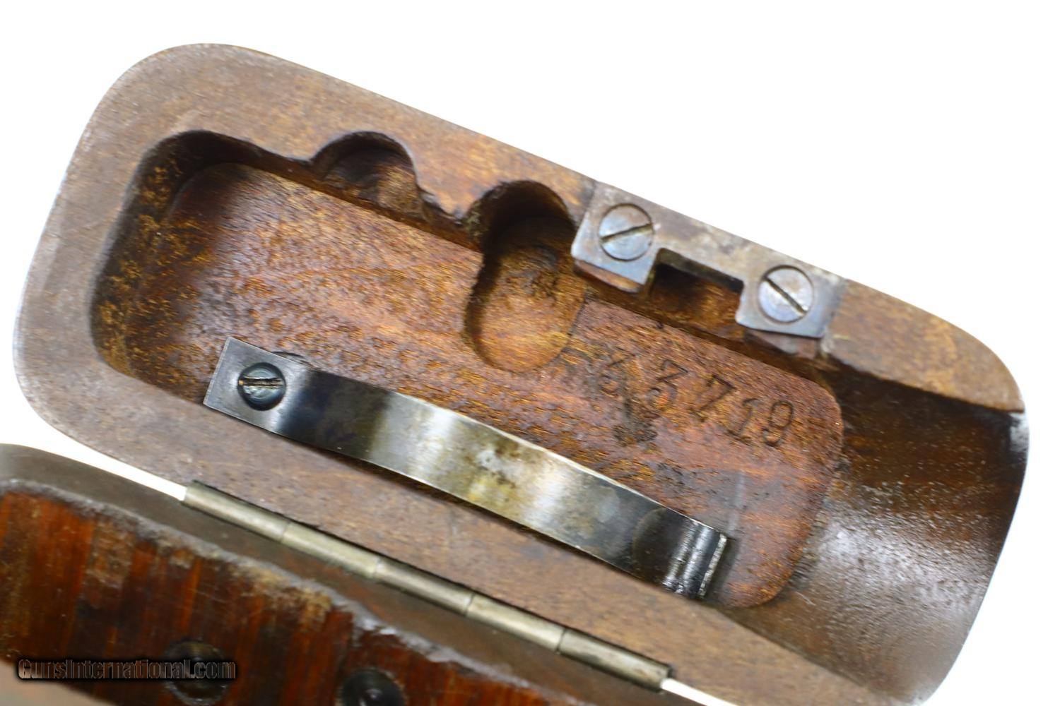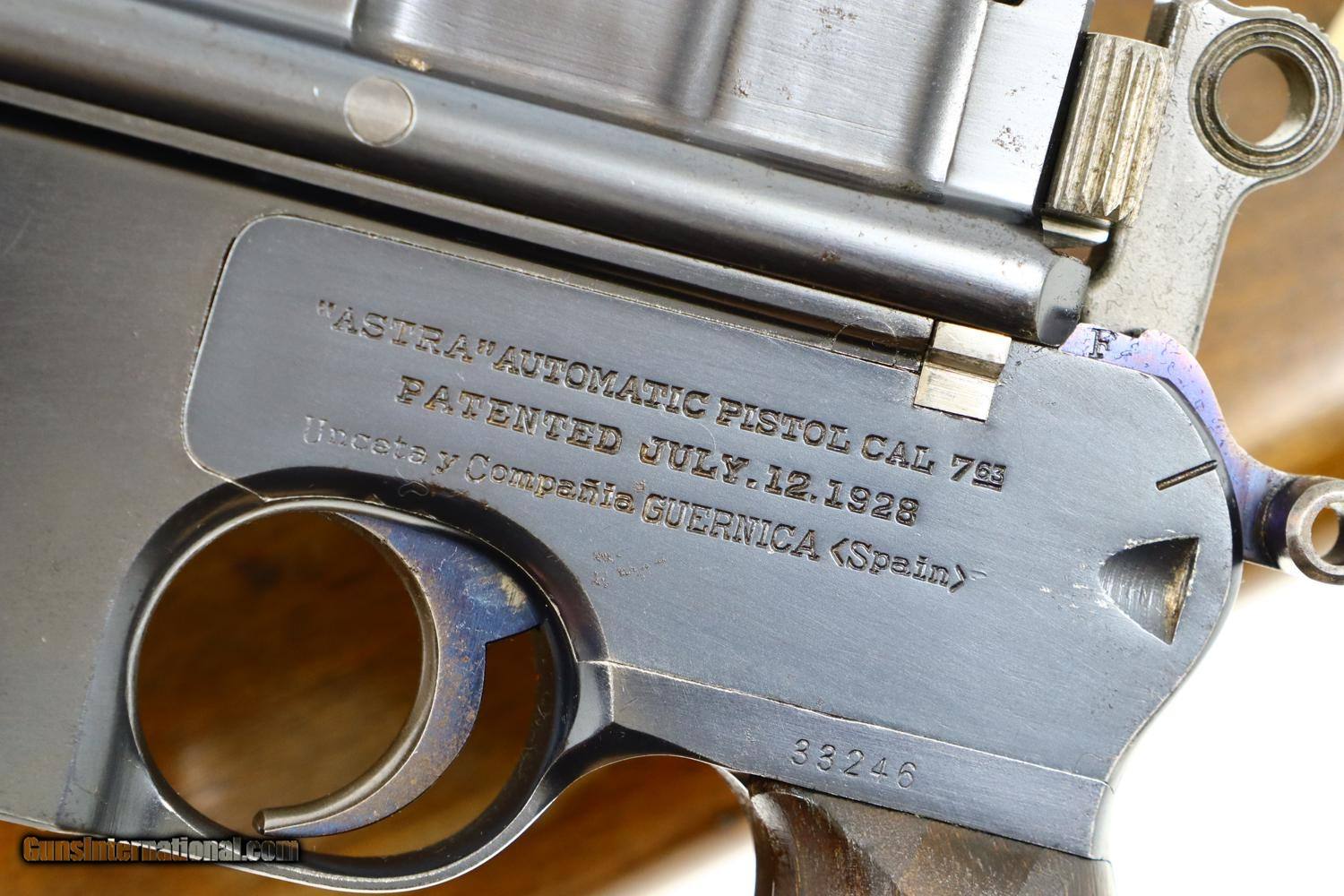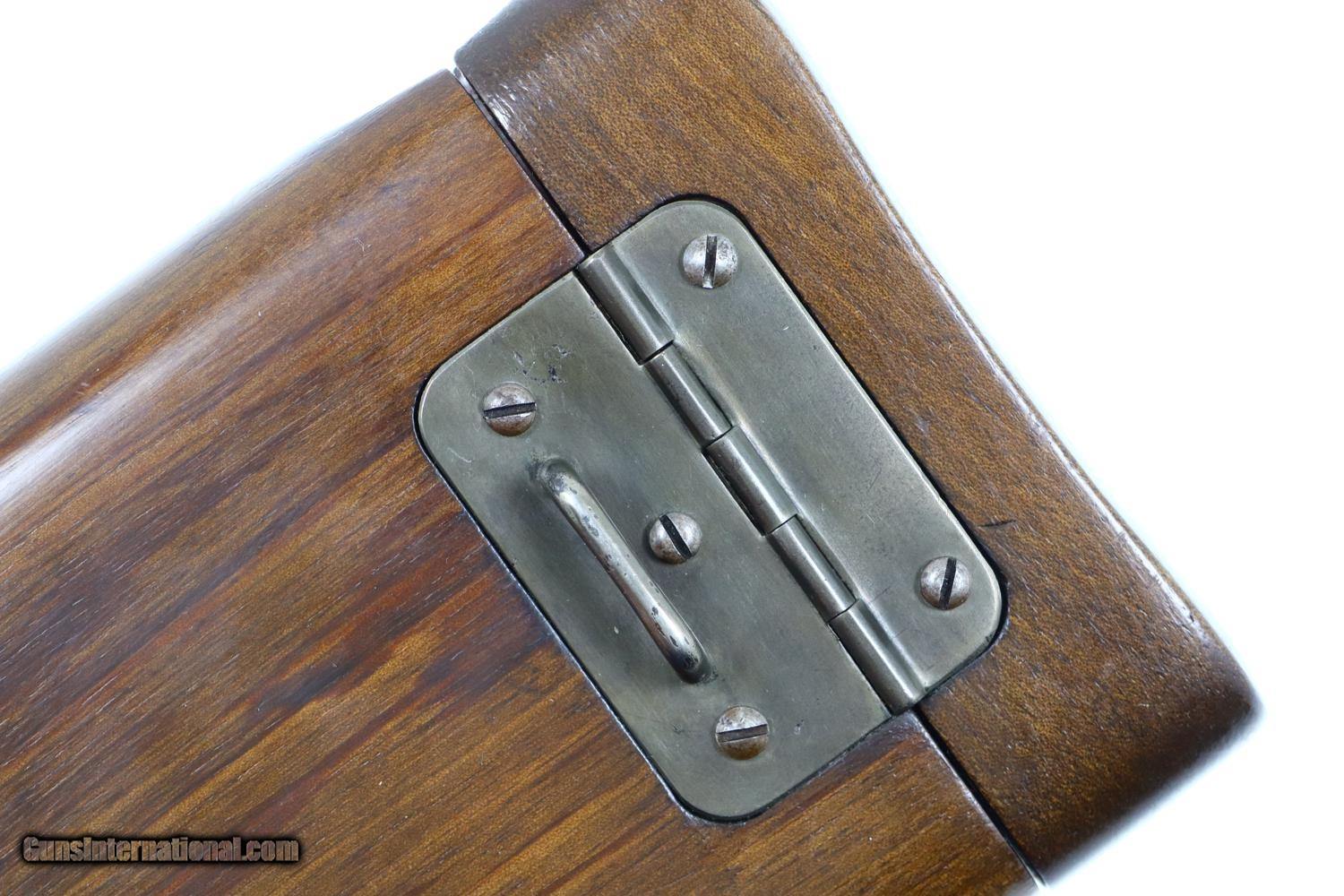 Description: Synopsis: Scarce Astra 900 Broomhandle shipped to German Army in Southern France, WWII, correct stock, 33246 Description: Standard configuration, late production Astra M900, shipped to German Army in Southern France in the late serial range 32788-33774 with correct stock, mismatched, but in the same serial range. A total of 1050 such ensembles were delivered to the Nazis during WWII. Pistol has 5.5 inch screw-in barrel and slip-in tangent rear sight graduated from 50-1000. Short extractor and two lug firing pin. Large ring hammer and full frame. Sideplate with caliber, patent date 1928 and company location in Guernica, Spain. Full serial number on frame above grip. Right side marked with the automatic pistol proof on barrel, receiver, and right side of frame whose markings include the Eibar house proof and a year code "LL" reflecting production in 1940. Serrated wood panels. No lanyard ring. Major parts rust blued; most small parts fire blued; bolt, hammer, and small transverse bolts in the white. Disassembly shows all-matching components. Complete with Astra M900 stock #33719, matching lid and lug. Fits well to pistol with minimal wobble. Condition: VG+ with sharp edge wear and scattered superficial freckling, especially on front of mag well and front/backstrap. Oil darkened grips. Near mirror bore. Perfect manual mechanics. VG Astra stock, revarnished but not sanded, with faded hardware as photographed. ~~Insured shipping fee of $155; most packages shipped using FedEx 2nd Day.~~ SOLD Manufacturer: Astra Serial Number: 33246 Caliber Info: 7.63mm |