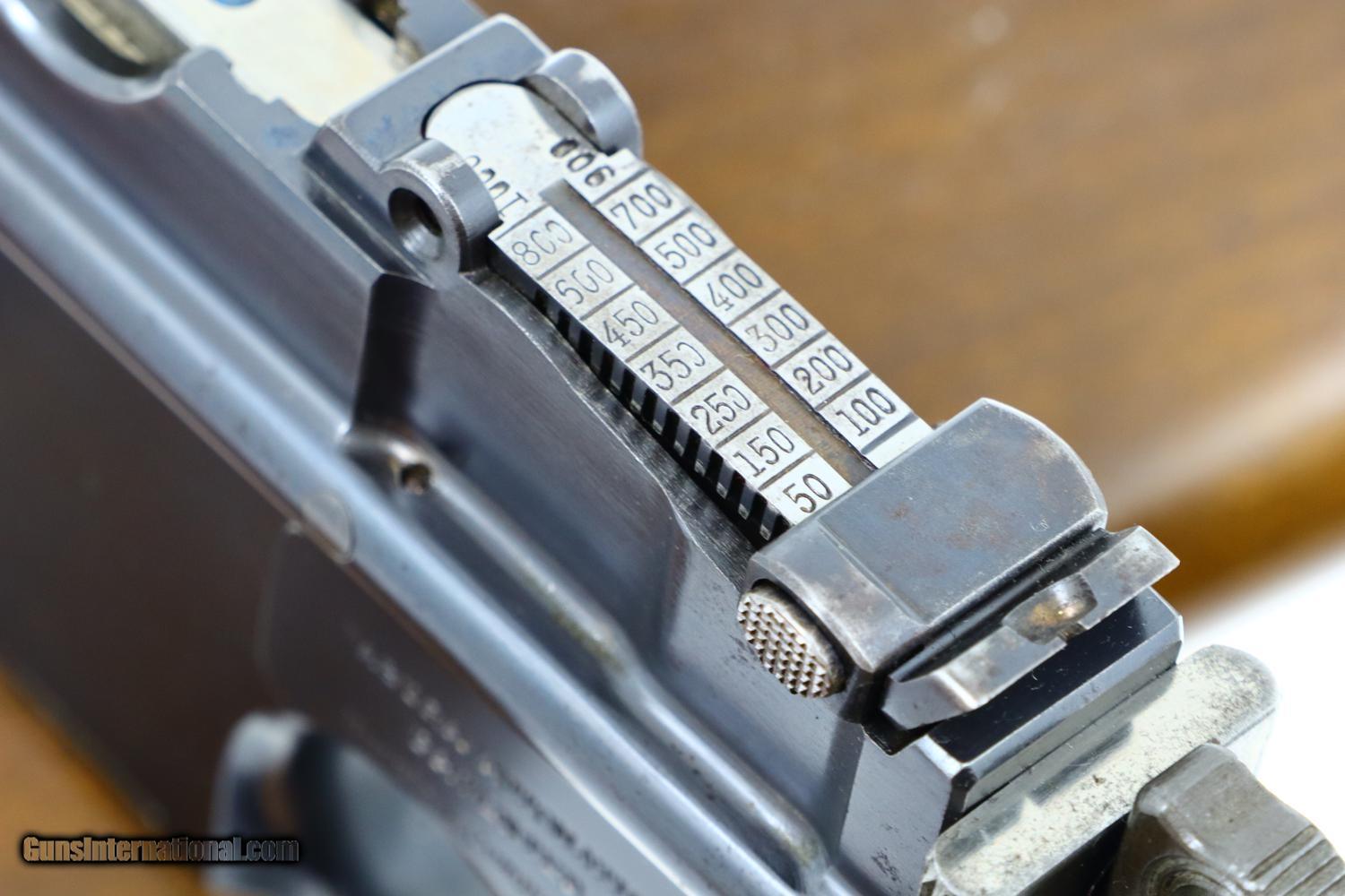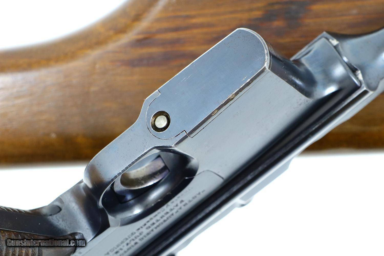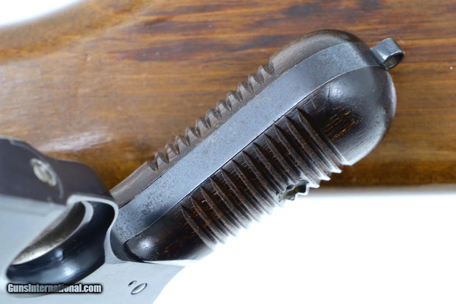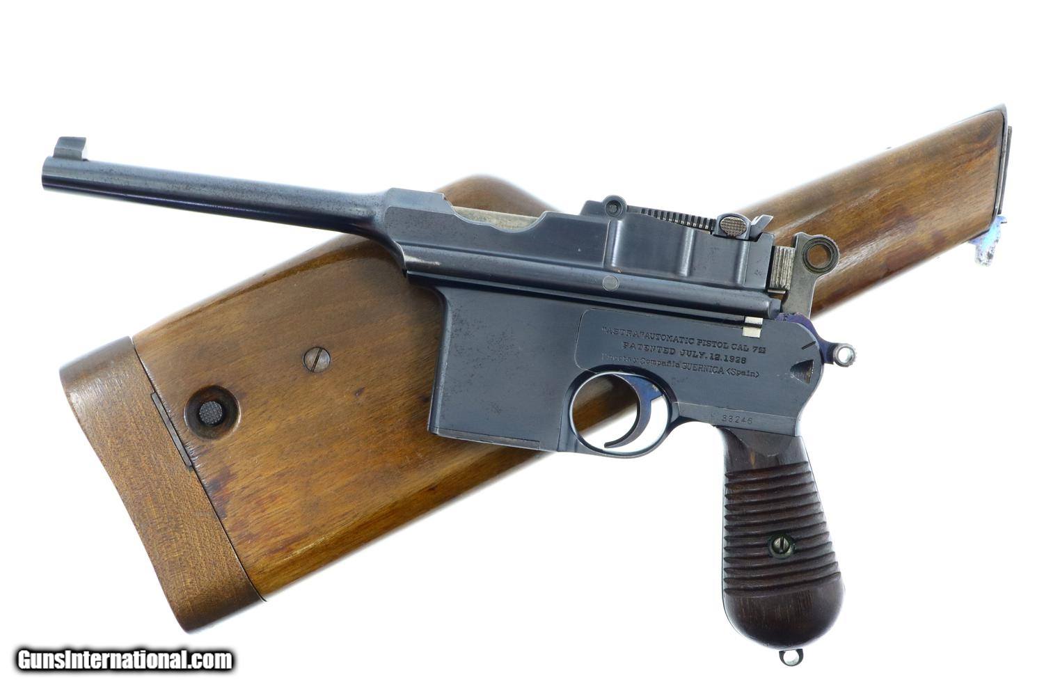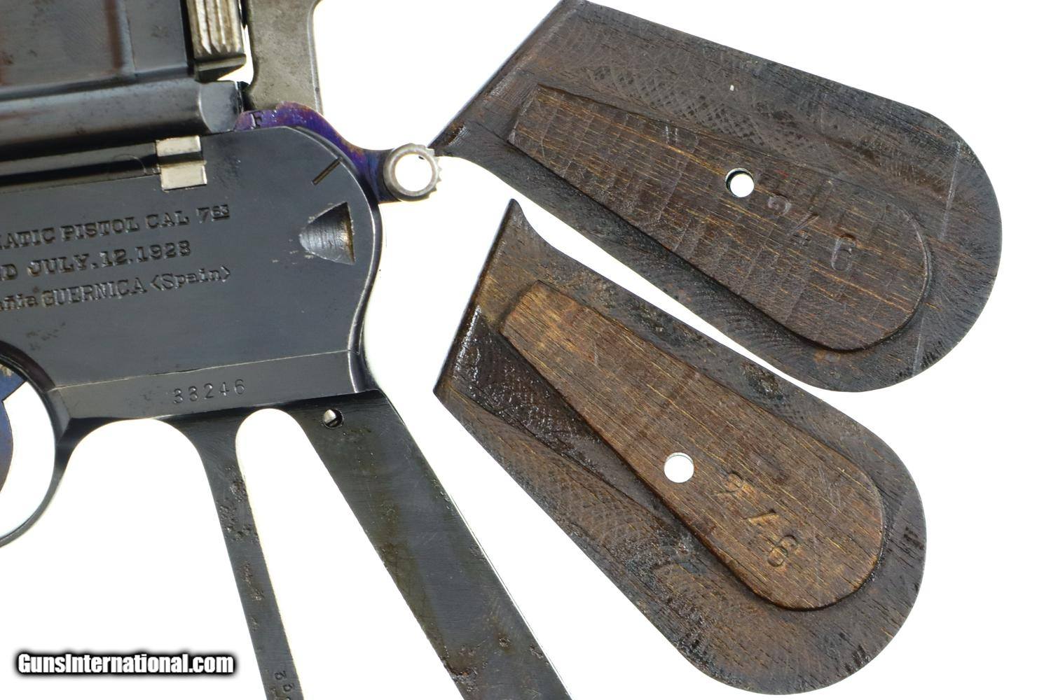Description: Synopsis: Scarce Astra 900 Broomhandle shipped to German Army in Southern France, WWII, correct stock, 33246 Description: Standard configuration, late production Astra M900, shipped to German Army in Southern France in the late serial range 32788-33774 with correct stock, mismatched, but in the same serial range. A total of 1050 such ensembles were delivered to the Nazis during WWII. Pistol has 5.5 inch screw-in barrel and slip-in tangent rear sight graduated from 50-1000. Short extractor and two lug firing pin. Large ring hammer and full frame. Sideplate with caliber, patent date 1928 and company location in Guernica, Spain. Full serial number on frame above grip. Right side marked with the automatic pistol proof on barrel, receiver, and right side of frame whose markings include the Eibar house proof and a year code "LL" reflecting production in 1940. Serrated wood panels. No lanyard ring. Major parts rust blued; most small parts fire blued; bolt, hammer, and small transverse bolts in the white. Disassembly shows all-matching components. Complete with Astra M900 stock #33719, matching lid and lug. Fits well to pistol with minimal wobble. Condition: VG+ with sharp edge wear and scattered superficial freckling, especially on front of mag well and front/backstrap. Oil darkened grips. Near mirror bore. Perfect manual mechanics. VG Astra stock, revarnished but not sanded, with faded hardware as photographed. ~~Insured shipping fee of $155; most packages shipped using FedEx 2nd Day.~~ SOLD Manufacturer: Astra Serial Number: 33246 Caliber Info: 7.63mm |