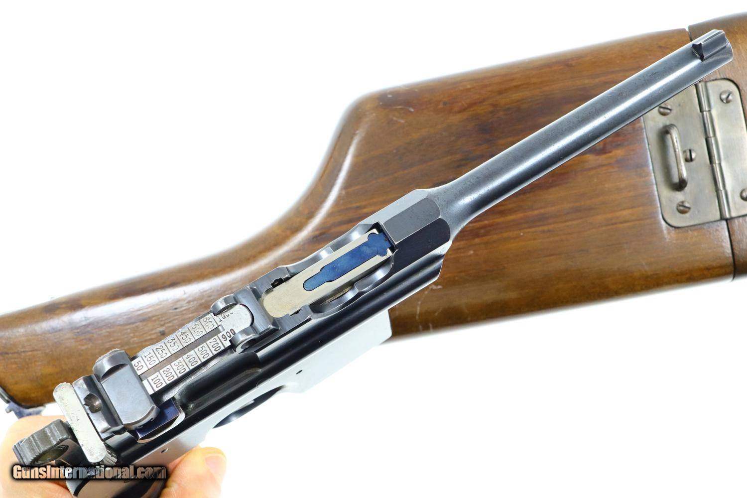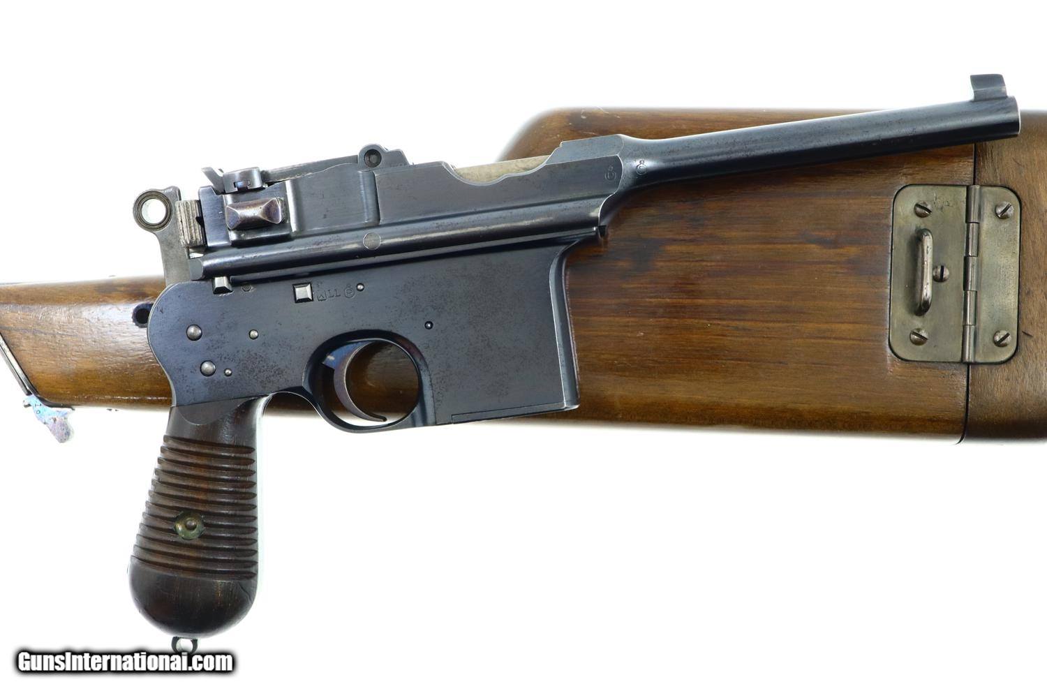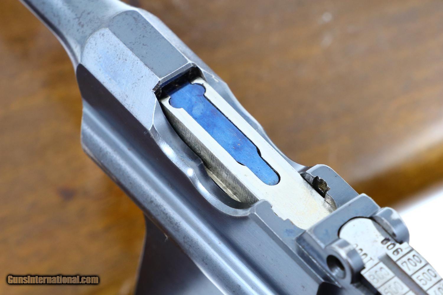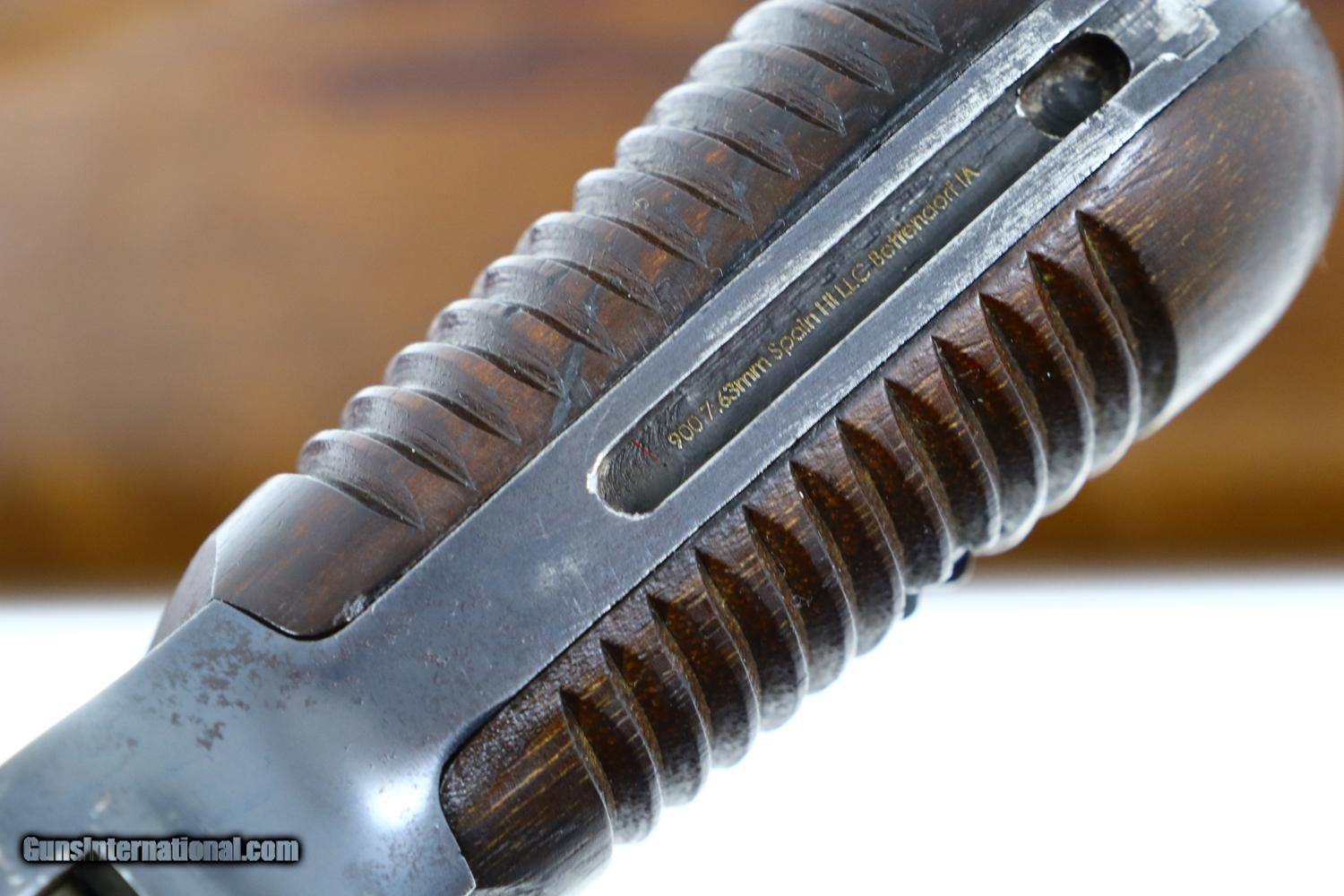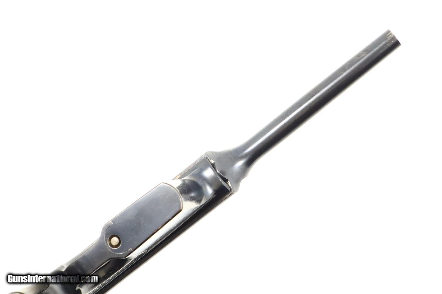 Description: Synopsis: Scarce Astra 900 Broomhandle shipped to German Army in Southern France, WWII, correct stock, 33246 Description: Standard configuration, late production Astra M900, shipped to German Army in Southern France in the late serial range 32788-33774 with correct stock, mismatched, but in the same serial range. A total of 1050 such ensembles were delivered to the Nazis during WWII. Pistol has 5.5 inch screw-in barrel and slip-in tangent rear sight graduated from 50-1000. Short extractor and two lug firing pin. Large ring hammer and full frame. Sideplate with caliber, patent date 1928 and company location in Guernica, Spain. Full serial number on frame above grip. Right side marked with the automatic pistol proof on barrel, receiver, and right side of frame whose markings include the Eibar house proof and a year code "LL" reflecting production in 1940. Serrated wood panels. No lanyard ring. Major parts rust blued; most small parts fire blued; bolt, hammer, and small transverse bolts in the white. Disassembly shows all-matching components. Complete with Astra M900 stock #33719, matching lid and lug. Fits well to pistol with minimal wobble. Condition: VG+ with sharp edge wear and scattered superficial freckling, especially on front of mag well and front/backstrap. Oil darkened grips. Near mirror bore. Perfect manual mechanics. VG Astra stock, revarnished but not sanded, with faded hardware as photographed. ~~Insured shipping fee of $155; most packages shipped using FedEx 2nd Day.~~ SOLD Manufacturer: Astra Serial Number: 33246 Caliber Info: 7.63mm |