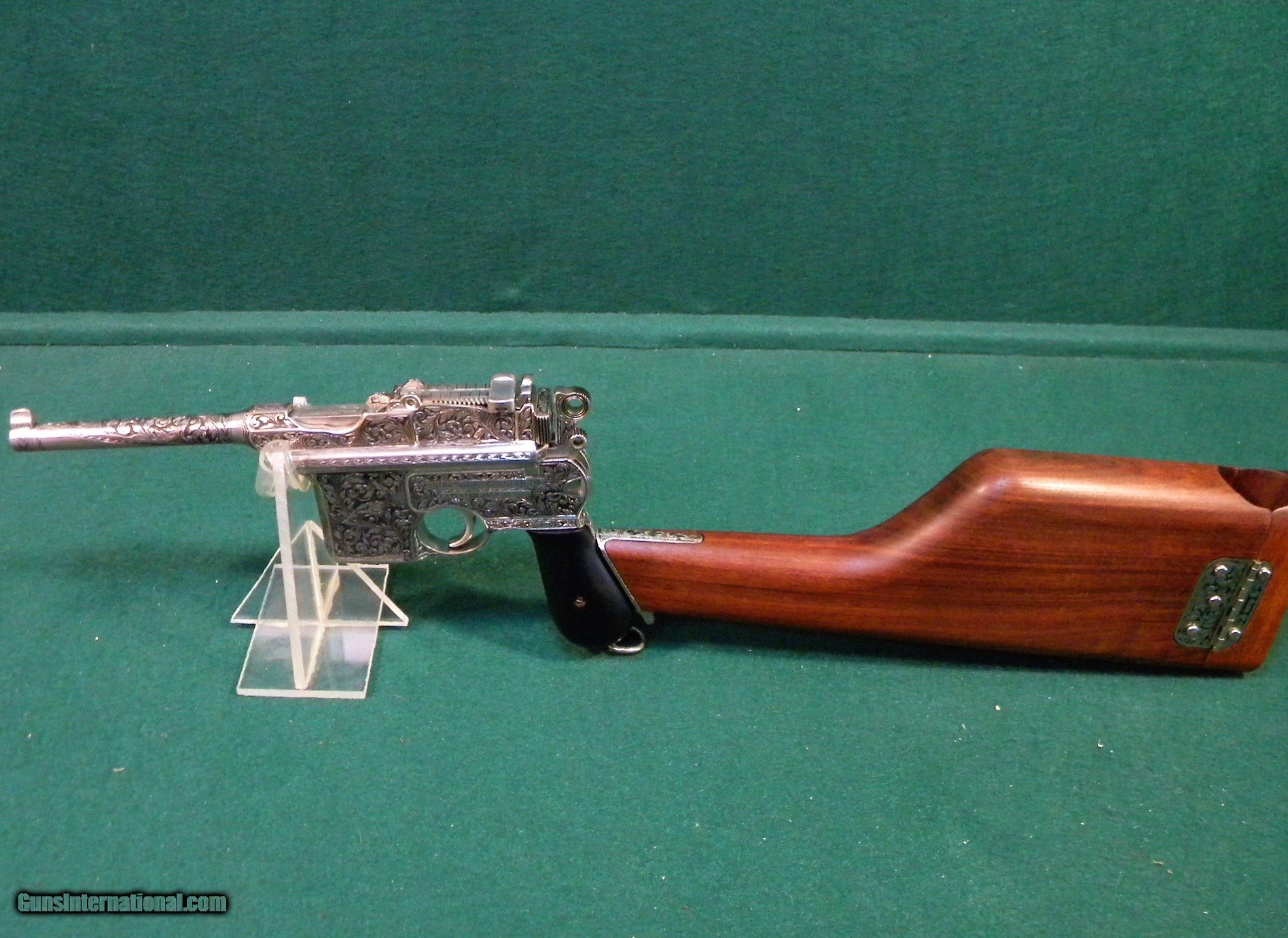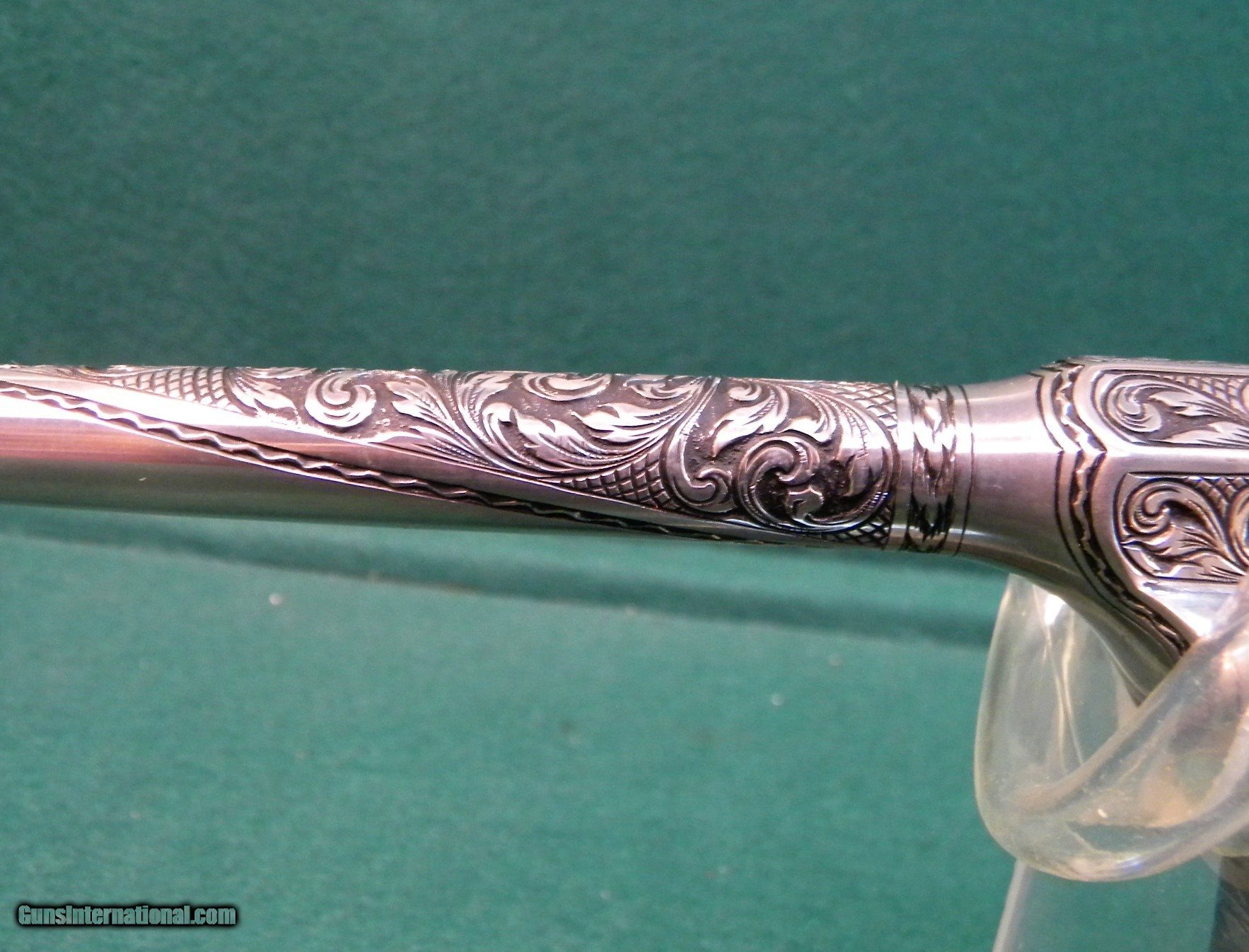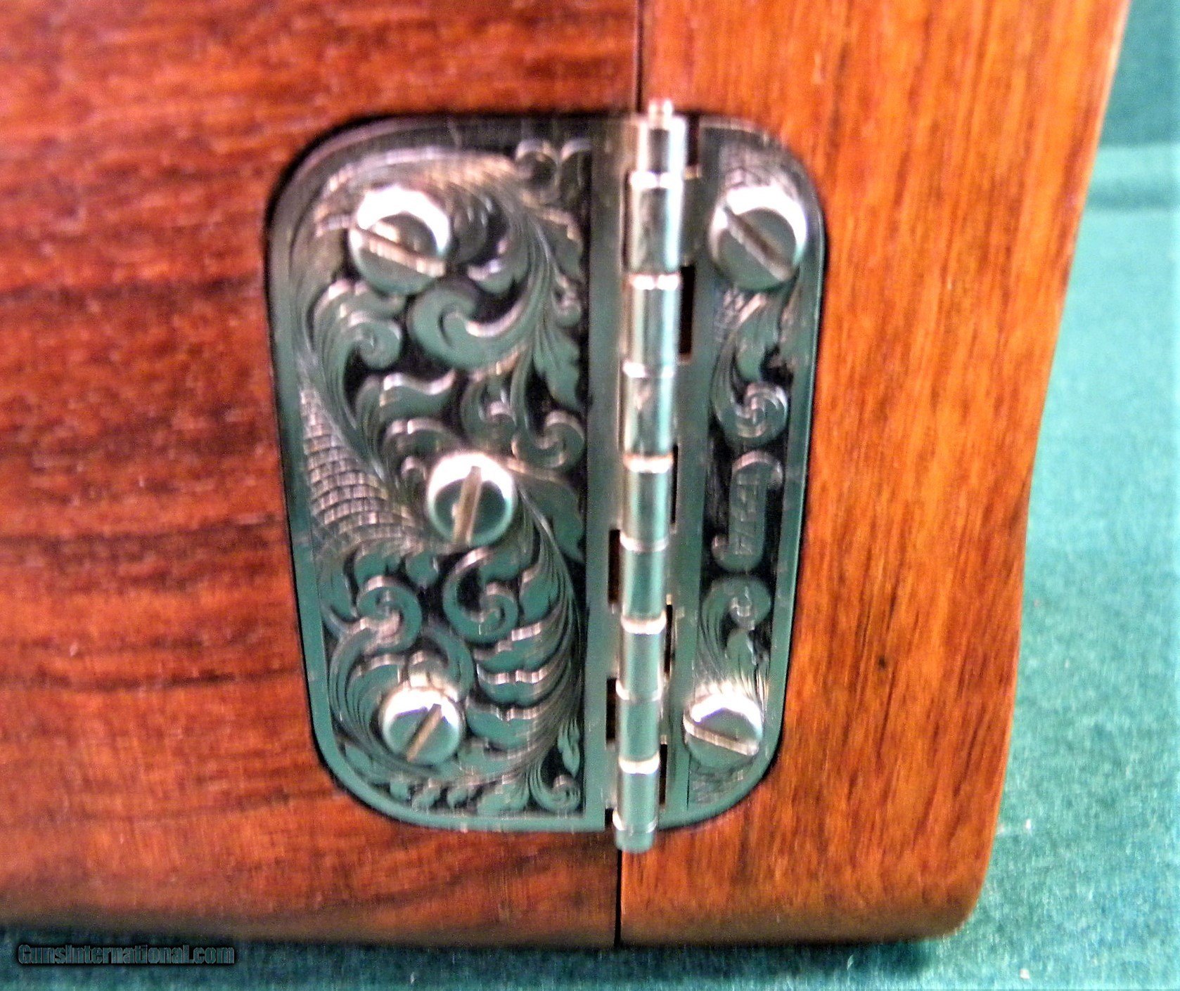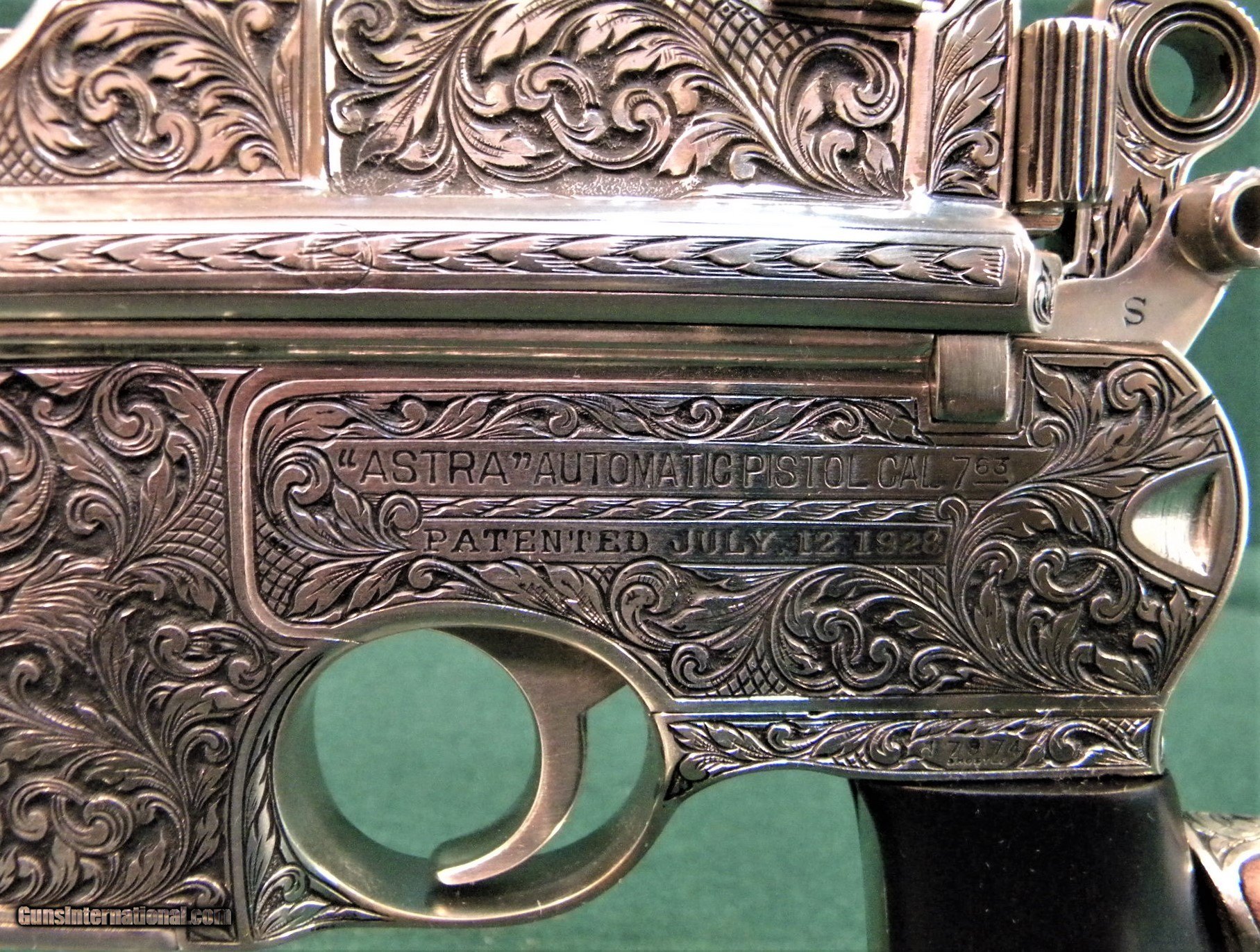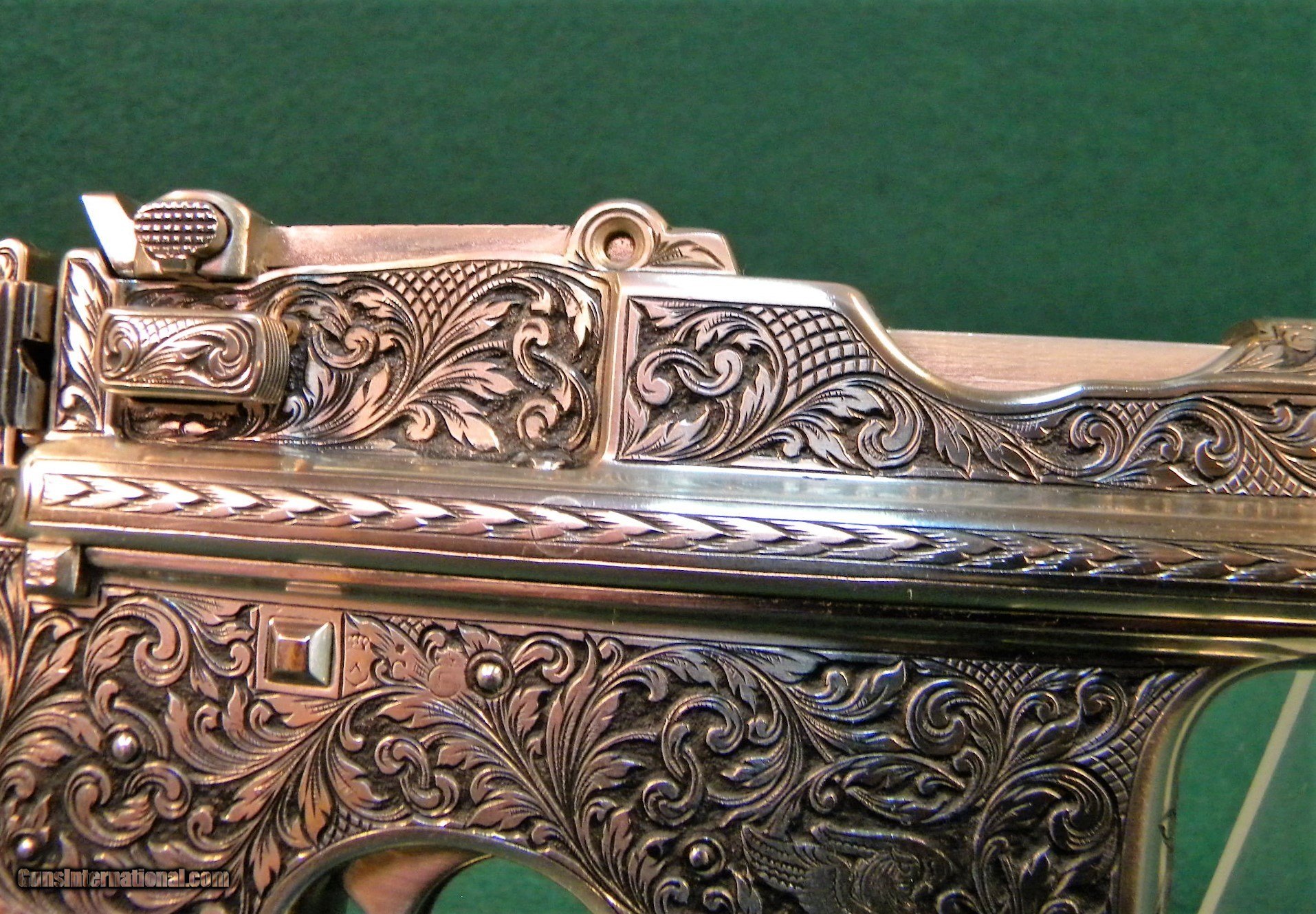 Description: Engraved Astra 900 by the late Master Engraver, Ben Shostle. This pistol has 100% hand engraved deep relief coverage with matching wood shoulder stock. The pistol has ebony grips with an ebony handled cleaning rod, nickel oil bottle, ammo and "James Wilkinson & Son" custom display case. Consignee advises that he bought this pistol rig in 1985 from Ben Shostle, at his shop in Muncie, Indiana. A truly one of a kind work of art!! Buyer pays exact shipping costs as insurance needs to be calculated at time of sale. NOTE: this item will remain for sale unless sold from our in house inventory, at which time this posting will be deleted. SOLD Manufacturer: Astra Model: 900 Caliber Info: .30 ACP Condition: Used |