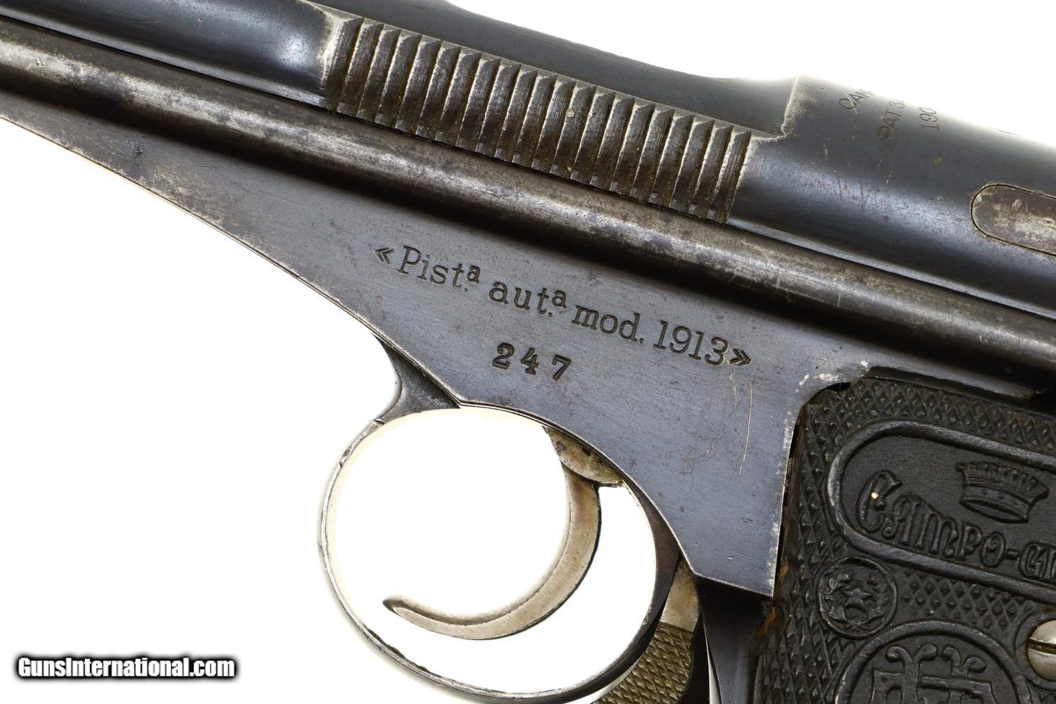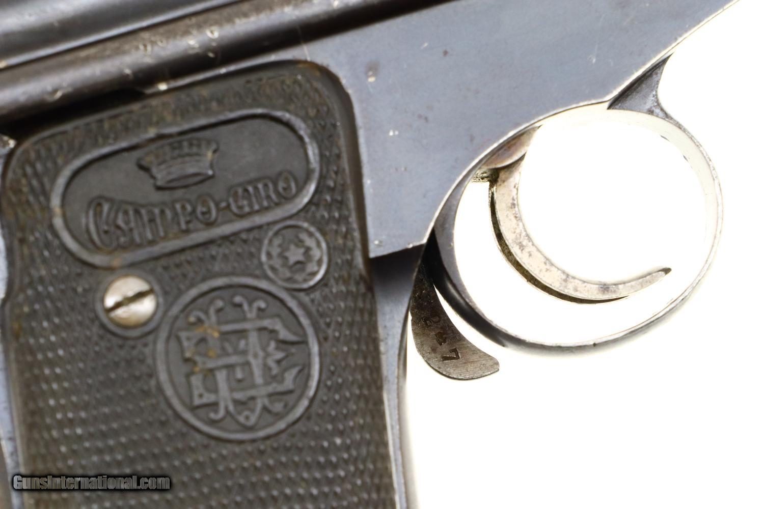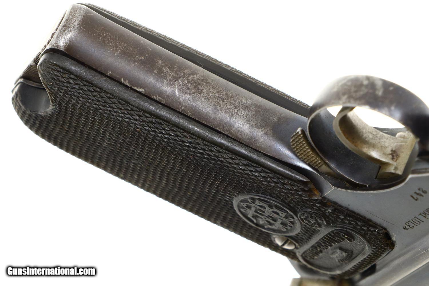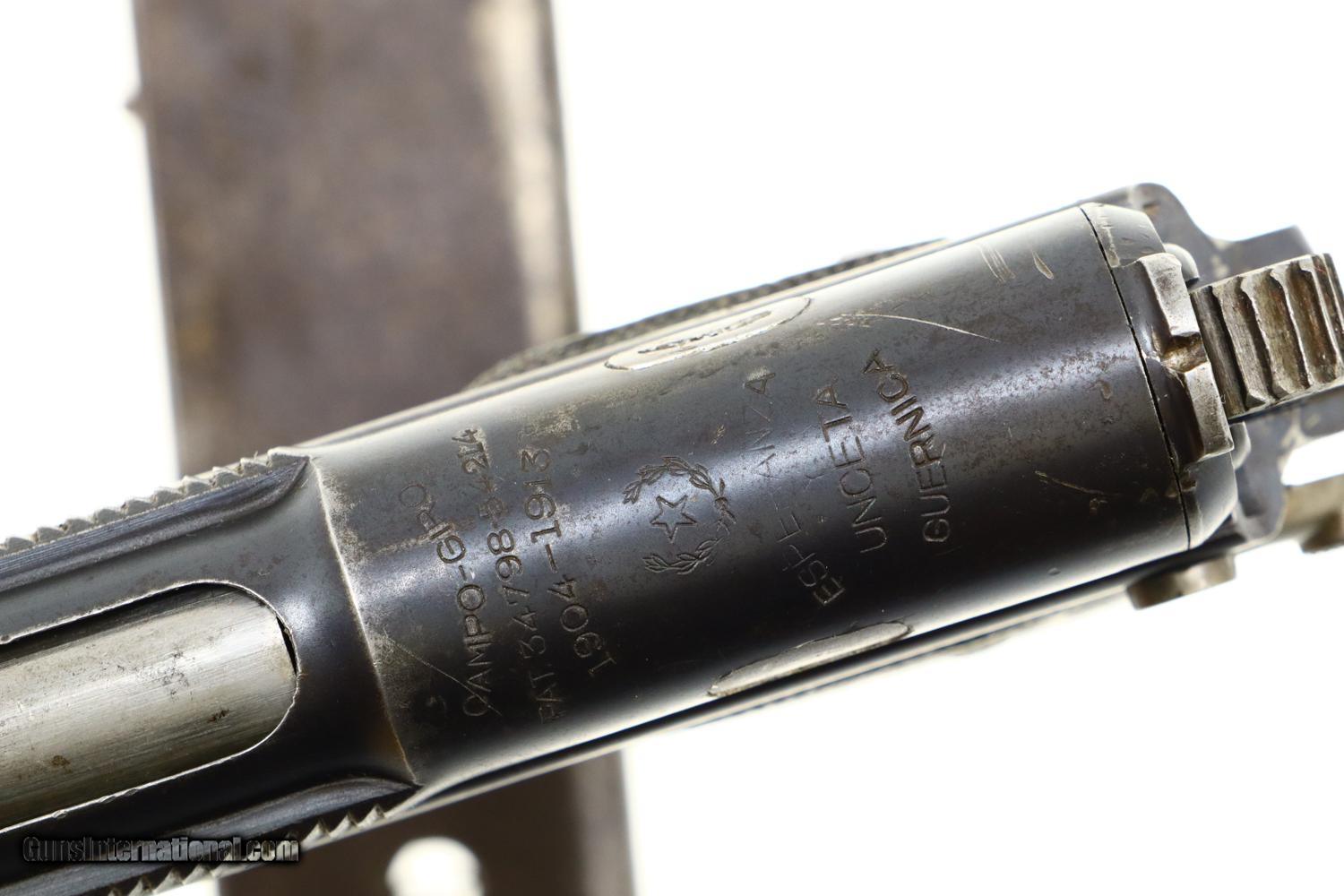 Description: Classic earliest design Spanish military pistol, Campo-Giro M1913, military production limited to 960 pistols, the gun that really put Astra on the map as a serious firearms manufacturer. This early production, single action, buffered blowback pistol, delivered to the military in April 1916, has its magazine release behind the trigger guard and buffalo horned grips, each panel secured with a single screw. The designer, patent reference, manufacturer, and location in Guernica are marked on the top of the slide. Left side of frame marked to reference model “1913” and serial number. Correct unnumbered magazine which has a slotted spine. Major components rust blued. Hammer, safety, trigger, and magazine release are case hardened. Pressed buffalo horned grips, each with an encircled Campo Giro reference, surmounting a separately encircled star within a wreath and a larger encircled E/U. Contained in a custom wood presentation case lined in red velvet with an identifying brass label on the outside. Synopsis: Astra, Esperanza y Unceta, Campo-Giro, M1913, 9mmL, Spanish Military, custom presentation case Condition: G/VG with moderate wear, consistent with a pistol that has seen significant service use. The right side of the hammer pin has an extension that slips into the firing pin axle, the extension absent, allowing the safety to rotate excessively. Comparable condition grips, the left panel missing a small edge of its border at top left corner. Mirror bright bore with sharp rifling. Correct manual mechanics, though the slide only stays retracted if slight upward pressure is put on the inserted magazine. Excellent carrying/presentation case as recently manufactured. An extremely scarce Campo Giro, a key item for those wishing to collect early developmental pistols, or interested in Spanish military small arms. ~~Insured shipping fee of $65; most packages shipped using FedEx 2nd Day.~~ SOLD Curio/Relic: Yes Manufacturer: Astra Serial Number: 247 Caliber Info: 9mmL |