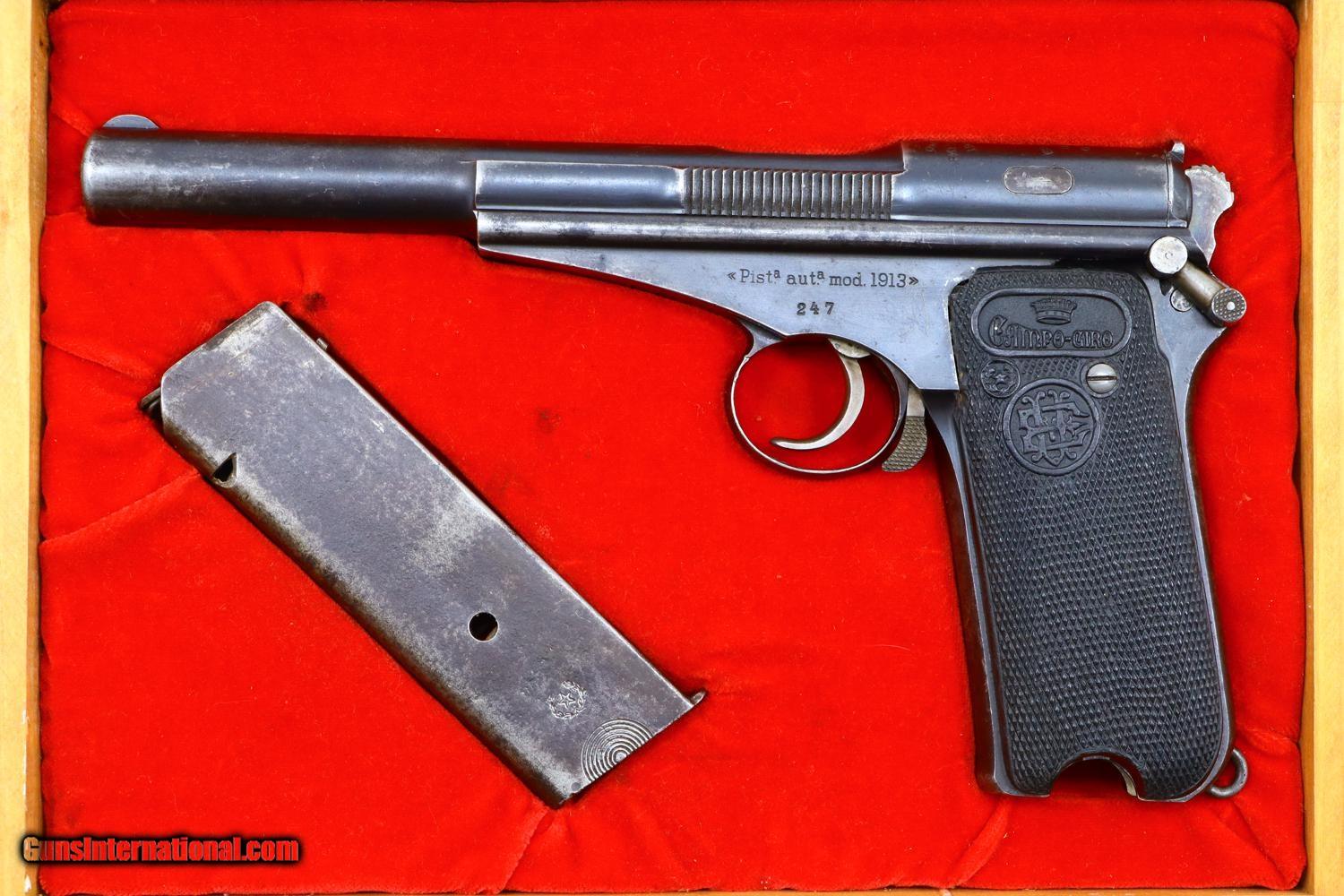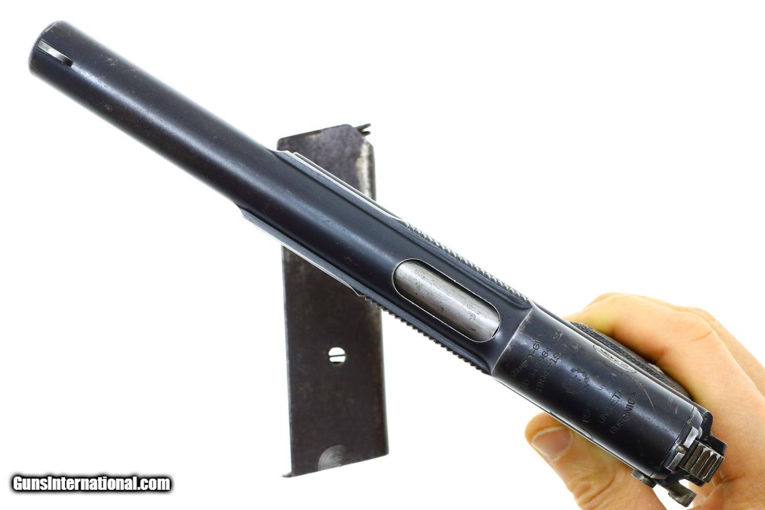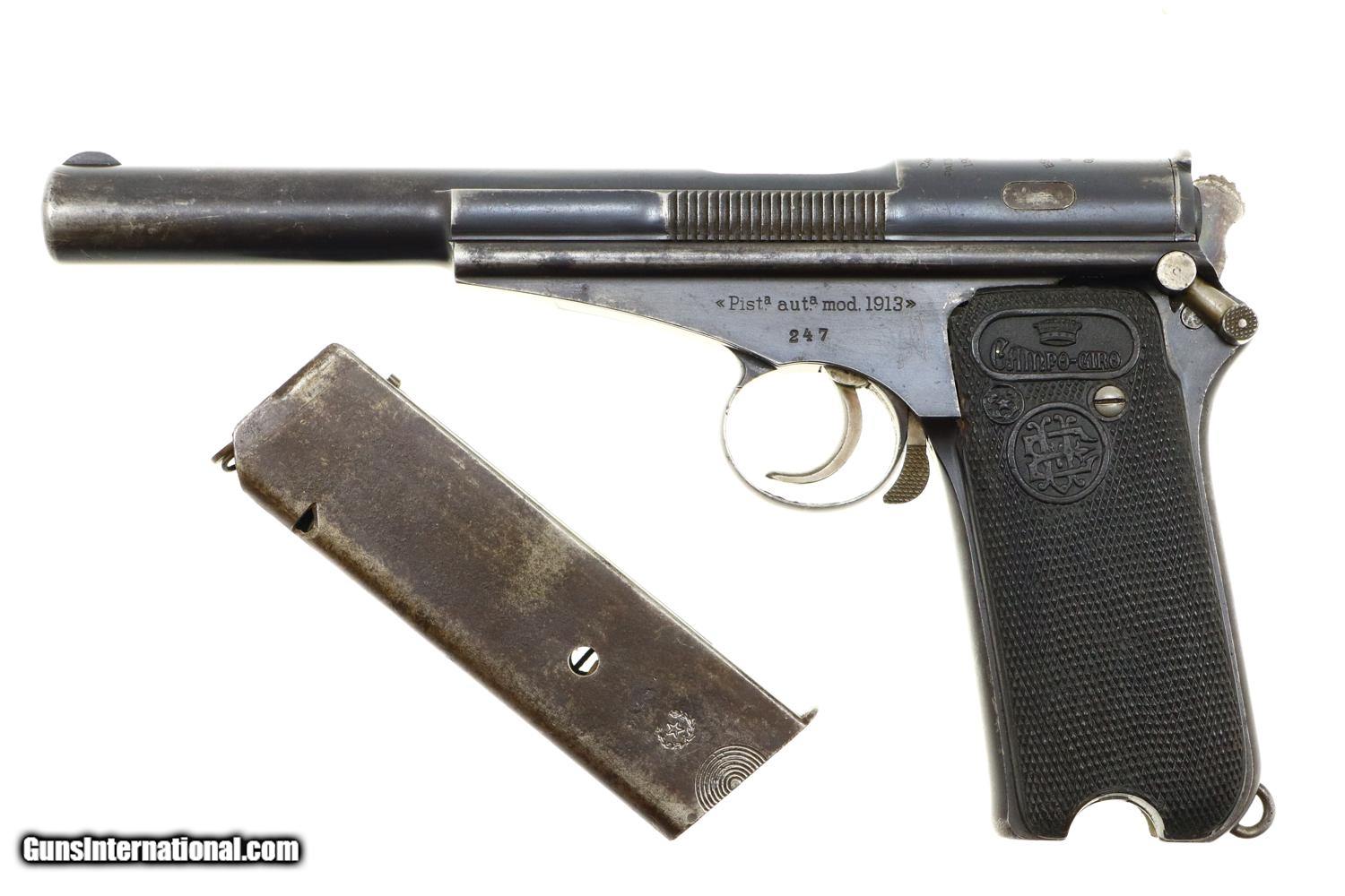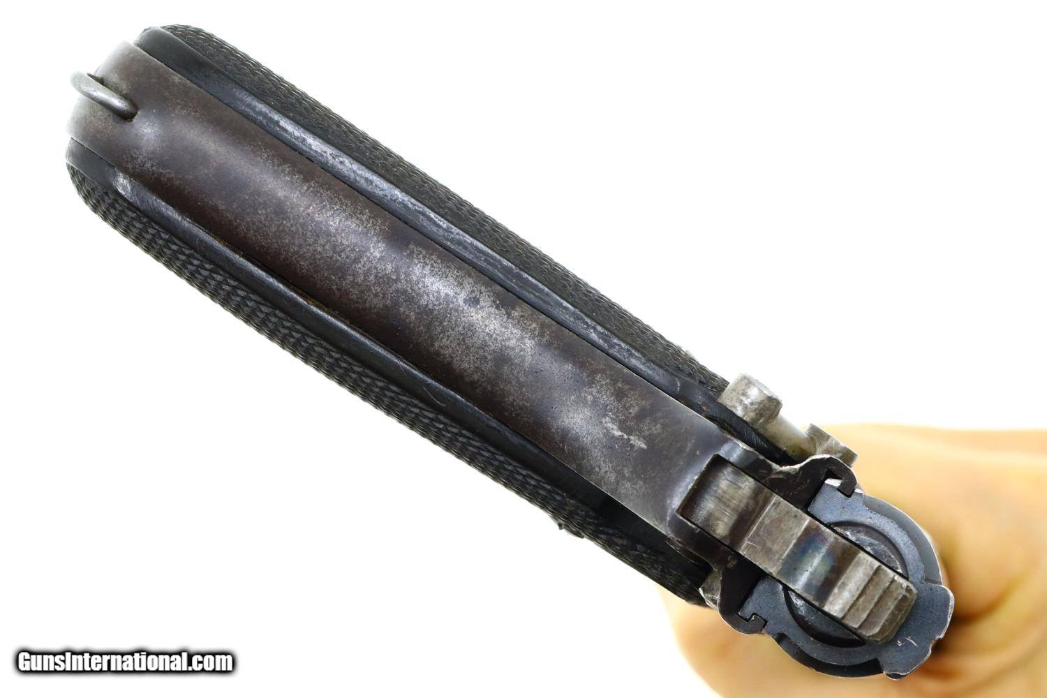 Description: Classic earliest design Spanish military pistol, Campo-Giro M1913, military production limited to 960 pistols, the gun that really put Astra on the map as a serious firearms manufacturer. This early production, single action, buffered blowback pistol, delivered to the military in April 1916, has its magazine release behind the trigger guard and buffalo horned grips, each panel secured with a single screw. The designer, patent reference, manufacturer, and location in Guernica are marked on the top of the slide. Left side of frame marked to reference model “1913” and serial number. Correct unnumbered magazine which has a slotted spine. Major components rust blued. Hammer, safety, trigger, and magazine release are case hardened. Pressed buffalo horned grips, each with an encircled Campo Giro reference, surmounting a separately encircled star within a wreath and a larger encircled E/U. Contained in a custom wood presentation case lined in red velvet with an identifying brass label on the outside. Synopsis: Astra, Esperanza y Unceta, Campo-Giro, M1913, 9mmL, Spanish Military, custom presentation case Condition: G/VG with moderate wear, consistent with a pistol that has seen significant service use. The right side of the hammer pin has an extension that slips into the firing pin axle, the extension absent, allowing the safety to rotate excessively. Comparable condition grips, the left panel missing a small edge of its border at top left corner. Mirror bright bore with sharp rifling. Correct manual mechanics, though the slide only stays retracted if slight upward pressure is put on the inserted magazine. Excellent carrying/presentation case as recently manufactured. An extremely scarce Campo Giro, a key item for those wishing to collect early developmental pistols, or interested in Spanish military small arms. ~~Insured shipping fee of $65; most packages shipped using FedEx 2nd Day.~~ SOLD Curio/Relic: Yes Manufacturer: Astra Serial Number: 247 Caliber Info: 9mmL |