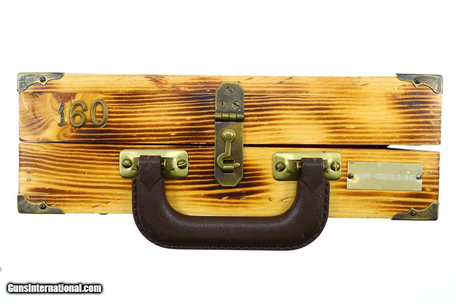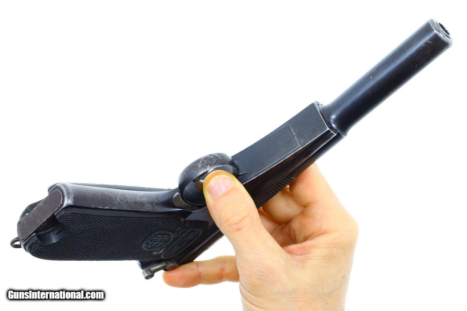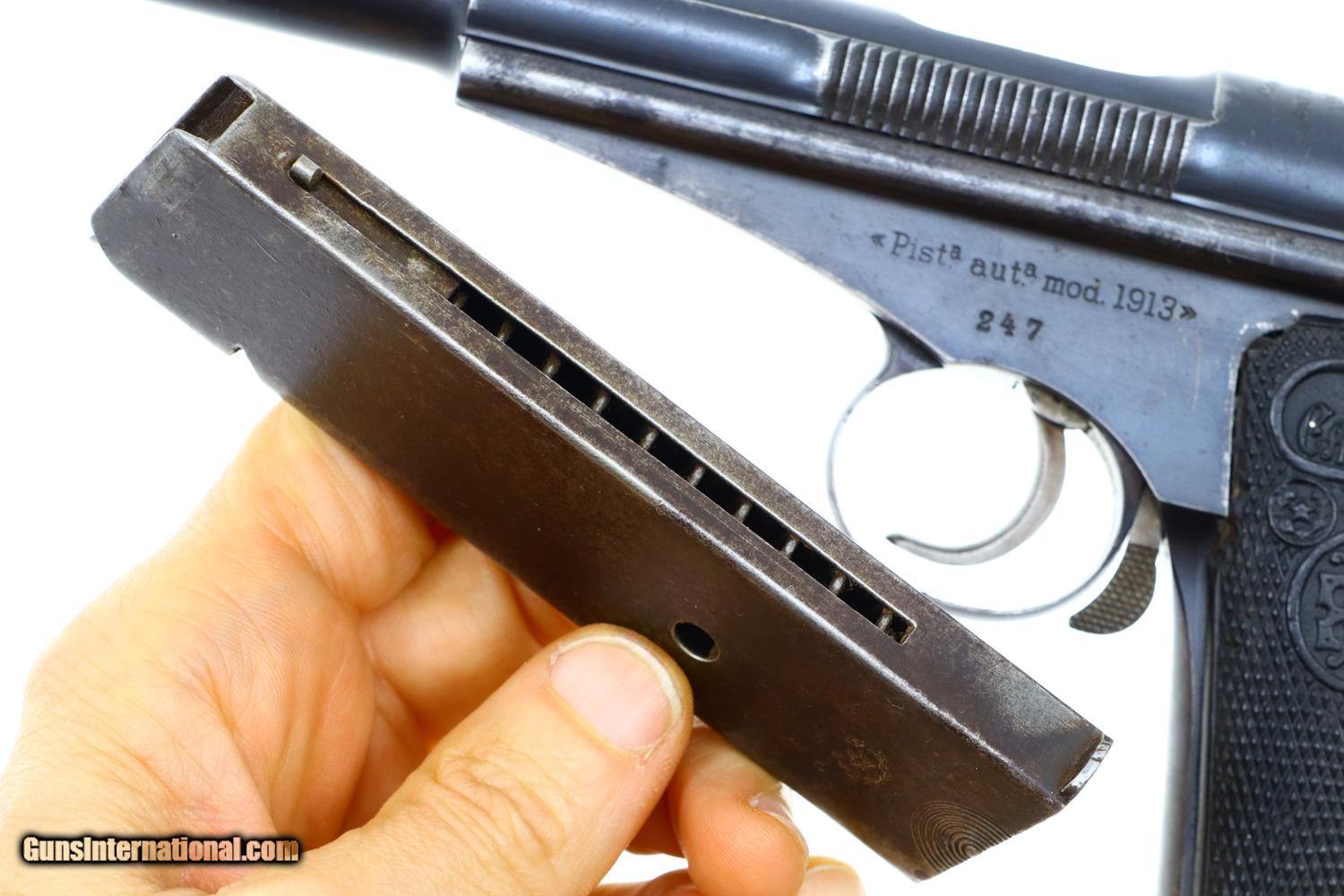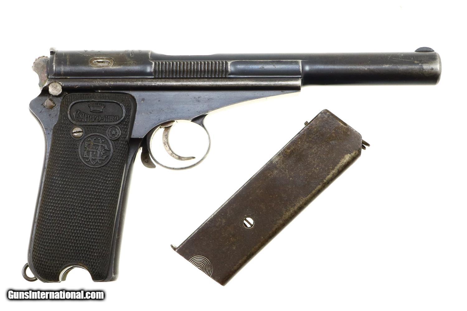 Description: Classic earliest design Spanish military pistol, Campo-Giro M1913, military production limited to 960 pistols, the gun that really put Astra on the map as a serious firearms manufacturer. This early production, single action, buffered blowback pistol, delivered to the military in April 1916, has its magazine release behind the trigger guard and buffalo horned grips, each panel secured with a single screw. The designer, patent reference, manufacturer, and location in Guernica are marked on the top of the slide. Left side of frame marked to reference model “1913” and serial number. Correct unnumbered magazine which has a slotted spine. Major components rust blued. Hammer, safety, trigger, and magazine release are case hardened. Pressed buffalo horned grips, each with an encircled Campo Giro reference, surmounting a separately encircled star within a wreath and a larger encircled E/U. Contained in a custom wood presentation case lined in red velvet with an identifying brass label on the outside. Synopsis: Astra, Esperanza y Unceta, Campo-Giro, M1913, 9mmL, Spanish Military, custom presentation case Condition: G/VG with moderate wear, consistent with a pistol that has seen significant service use. The right side of the hammer pin has an extension that slips into the firing pin axle, the extension absent, allowing the safety to rotate excessively. Comparable condition grips, the left panel missing a small edge of its border at top left corner. Mirror bright bore with sharp rifling. Correct manual mechanics, though the slide only stays retracted if slight upward pressure is put on the inserted magazine. Excellent carrying/presentation case as recently manufactured. An extremely scarce Campo Giro, a key item for those wishing to collect early developmental pistols, or interested in Spanish military small arms. ~~Insured shipping fee of $65; most packages shipped using FedEx 2nd Day.~~ SOLD Curio/Relic: Yes Manufacturer: Astra Serial Number: 247 Caliber Info: 9mmL |