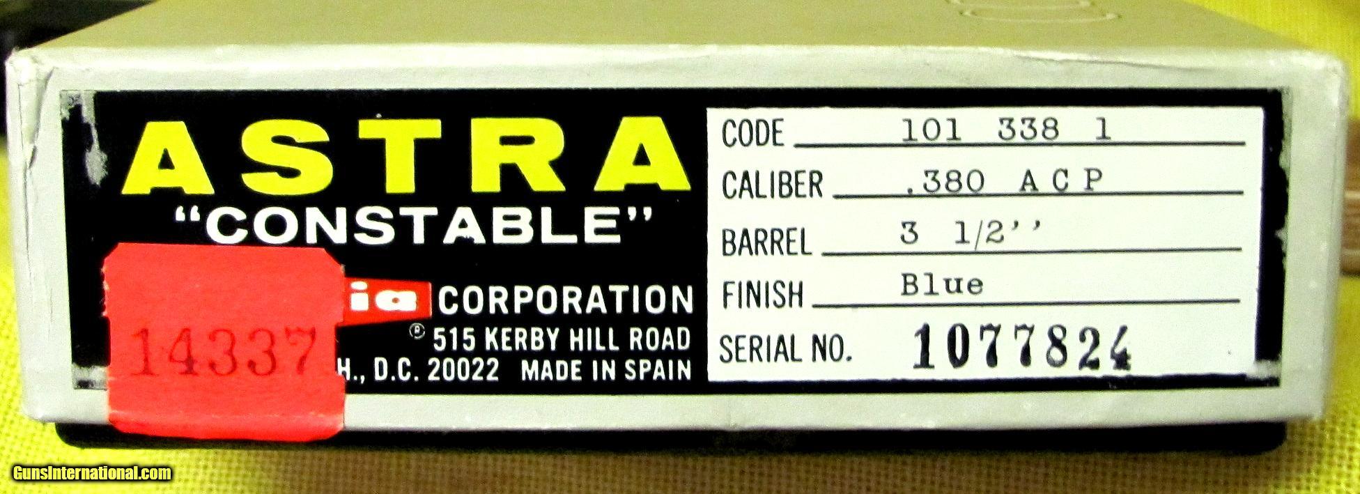 Description: ASTRA model CONSTABLE in .380 ACP CAL., with 3 1/2" barrel. Color BLUE. ASTRA MODEL CONSTABLE, MIRROR BORE, GRIPS EXCELLENT, 98%+ FACTORY FINISH, EXTRA MAGAZINE, BOX AND PAPERS, LIKE NEW CONDITION. OUR NEW STOCK # D31839 Condition 98%+ LIKE NEW. Serial number 1077824. SOLD |