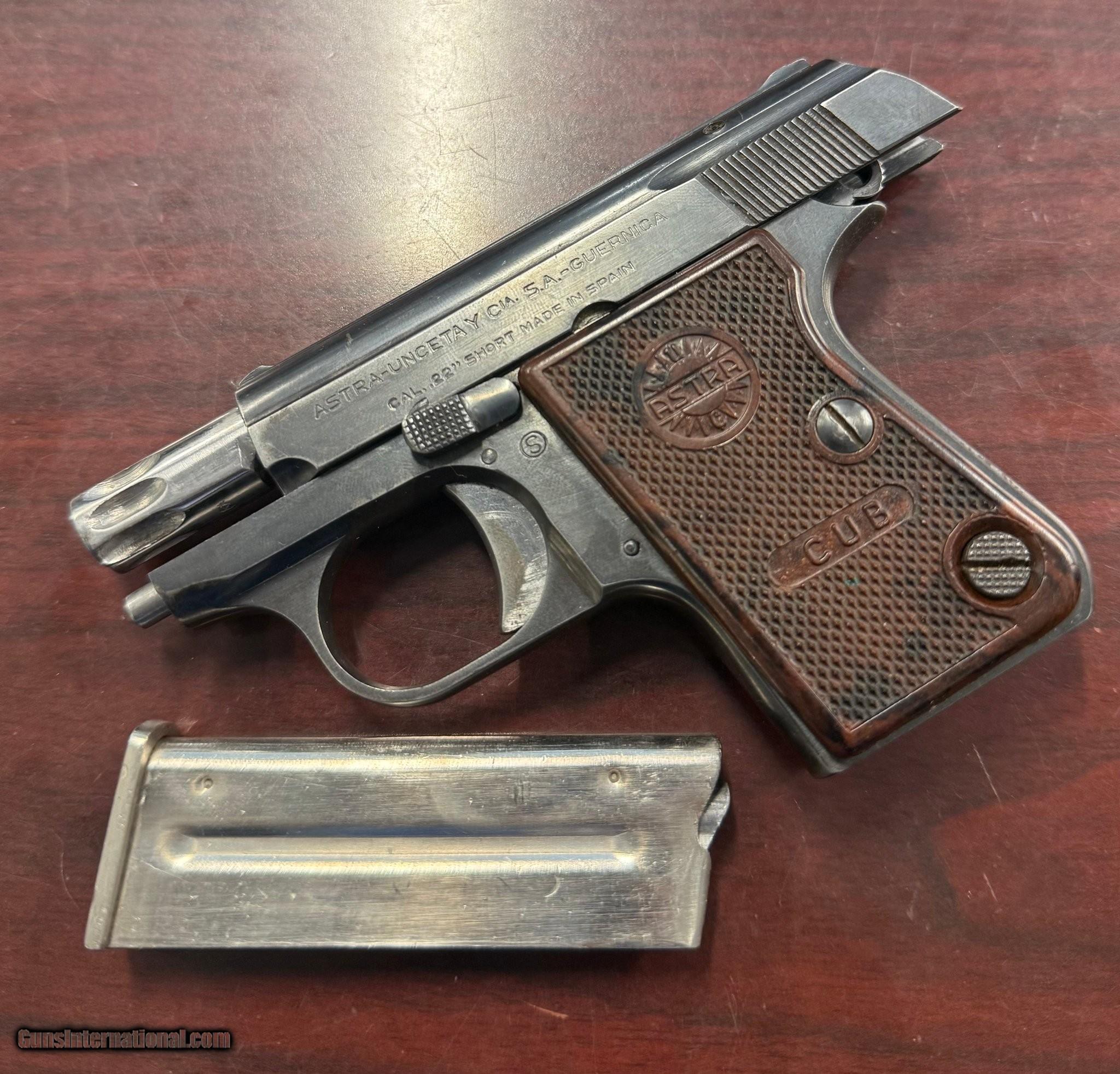 Description: Guns Listing ID: 571875 In good condition, no major cosmetic wear. Comes with one mag and does not come with original box. SOLD Manufacturer: ASTRA Model: Cub Caliber Info: .22 SHORT Condition: Used - Non-Certified Barrels: 2.25" BARREL Action: SEMI AUTOMATIC |