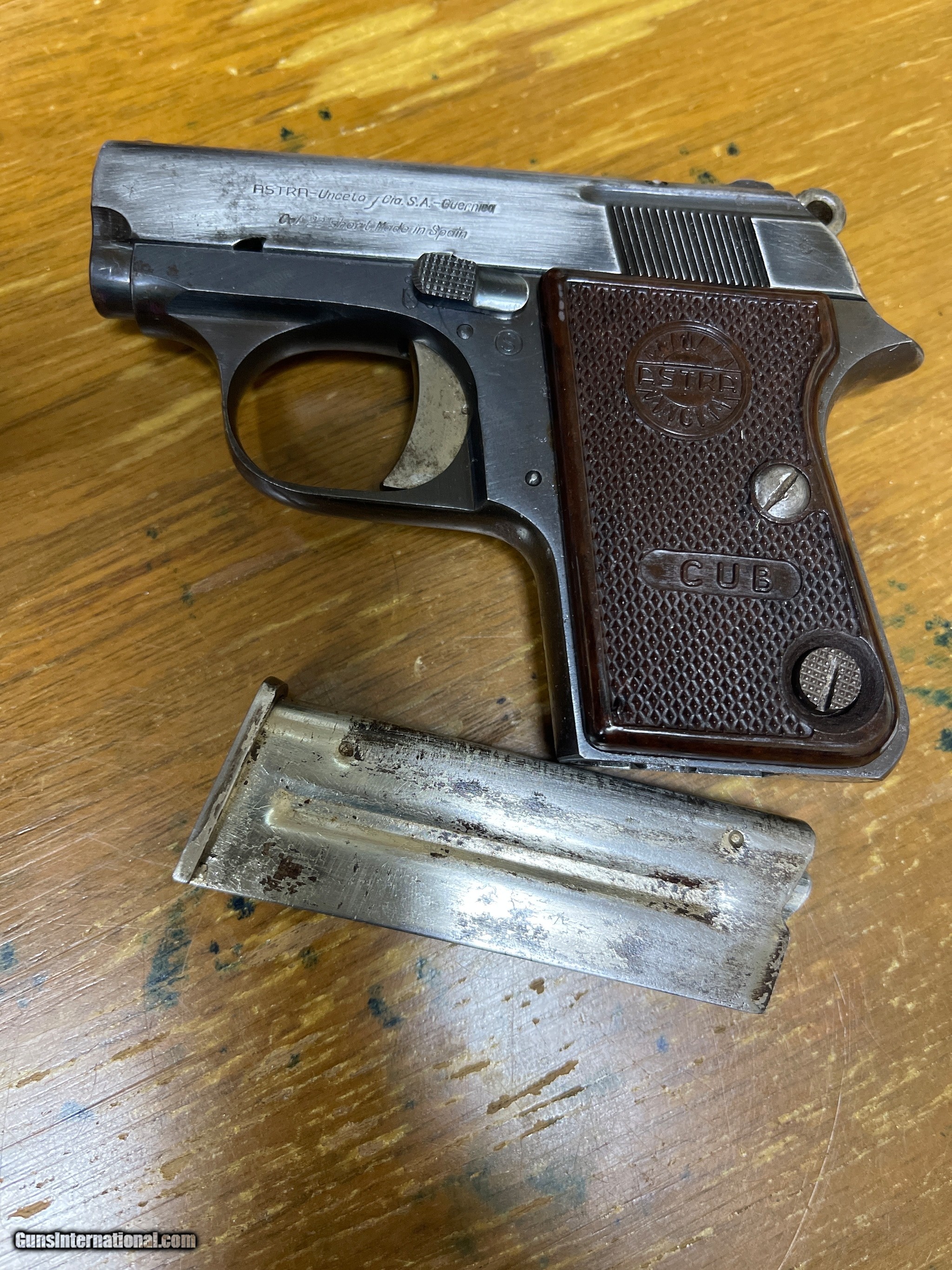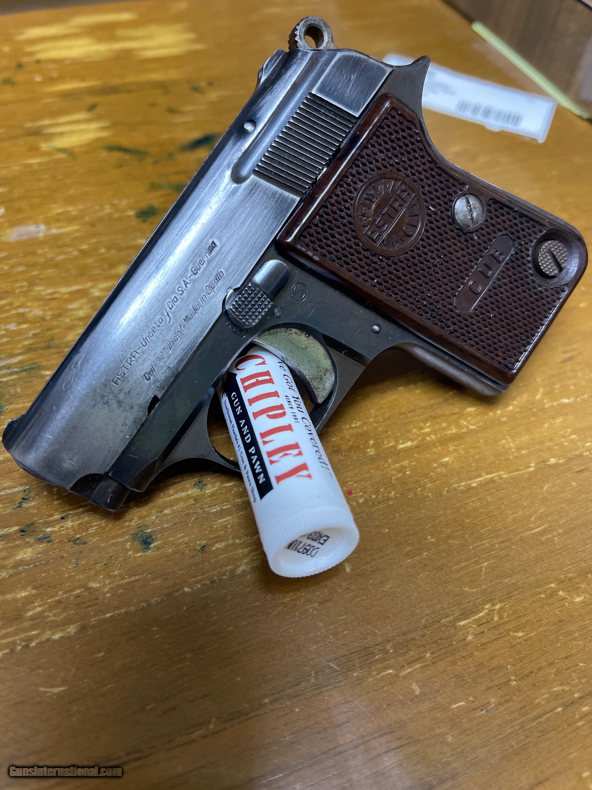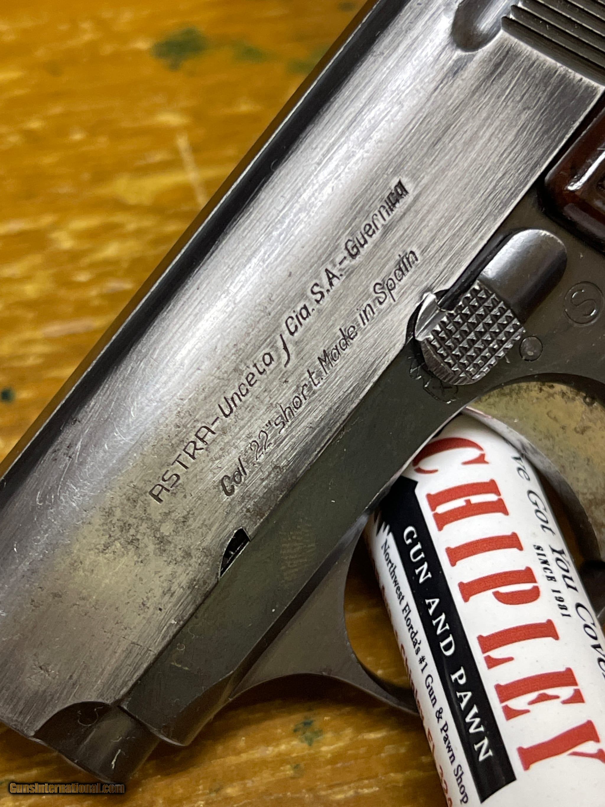 Description: Guns Listing ID: 455794 On left side of slide states: Astra- Unceta CIA S.A.-Guernica Cal .22short Made in Spain Barrel and frame on gun has same serial number Shipped with gun is Firearm and One magazine Lots of wear on blueing. Check picture out! SOLD Manufacturer: ASTRA Model: Cub Caliber Info: 22 SHORT Condition: Used - Non-Certified Barrels: 2 BARREL Finish: BLUE |