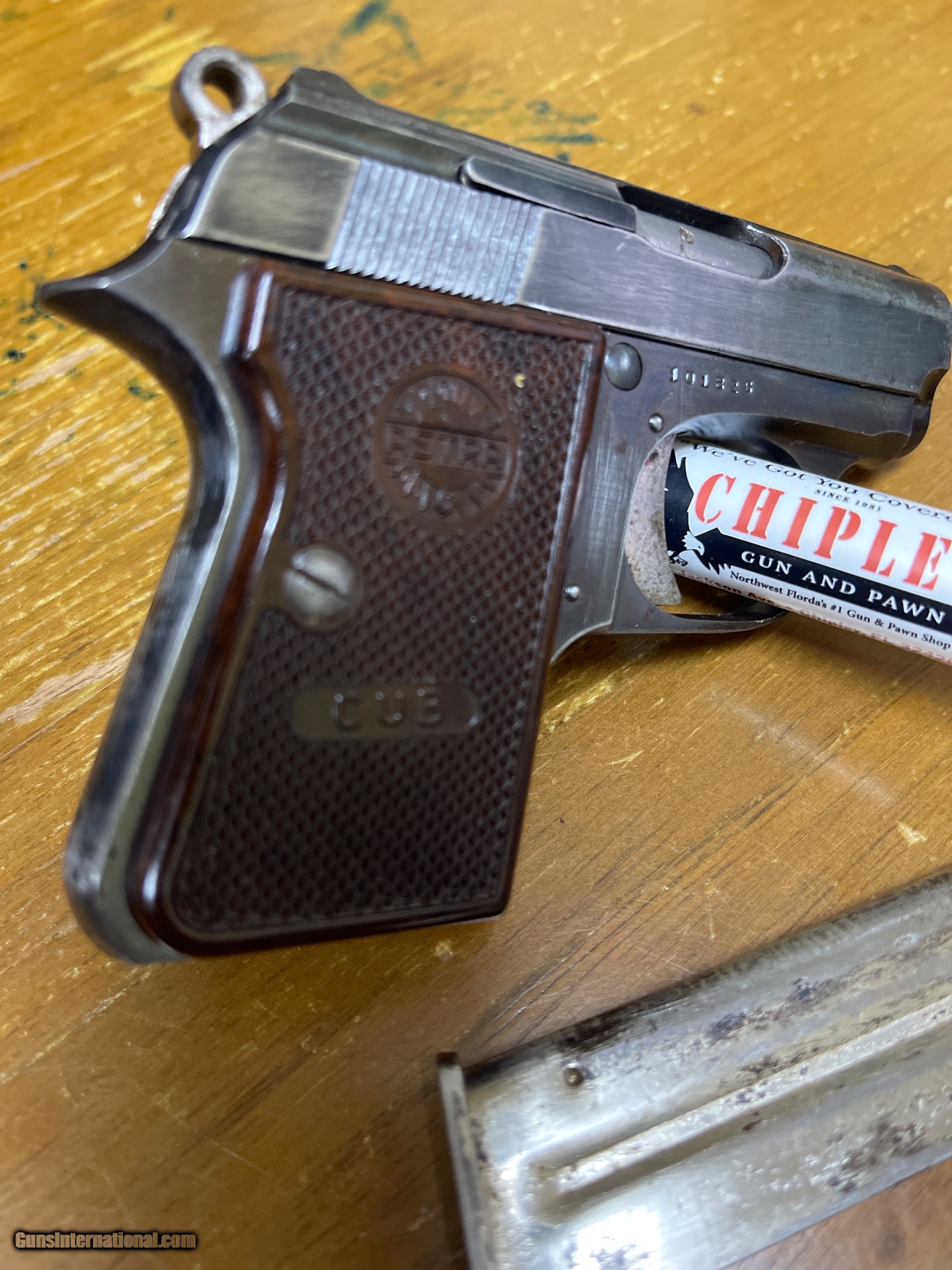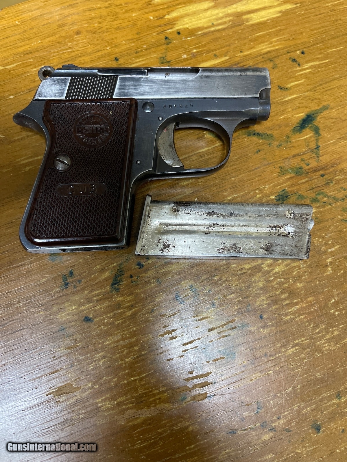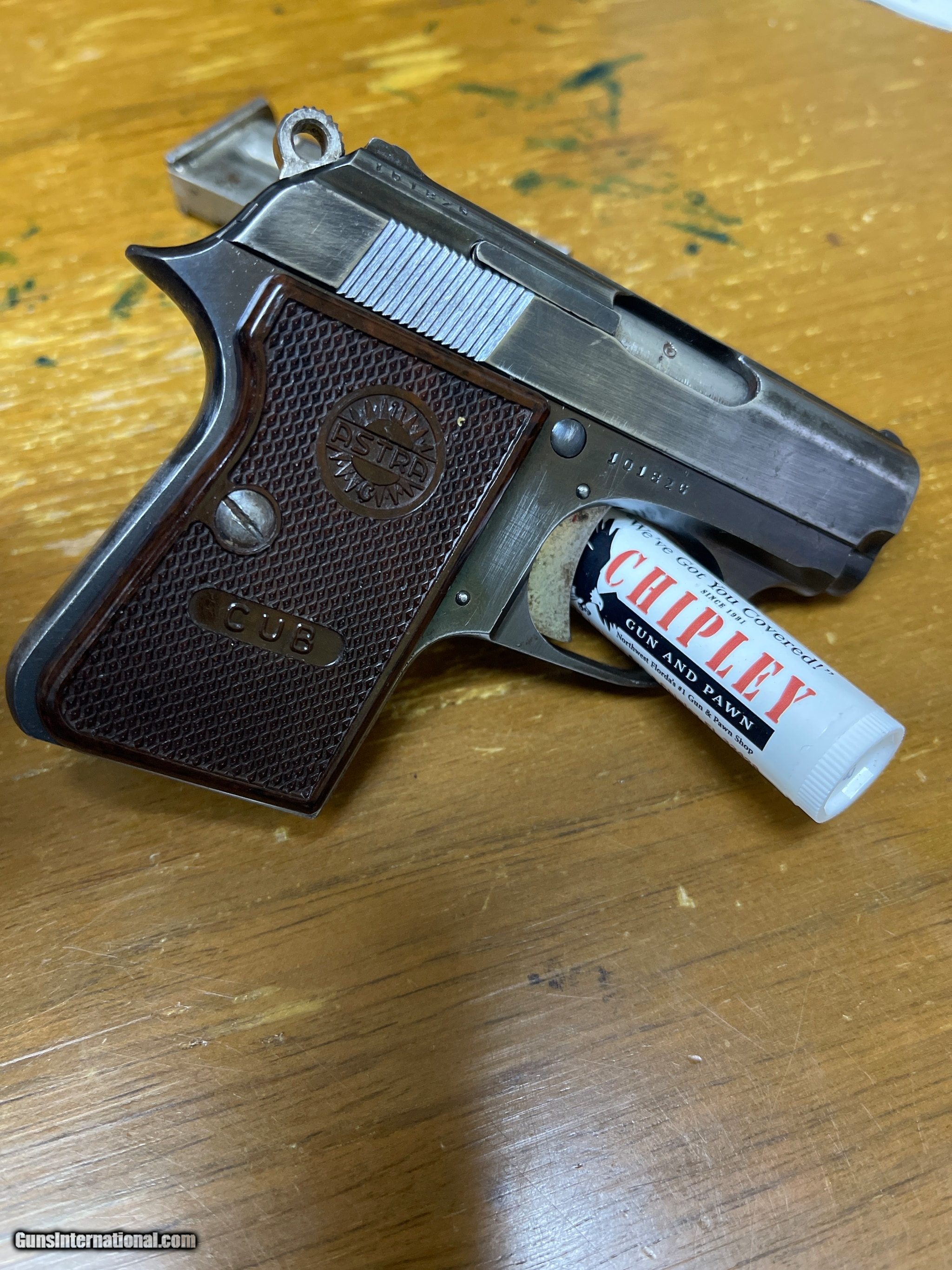 Description: Guns Listing ID: 455794 On left side of slide states: Astra- Unceta CIA S.A.-Guernica Cal .22short Made in Spain Barrel and frame on gun has same serial number Shipped with gun is Firearm and One magazine Lots of wear on blueing. Check picture out! SOLD Manufacturer: ASTRA Model: Cub Caliber Info: 22 SHORT Condition: Used - Non-Certified Barrels: 2 BARREL Finish: BLUE |