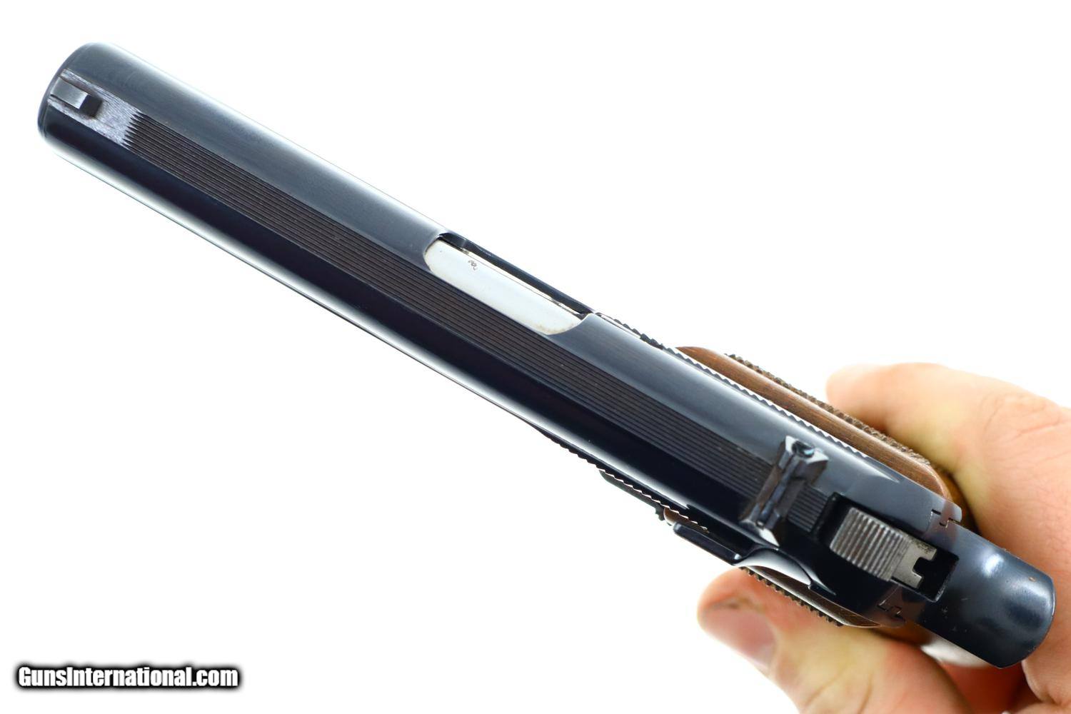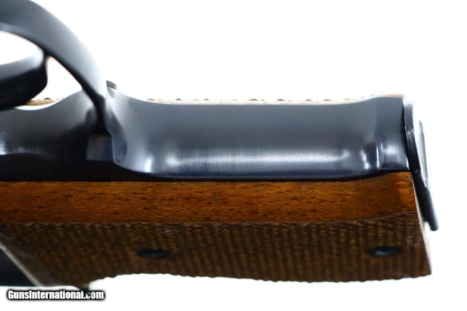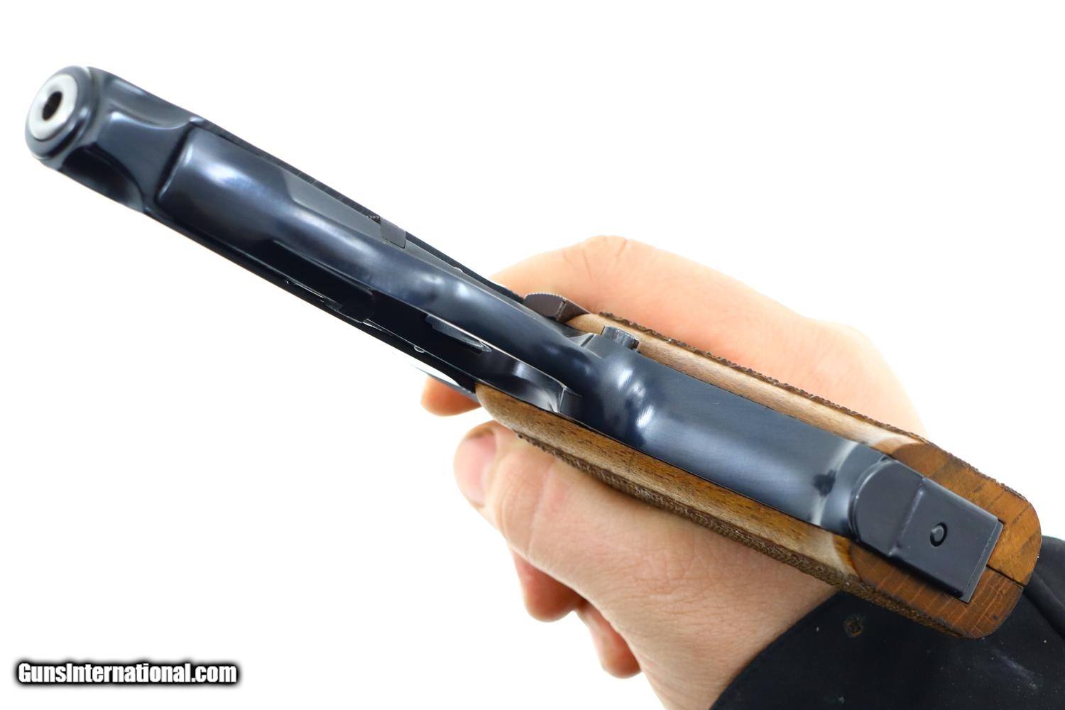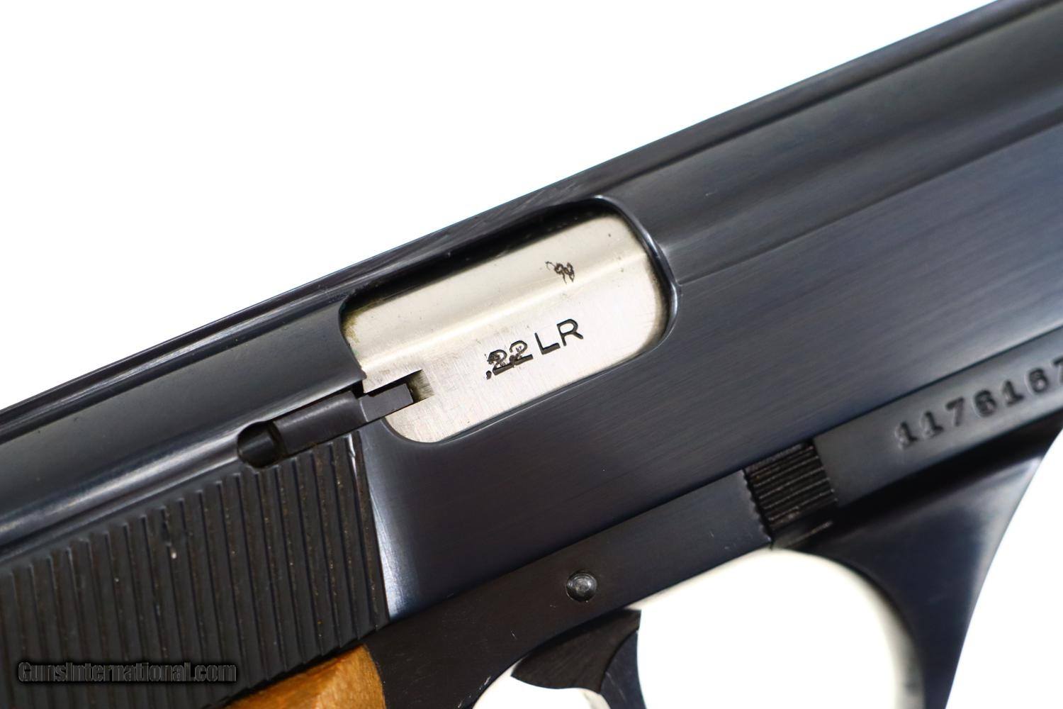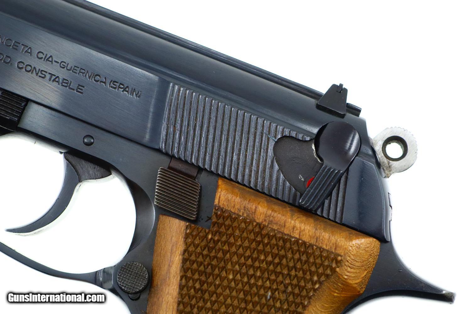 Description: Astra M5000 Constable made in 1977, high polish blue in seldom encountered .22LR caliber. Standard configuration with fixed front sight and screw-windage adjustable rear sight. Left side of slide with usual two line address reflecting manufacturer, model, and caliber. 3.5" barrel. No importer marking on slide. Full serial number on the right side of frame. Wood checkered grips, each panel secured with two screws. Correct unmarked magazine. Identically marked to the example shown in Astra Firearms & Selected Competitors on page 487 except in .22LR and with wood grips. Synopsis: Astra M5000 Constable, .22LR, AS NEW Condition: Virtually new with 99+% original, high polish blue and immaculate wood grips. Mirror bore. Perfect manual mechanics. The only way to upgrade would be to find an example NIB. ~~Insured shipping fee of $45; most packages shipped using FedEx 2nd Day.~~ SOLD Manufacturer: Astra Serial Number: 1176167 Caliber Info: .22LR |