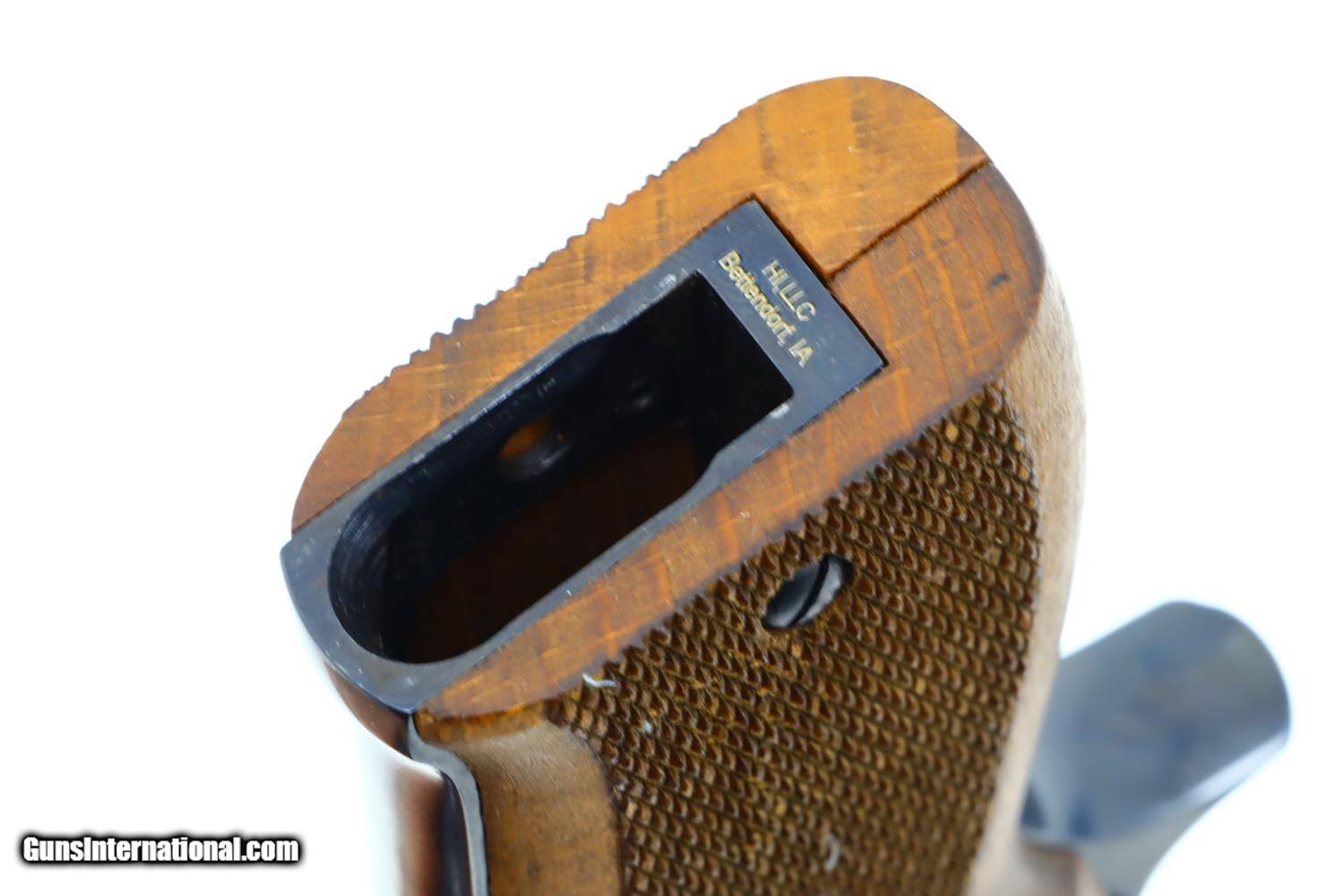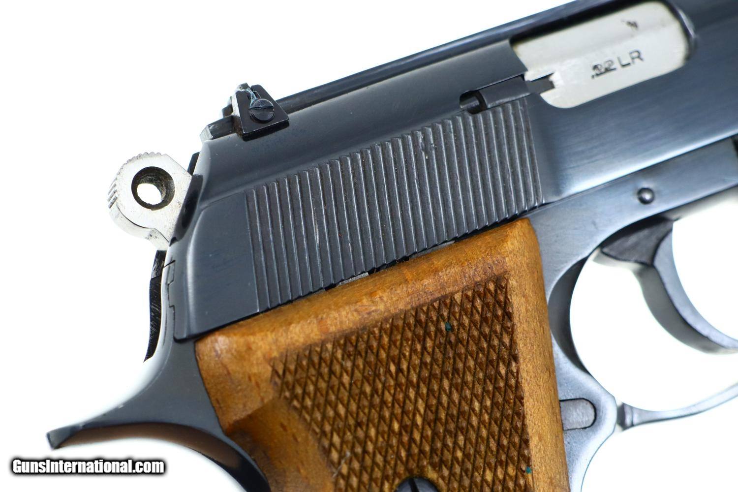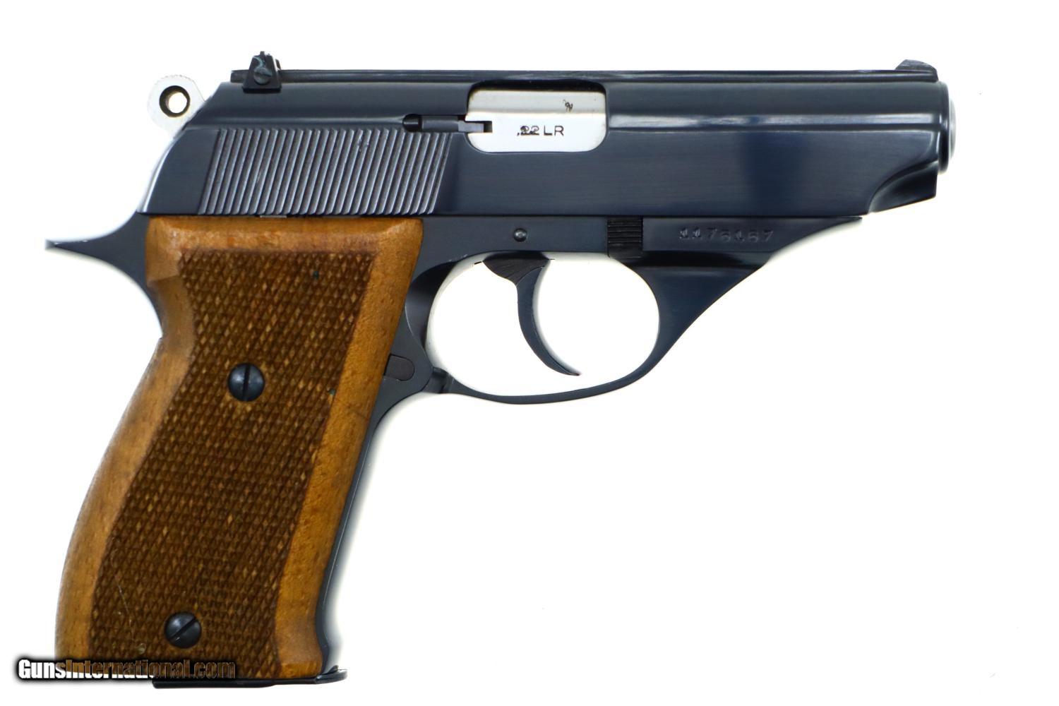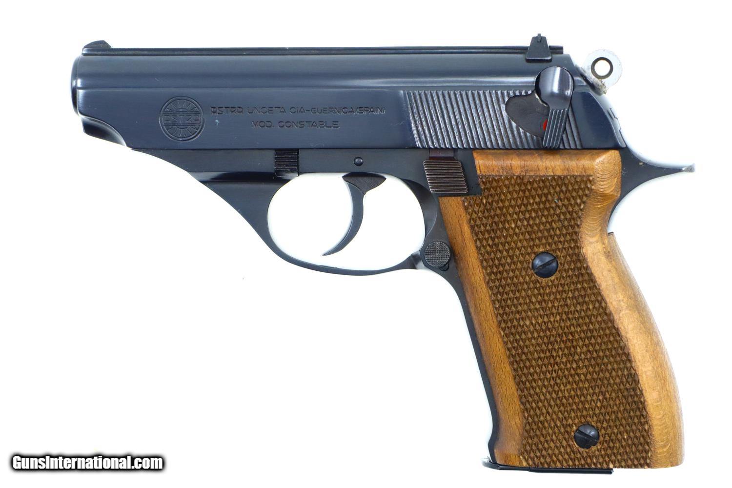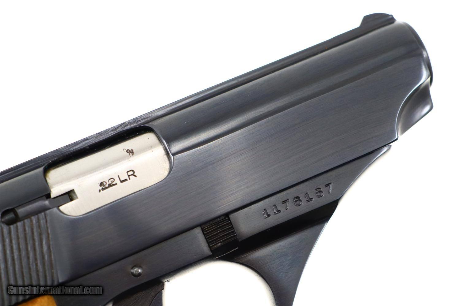 Description: Astra M5000 Constable made in 1977, high polish blue in seldom encountered .22LR caliber. Standard configuration with fixed front sight and screw-windage adjustable rear sight. Left side of slide with usual two line address reflecting manufacturer, model, and caliber. 3.5" barrel. No importer marking on slide. Full serial number on the right side of frame. Wood checkered grips, each panel secured with two screws. Correct unmarked magazine. Identically marked to the example shown in Astra Firearms & Selected Competitors on page 487 except in .22LR and with wood grips. Synopsis: Astra M5000 Constable, .22LR, AS NEW Condition: Virtually new with 99+% original, high polish blue and immaculate wood grips. Mirror bore. Perfect manual mechanics. The only way to upgrade would be to find an example NIB. ~~Insured shipping fee of $45; most packages shipped using FedEx 2nd Day.~~ SOLD Manufacturer: Astra Serial Number: 1176167 Caliber Info: .22LR |