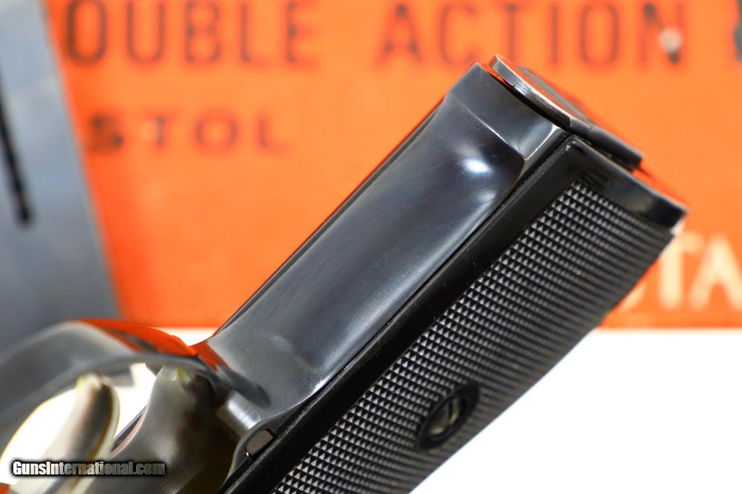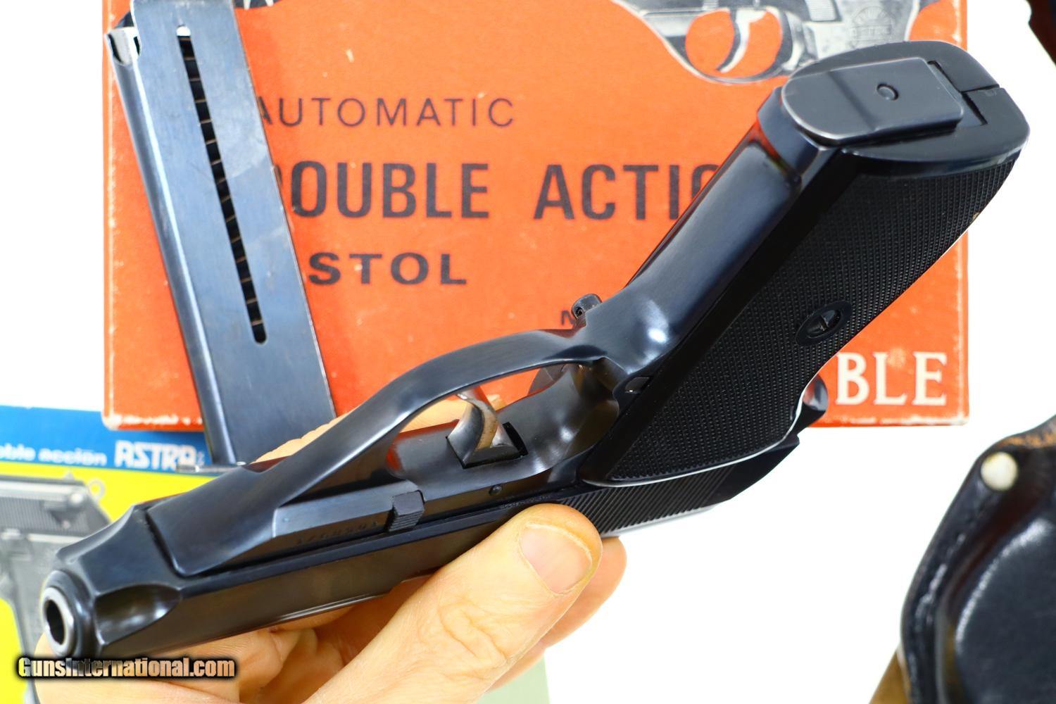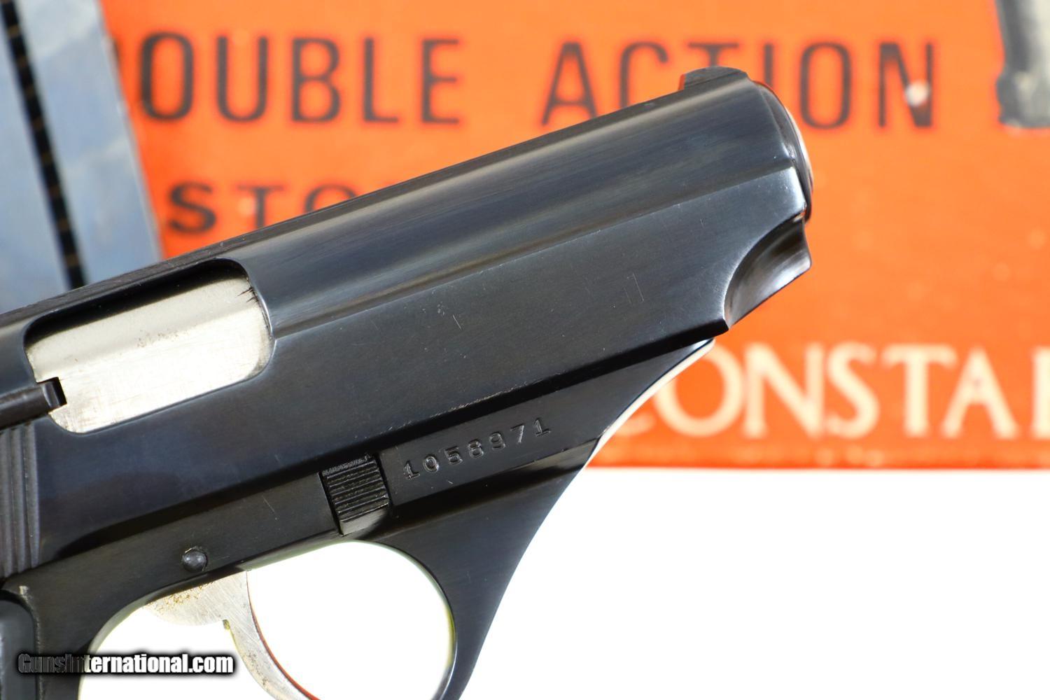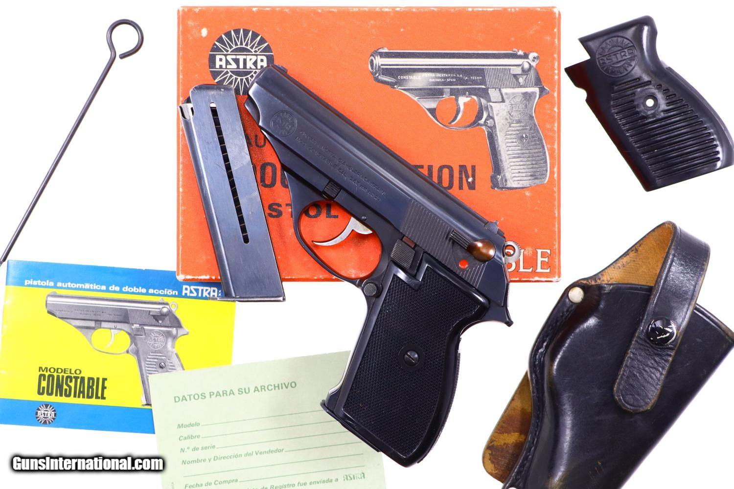 Description: Astra M5000 Constable made in 1971, high polish blue in seldom encountered 7.65mm caliber. Standard configuration with fixed front sight and drift adjustable rear sight. Left side of slide with usual two line address reflecting manufacturer, model, and caliber. 3.5" barrel. No importer marking on slide. Full serial number on the right side of frame. Black checkered plastic grips, each panel secured with a single screw. Correct unmarked magazines. Complete with cleaning rod, instruction booklet, warranty card, spare left panel, holster, in factory matching shipping box. Identical to the example shown in Astra Firearms & Selected Competitors on page 484. Synopsis: Astra M5000 Constable, 7.65mm, excellent in box, made 1971, CNR eligible. Condition: Excellent with 99% original, high polish blue and immaculate black grips. Mirror bore. Perfect manual mechanics. A nice complement of accessories including the spare magazine and original factory matching box. ~~Insured shipping fee of $45; most packages shipped using FedEx 2nd Day.~~ SOLD Manufacturer: Astra Serial Number: 1058971 Caliber Info: 7.65mm |