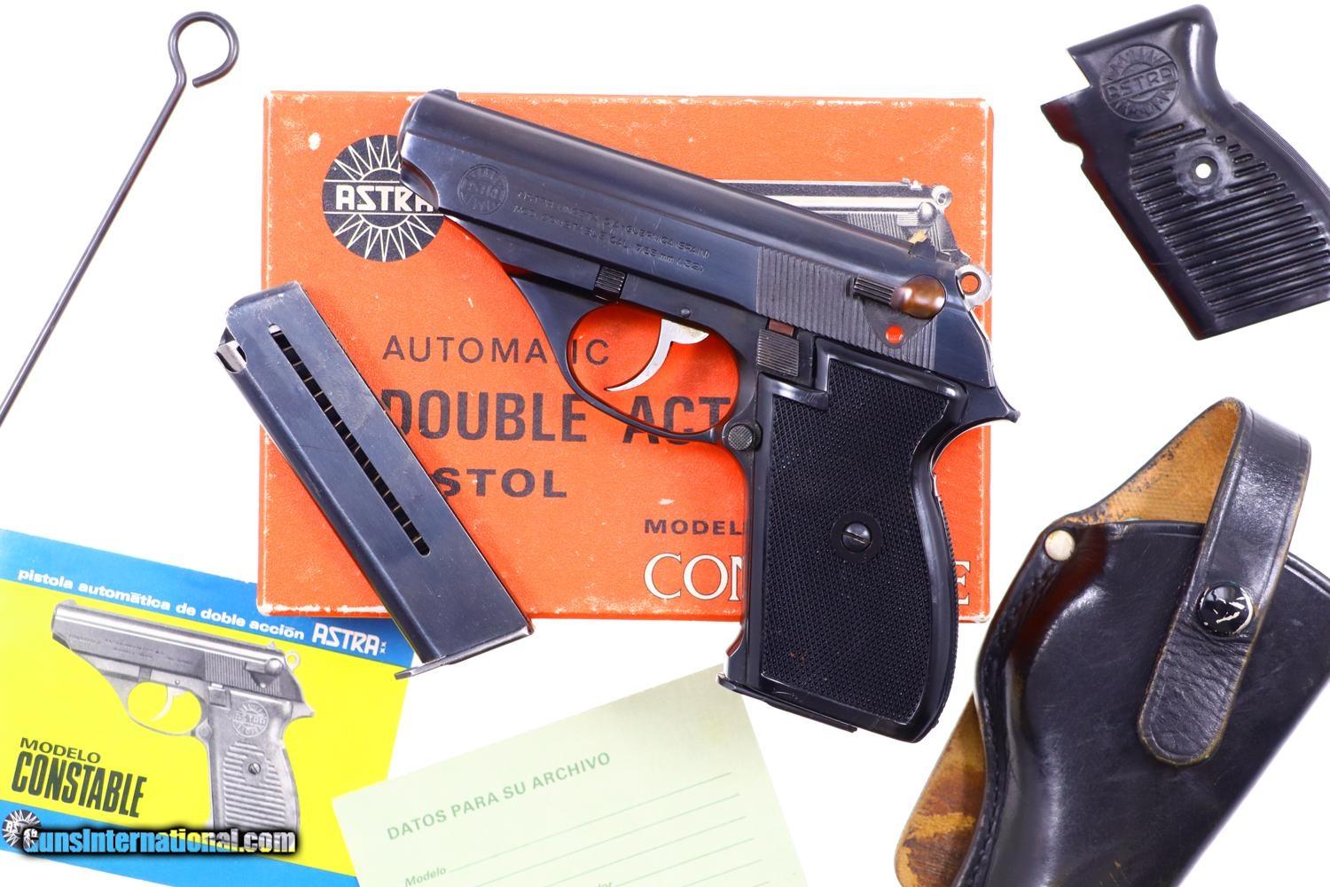 Description: Astra M5000 Constable made in 1971, high polish blue in seldom encountered 7.65mm caliber. Standard configuration with fixed front sight and drift adjustable rear sight. Left side of slide with usual two line address reflecting manufacturer, model, and caliber. 3.5" barrel. No importer marking on slide. Full serial number on the right side of frame. Black checkered plastic grips, each panel secured with a single screw. Correct unmarked magazines. Complete with cleaning rod, instruction booklet, warranty card, spare left panel, holster, in factory matching shipping box. Identical to the example shown in Astra Firearms & Selected Competitors on page 484. Synopsis: Astra M5000 Constable, 7.65mm, excellent in box, made 1971, CNR eligible. Condition: Excellent with 99% original, high polish blue and immaculate black grips. Mirror bore. Perfect manual mechanics. A nice complement of accessories including the spare magazine and original factory matching box. ~~Insured shipping fee of $45; most packages shipped using FedEx 2nd Day.~~ SOLD Manufacturer: Astra Serial Number: 1058971 Caliber Info: 7.65mm |