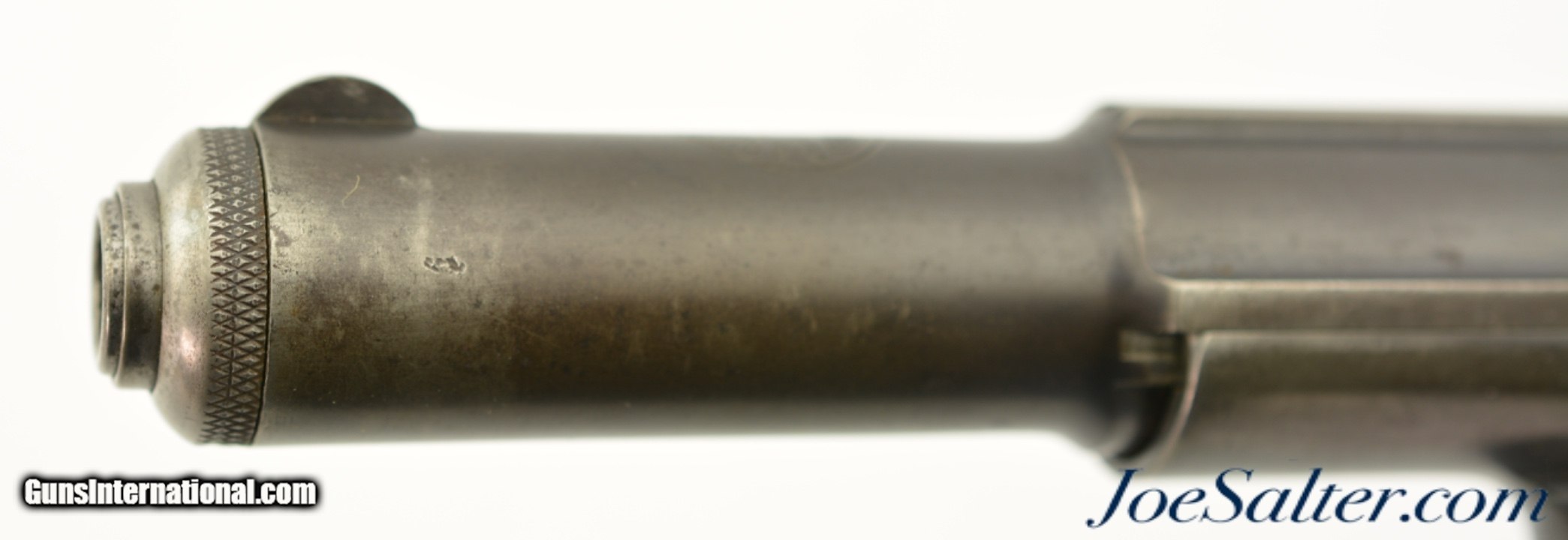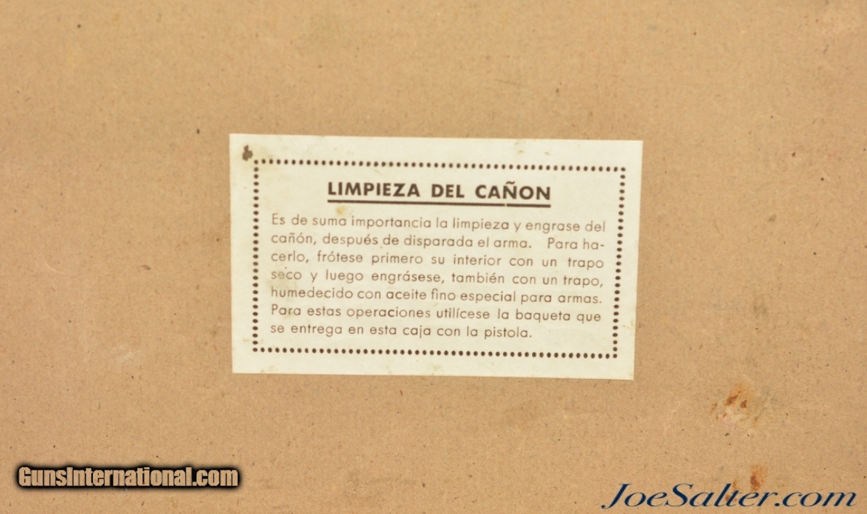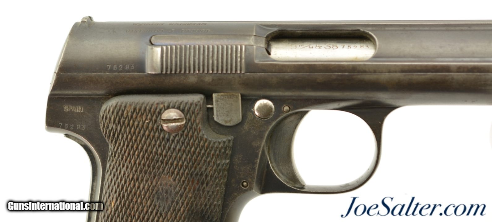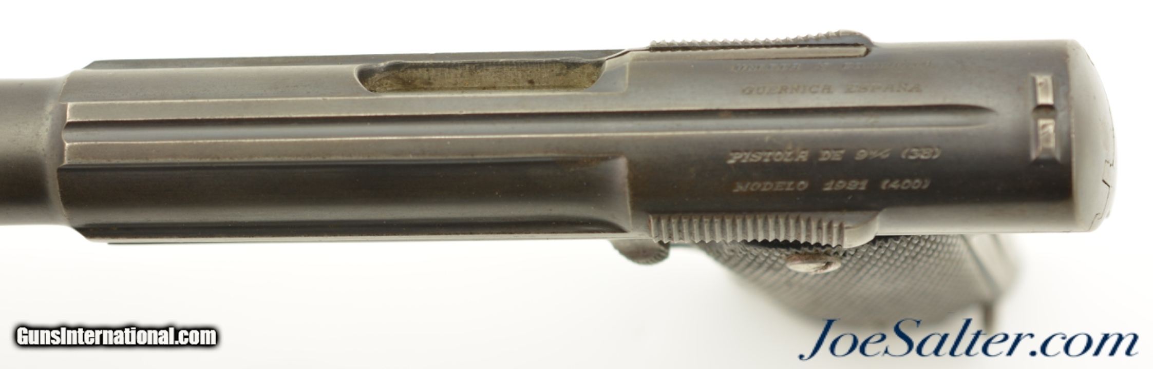 Description: Serial #75283, 9mm Largo (9 x 23mm), 5 7/8" barrel with a very good bore that has some light freckling within the grooves. This pistol has matching numbers on the frame, slide, and barrel with the metal retaining 90-92% of the original blue finish. Mild fading and silvering is present at the muzzle, as well as along the bearing surfaces and projecting edges. Additionally, there are scattered spots of freckling, mostly along the gripframe. Faint traces of the original straw color remains on the slide lock and trigger, which are now mostly freckled gray. The checkered walnut grips are in about good-very good shape; intact but with some flattening of the points and wear at the top and bottom of the panels. A single original magazine is included. The pistol is housed in the original numbered cardboard box along with the original instruction booklet. The box is in fair-good shape, and has edge and corner damage on the lid. This is a neat Spanish pistol and is in excellent condition overall. FFL or C&R SOLD Curio/Relic: Yes |