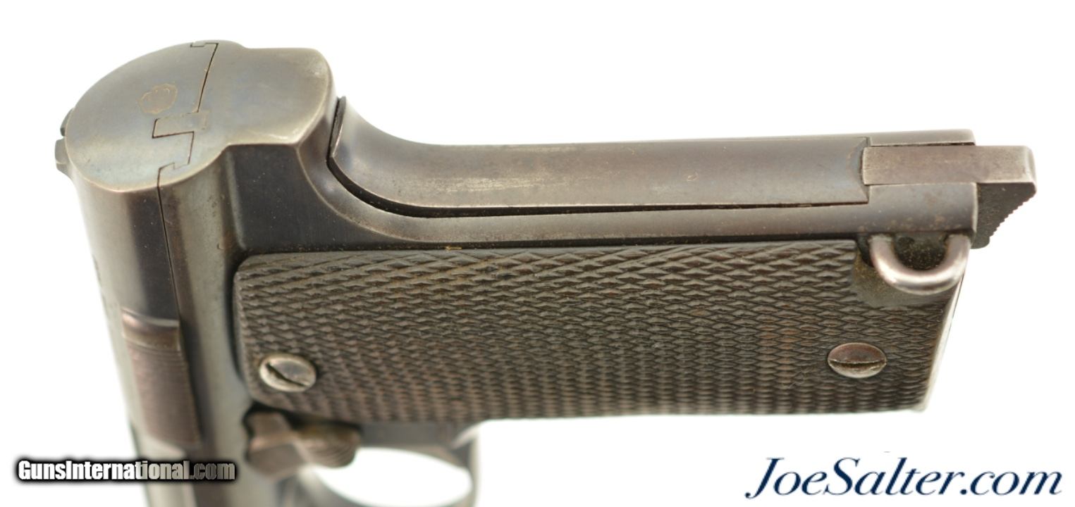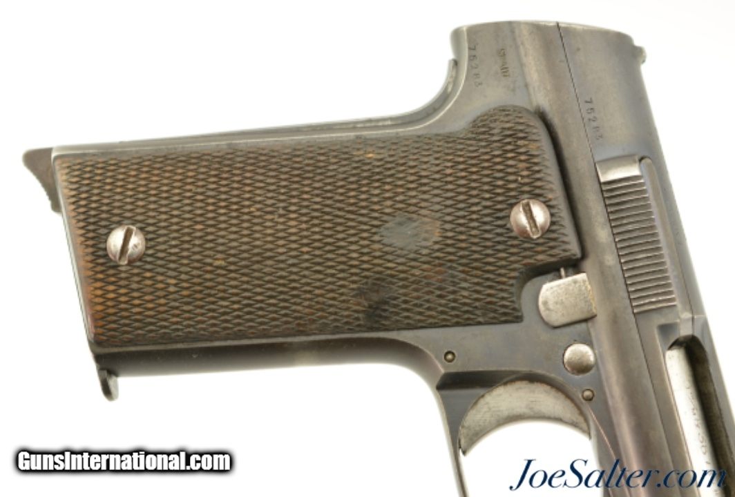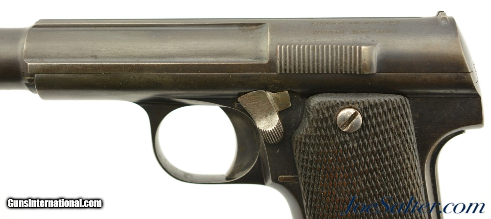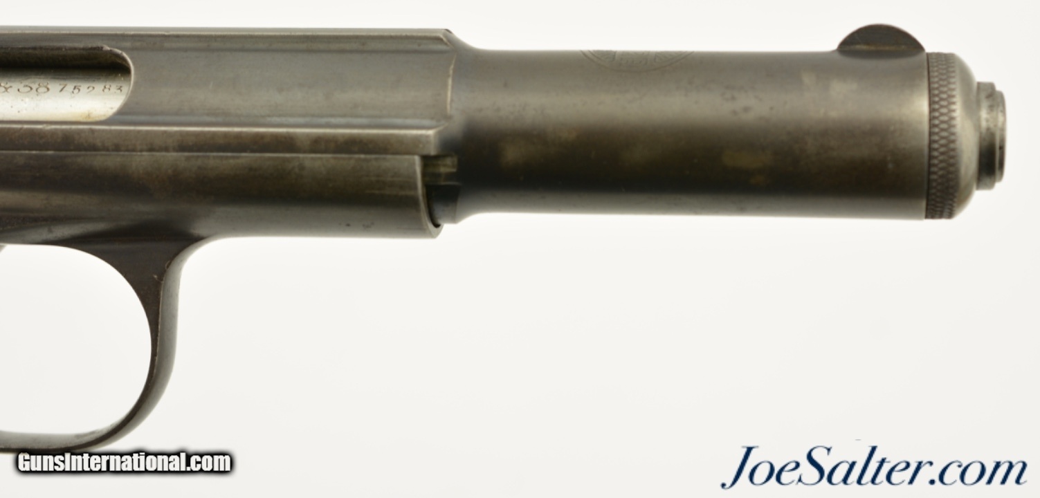 Description: Serial #75283, 9mm Largo (9 x 23mm), 5 7/8" barrel with a very good bore that has some light freckling within the grooves. This pistol has matching numbers on the frame, slide, and barrel with the metal retaining 90-92% of the original blue finish. Mild fading and silvering is present at the muzzle, as well as along the bearing surfaces and projecting edges. Additionally, there are scattered spots of freckling, mostly along the gripframe. Faint traces of the original straw color remains on the slide lock and trigger, which are now mostly freckled gray. The checkered walnut grips are in about good-very good shape; intact but with some flattening of the points and wear at the top and bottom of the panels. A single original magazine is included. The pistol is housed in the original numbered cardboard box along with the original instruction booklet. The box is in fair-good shape, and has edge and corner damage on the lid. This is a neat Spanish pistol and is in excellent condition overall. FFL or C&R SOLD Curio/Relic: Yes |