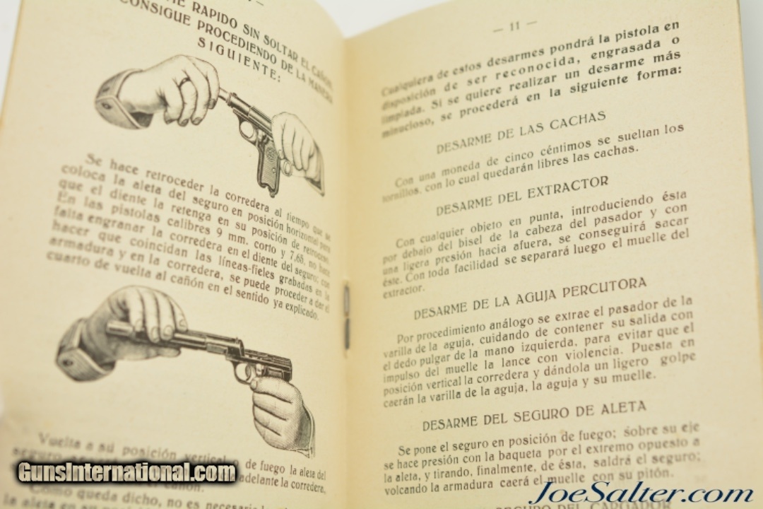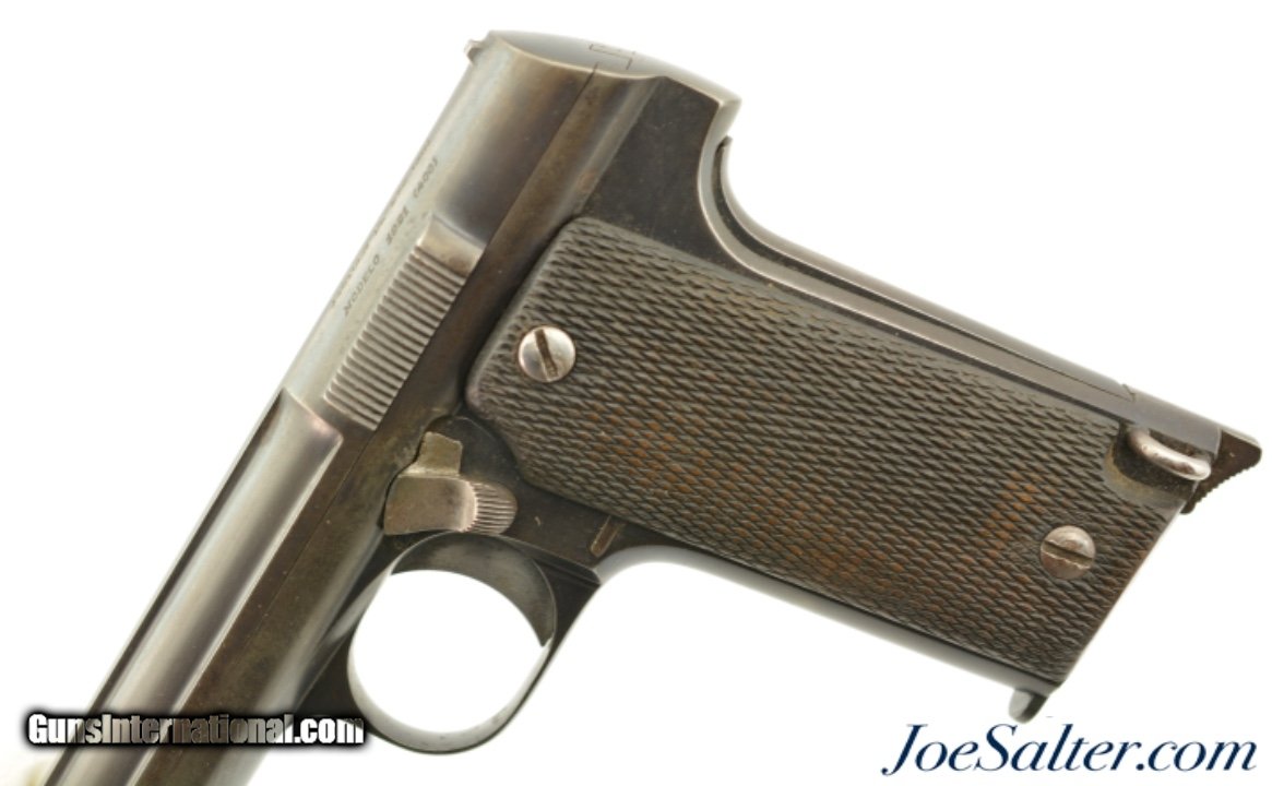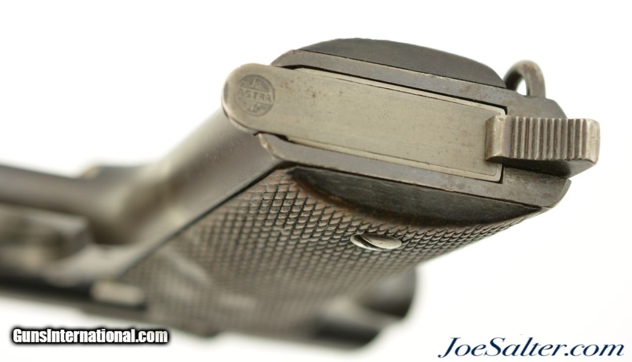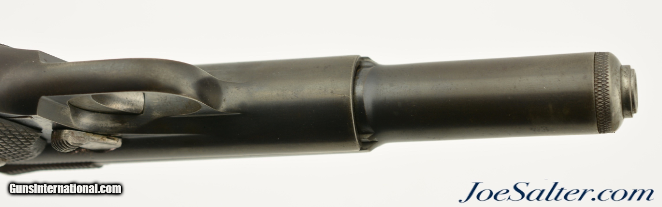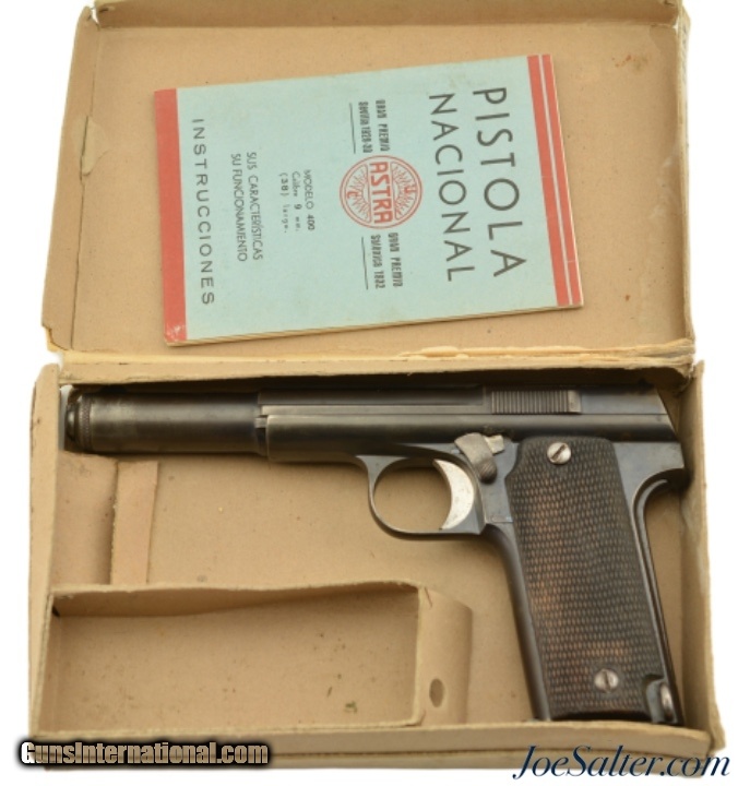 Description: Serial #75283, 9mm Largo (9 x 23mm), 5 7/8" barrel with a very good bore that has some light freckling within the grooves. This pistol has matching numbers on the frame, slide, and barrel with the metal retaining 90-92% of the original blue finish. Mild fading and silvering is present at the muzzle, as well as along the bearing surfaces and projecting edges. Additionally, there are scattered spots of freckling, mostly along the gripframe. Faint traces of the original straw color remains on the slide lock and trigger, which are now mostly freckled gray. The checkered walnut grips are in about good-very good shape; intact but with some flattening of the points and wear at the top and bottom of the panels. A single original magazine is included. The pistol is housed in the original numbered cardboard box along with the original instruction booklet. The box is in fair-good shape, and has edge and corner damage on the lid. This is a neat Spanish pistol and is in excellent condition overall. FFL or C&R SOLD Curio/Relic: Yes |