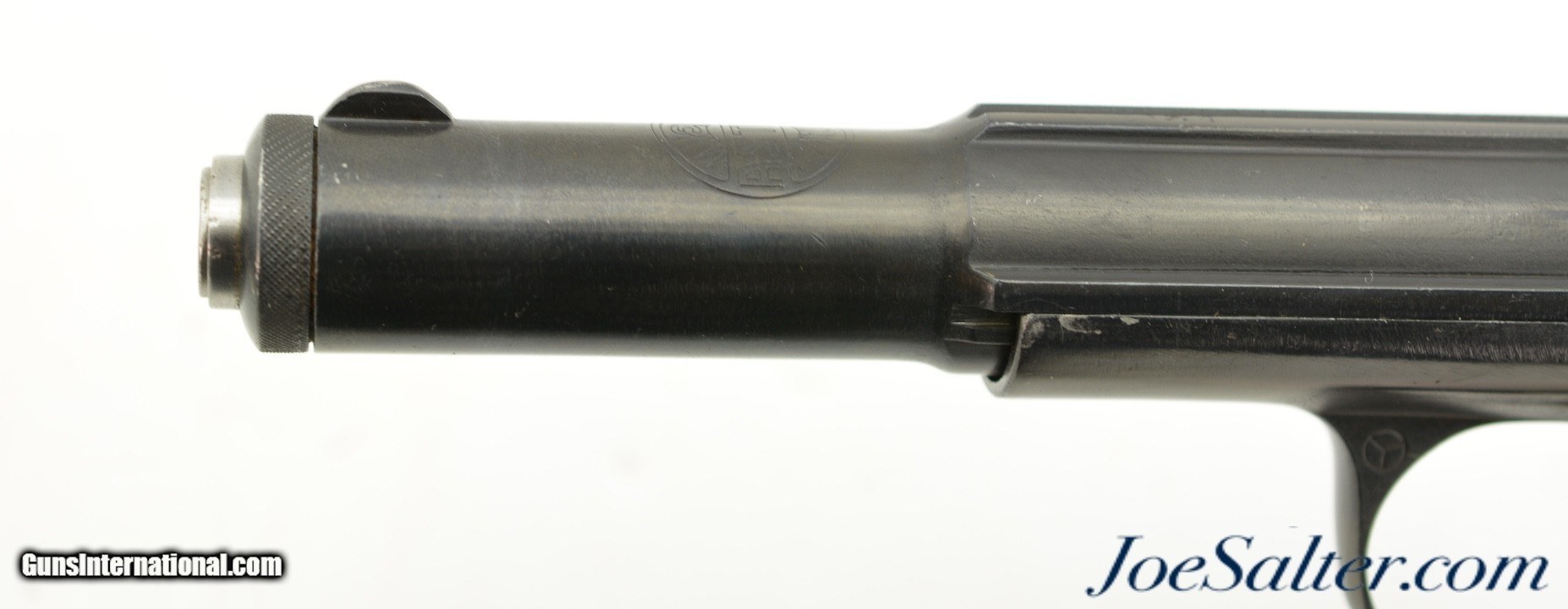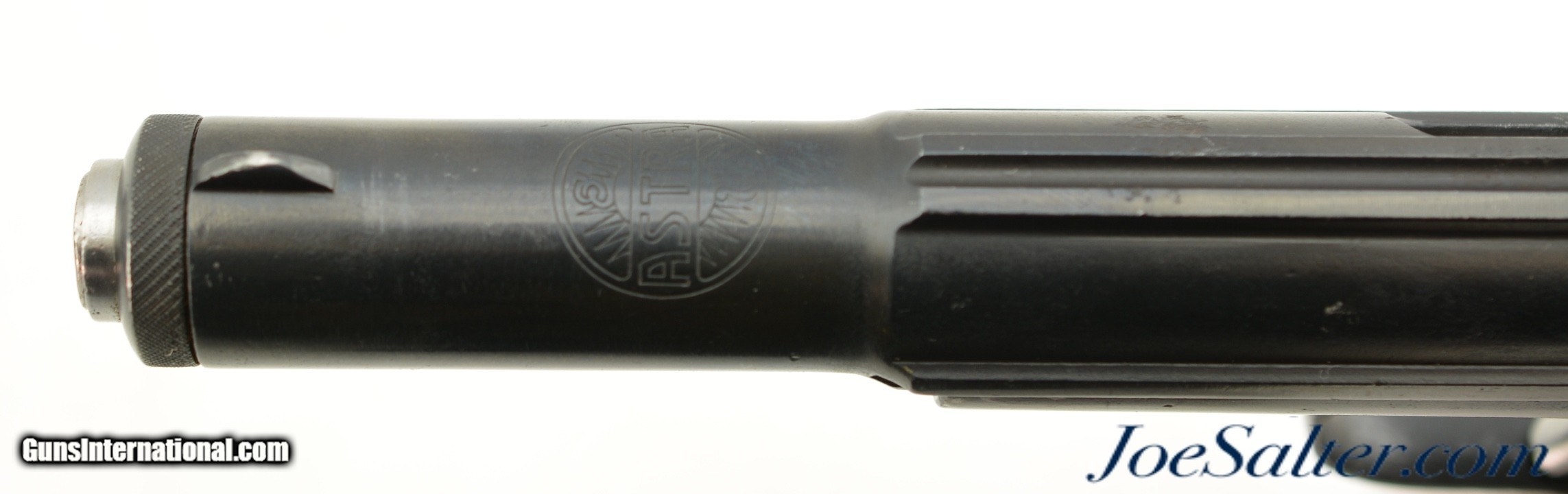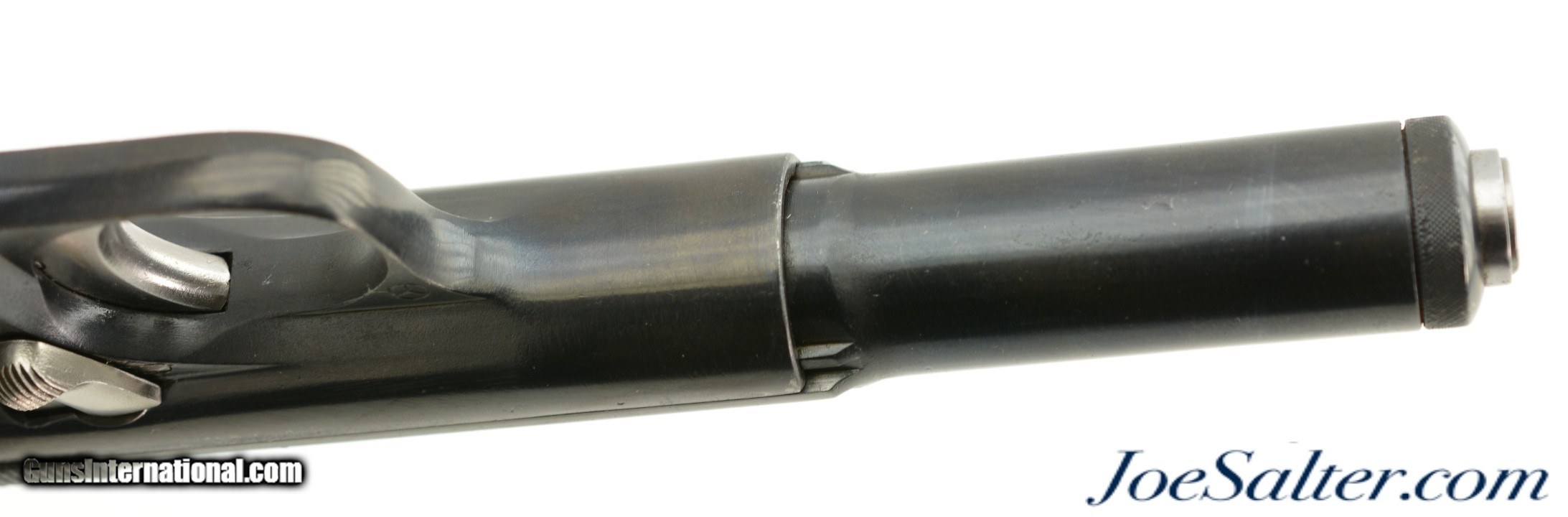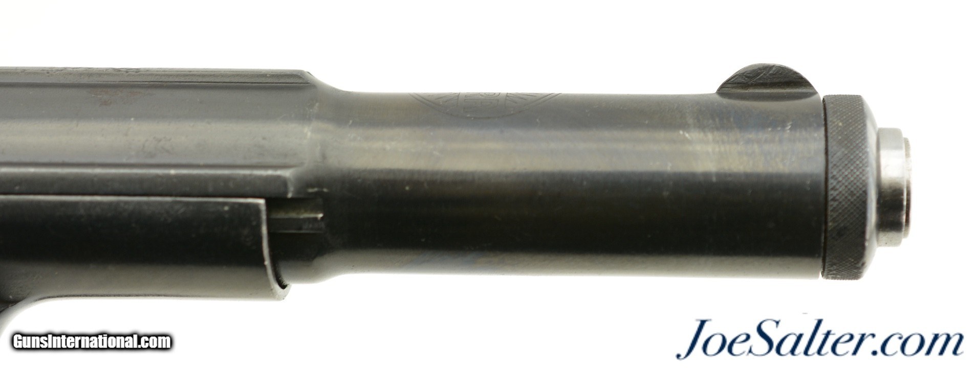 Description: Serial #25889, 9mm Largo (9x23mm), 6" barrel with a very good, bright bore that has some mild freckling within the grooves. This is a handsome pistol that has matching numbers on the frame, slide, and barrel. The metal retains about 97-98% of an armory reblued finish over some scattered small patches of pinprick pitting and minor handling marks. The original markings are still quite crisp and legible, and there are US import marks present on the rear of the frame. The barrel and safety switch are predominantly gray, with some mottling starting to form on each. The checkered wooden grips are in good shape, with minor handling marks and blemishes on either side, as well as flattening to the points on either panel. One of the grip screws is a replacement. The pistol is housed in an original black leather Spanish flap holster with two magazines. No cleaning rod is present in the rear pocket. This is a very good example of a large frame "water pistol" Astra, and would make a neat addition to a collection. FFL or C&R Curio/Relic: Yes Price: $650.00 Contact Seller |