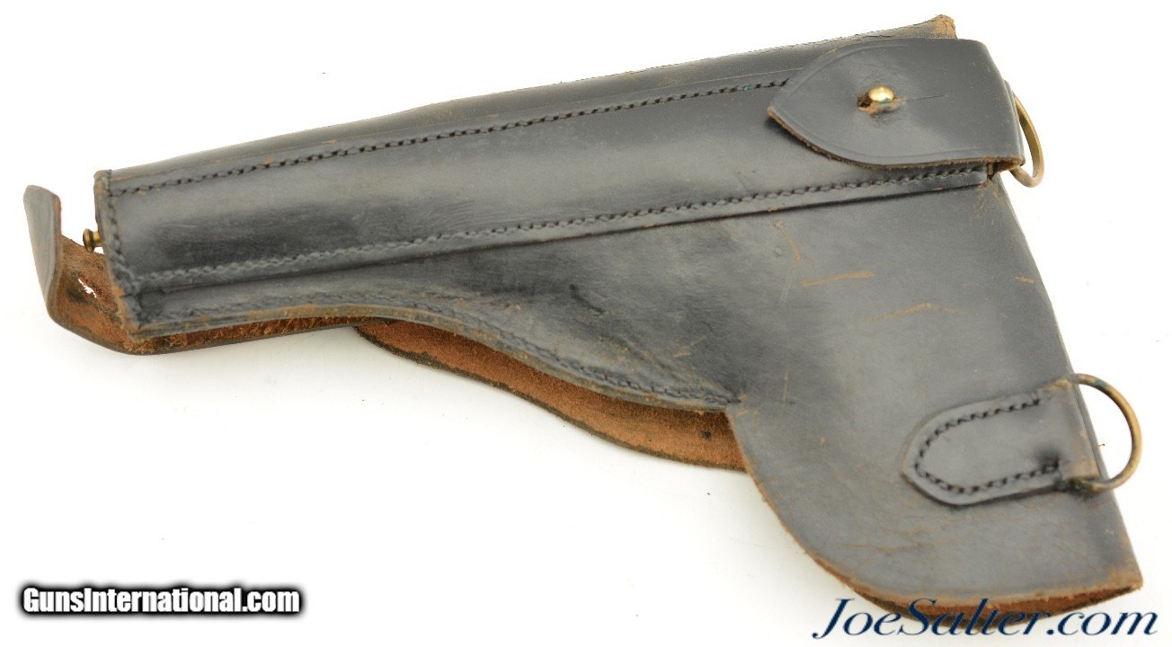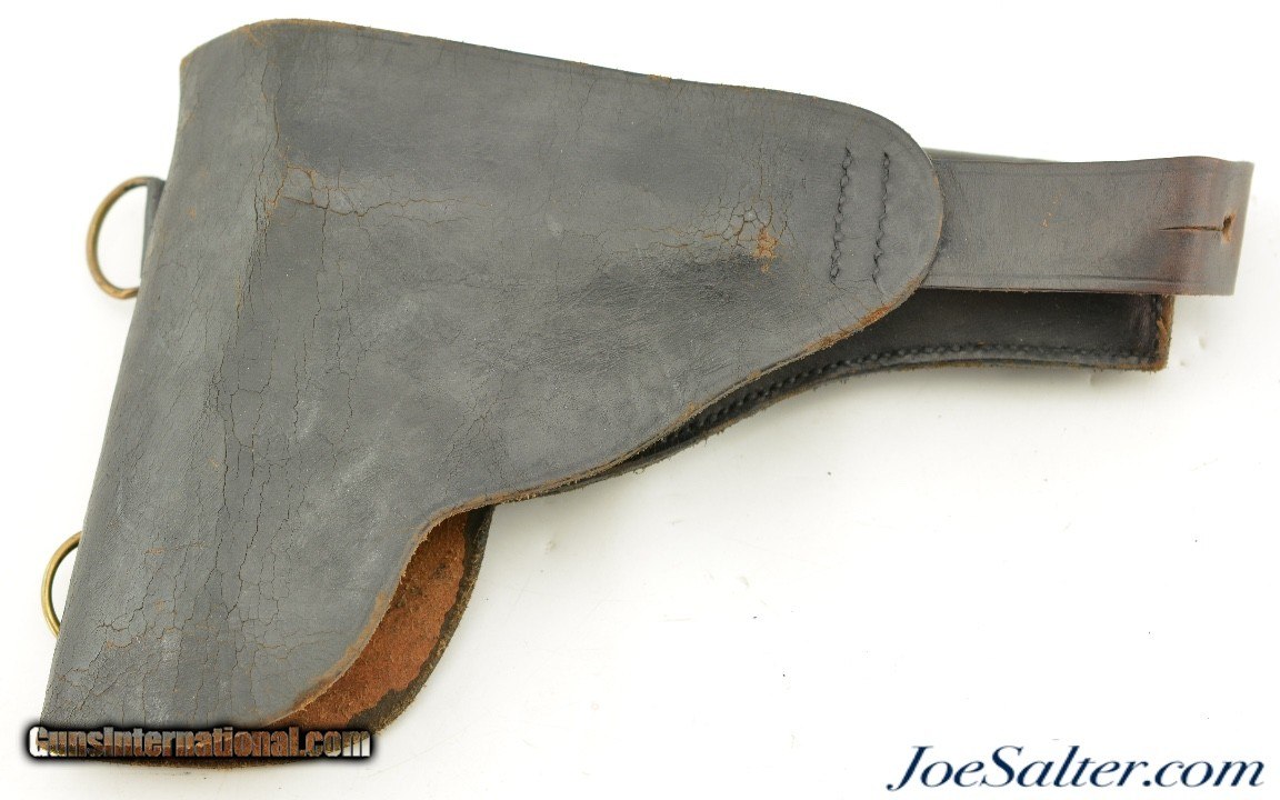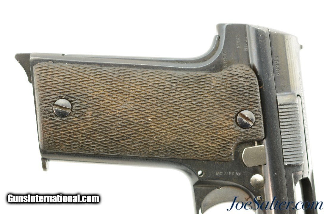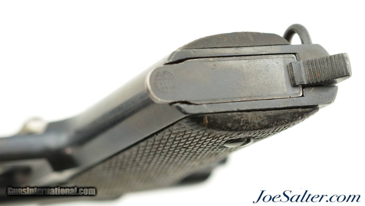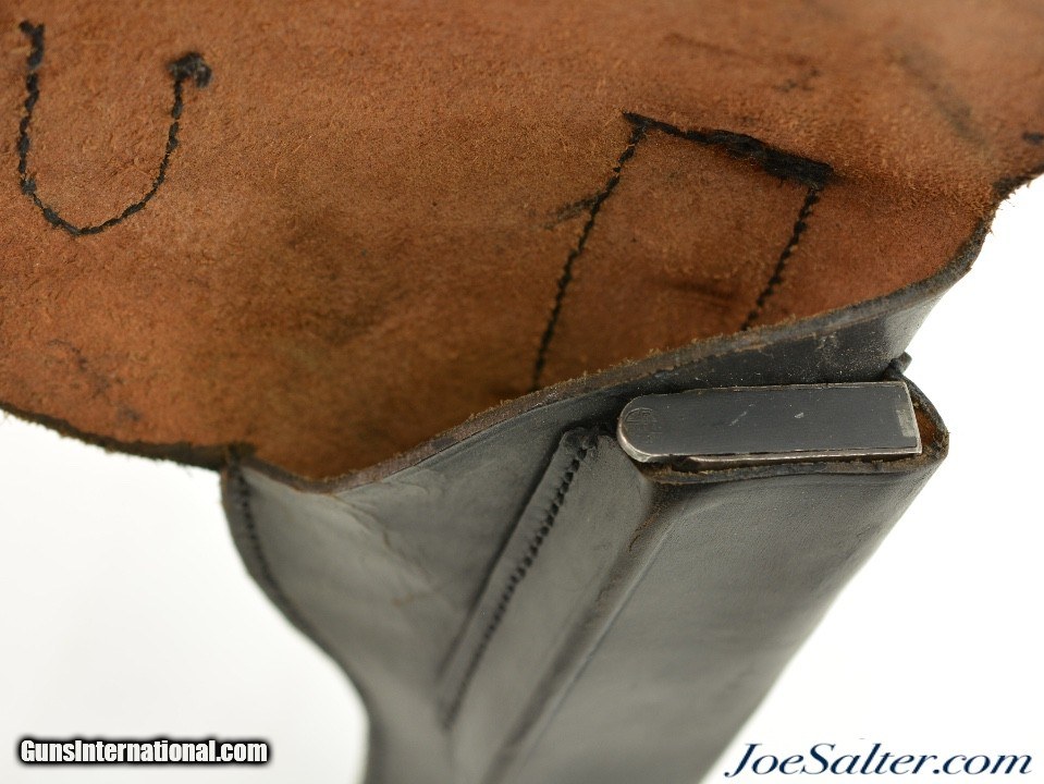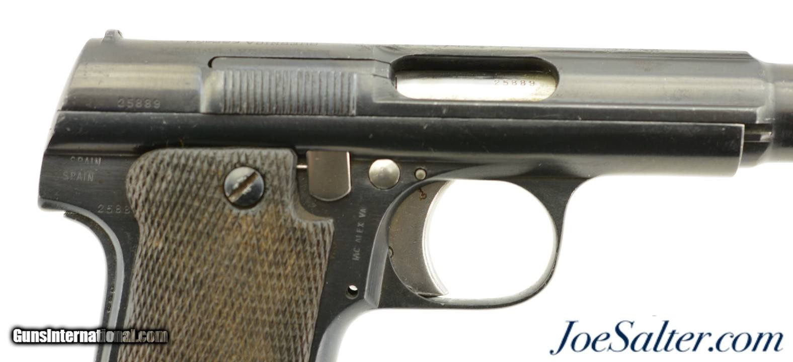 Description: Serial #25889, 9mm Largo (9x23mm), 6" barrel with a very good, bright bore that has some mild freckling within the grooves. This is a handsome pistol that has matching numbers on the frame, slide, and barrel. The metal retains about 97-98% of an armory reblued finish over some scattered small patches of pinprick pitting and minor handling marks. The original markings are still quite crisp and legible, and there are US import marks present on the rear of the frame. The barrel and safety switch are predominantly gray, with some mottling starting to form on each. The checkered wooden grips are in good shape, with minor handling marks and blemishes on either side, as well as flattening to the points on either panel. One of the grip screws is a replacement. The pistol is housed in an original black leather Spanish flap holster with two magazines. No cleaning rod is present in the rear pocket. This is a very good example of a large frame "water pistol" Astra, and would make a neat addition to a collection. FFL or C&R Curio/Relic: Yes Price: $650.00 Contact Seller |
