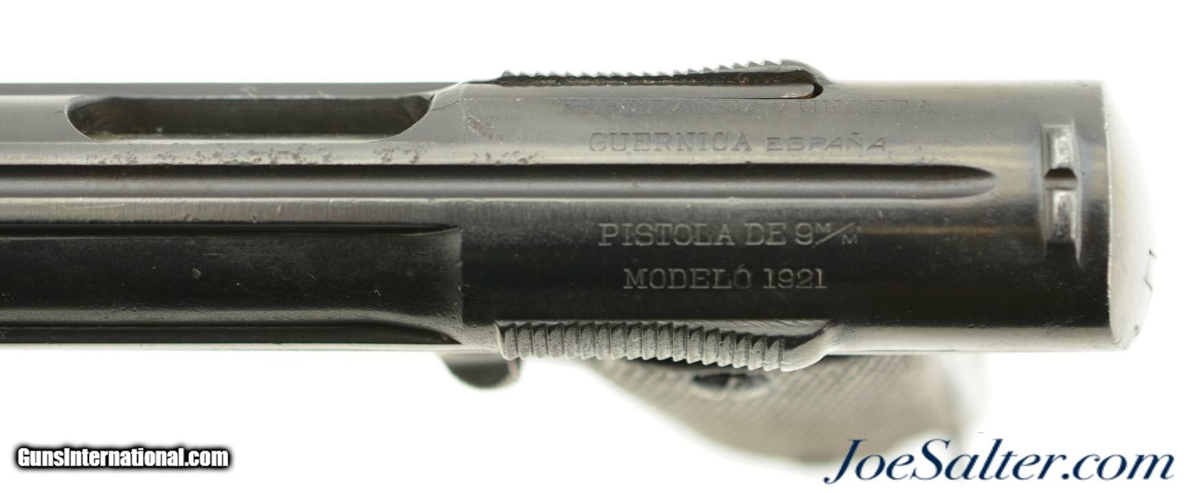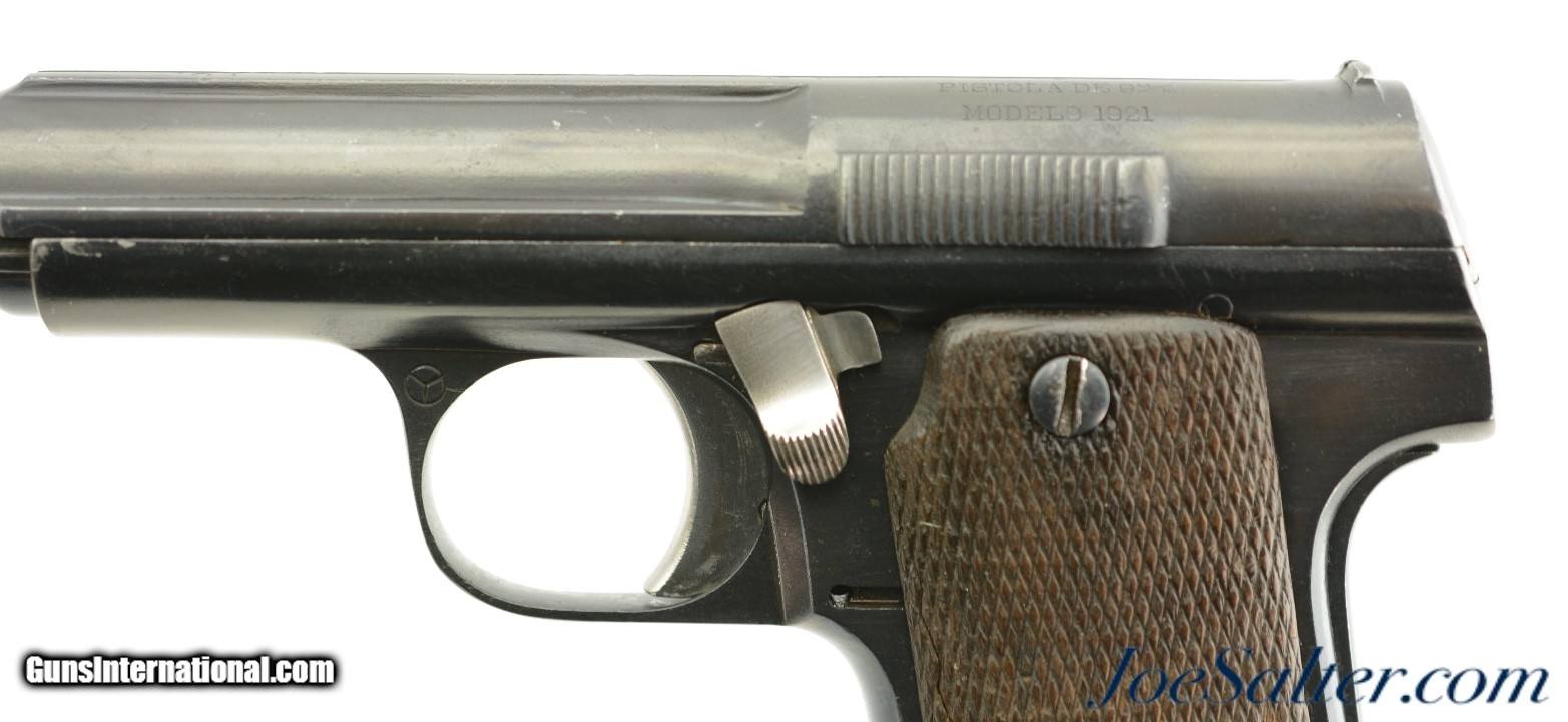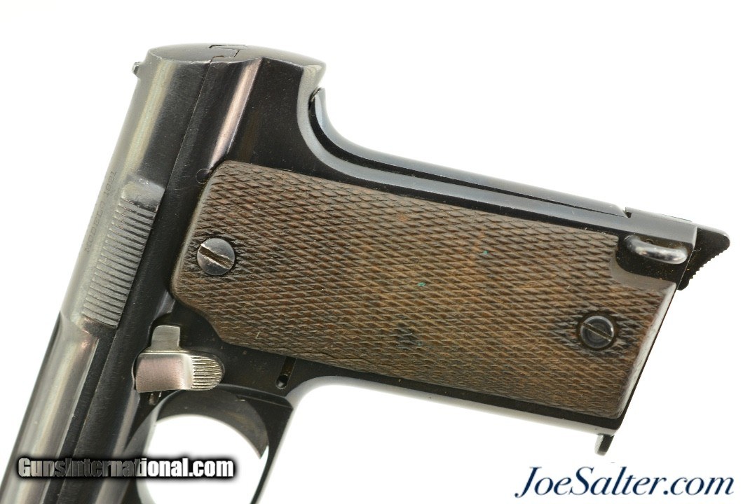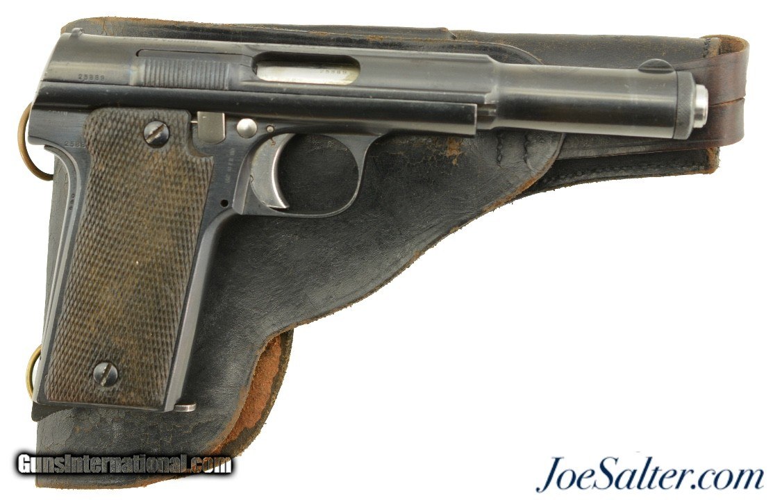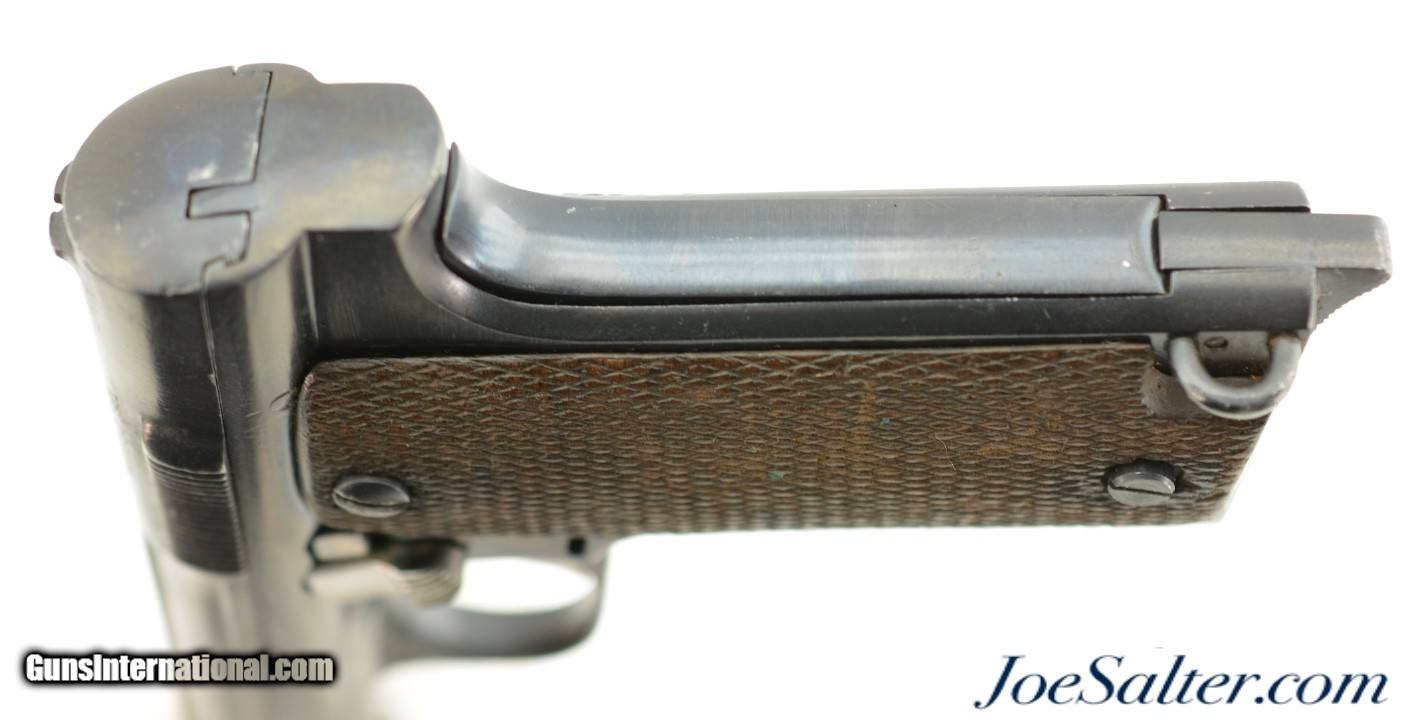 Description: Serial #25889, 9mm Largo (9x23mm), 6" barrel with a very good, bright bore that has some mild freckling within the grooves. This is a handsome pistol that has matching numbers on the frame, slide, and barrel. The metal retains about 97-98% of an armory reblued finish over some scattered small patches of pinprick pitting and minor handling marks. The original markings are still quite crisp and legible, and there are US import marks present on the rear of the frame. The barrel and safety switch are predominantly gray, with some mottling starting to form on each. The checkered wooden grips are in good shape, with minor handling marks and blemishes on either side, as well as flattening to the points on either panel. One of the grip screws is a replacement. The pistol is housed in an original black leather Spanish flap holster with two magazines. No cleaning rod is present in the rear pocket. This is a very good example of a large frame "water pistol" Astra, and would make a neat addition to a collection. FFL or C&R Curio/Relic: Yes Price: $650.00 Contact Seller |
