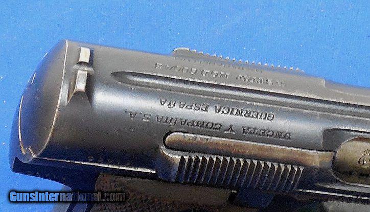 Description: Sold pending Funds / ASTRA Model 600/43 Semi-Auto Pistol. serial # 30919, cal. 9mm, with a 5” barrel and a very good bore showing just a little frosting. The metal surfaces of this pistol retain about 87%+ original blue with scattered fading and silvering of the high edges. The checkered grips are in very good condition with some flattening to the points. The frame and slide are matching and the pistol comes with its original magazines. This pistol as described and photographed remains in good plus - very good condition. Inv.:# 1-1340 SOLD Curio/Relic: Yes |