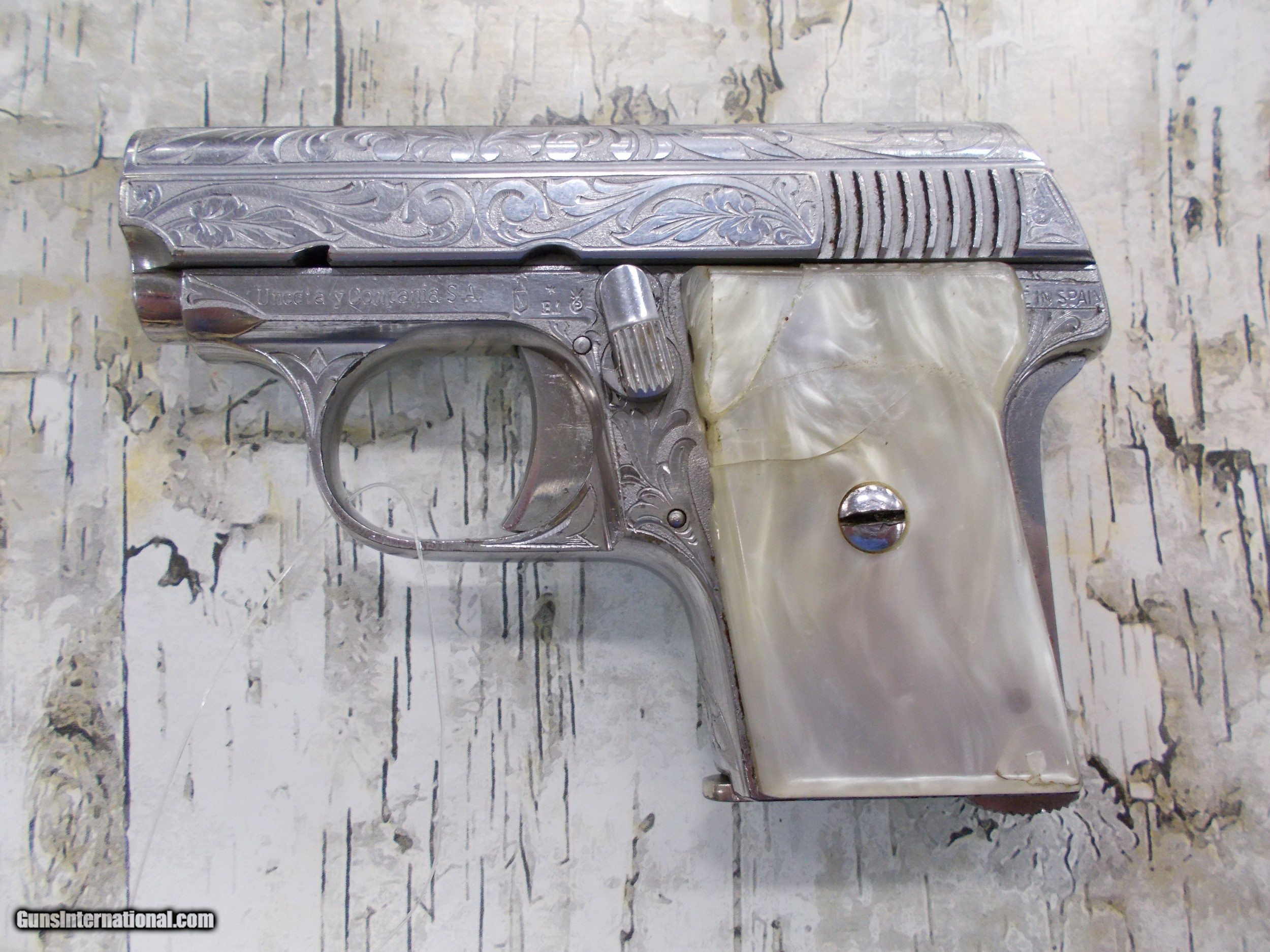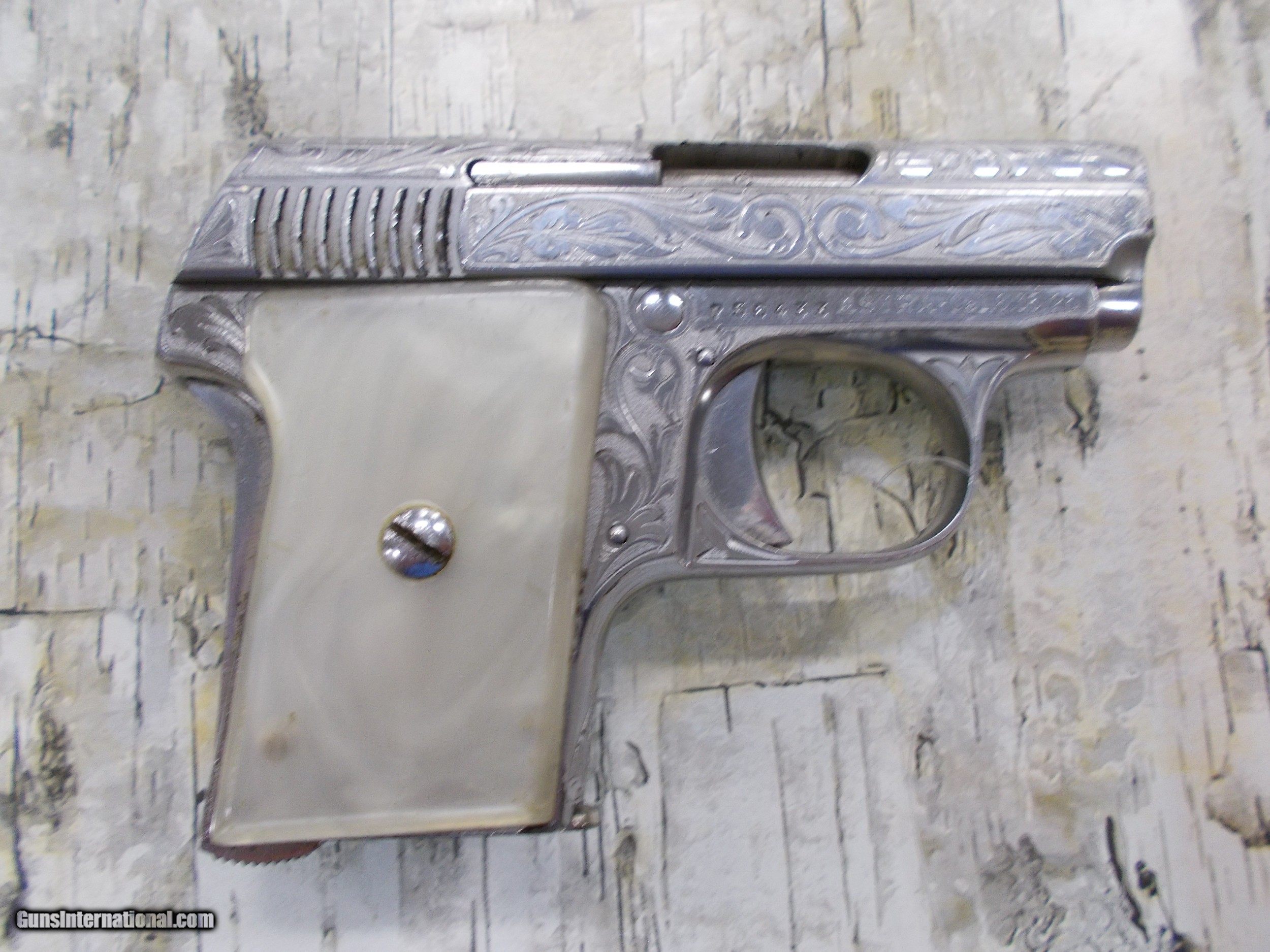 Description: HAVE A ENGRAVED ASTRA POCKET 25ACP NICKEL ENGRAVED MODEL HAS PEARLITE GRIPS [ CRACKED ] OVERALL CONDITION 90% NO BOX CALL TO ORDER AT 401 738 1889 SOLD |