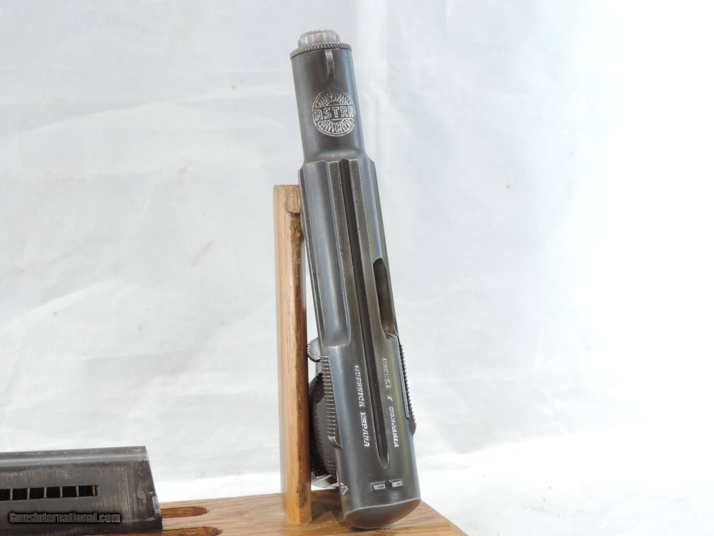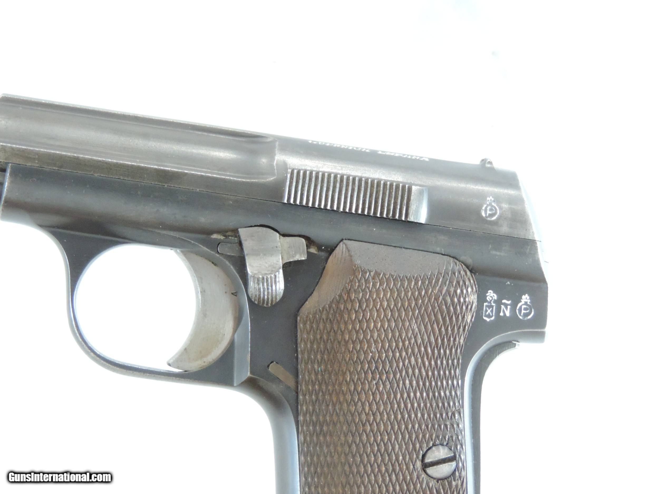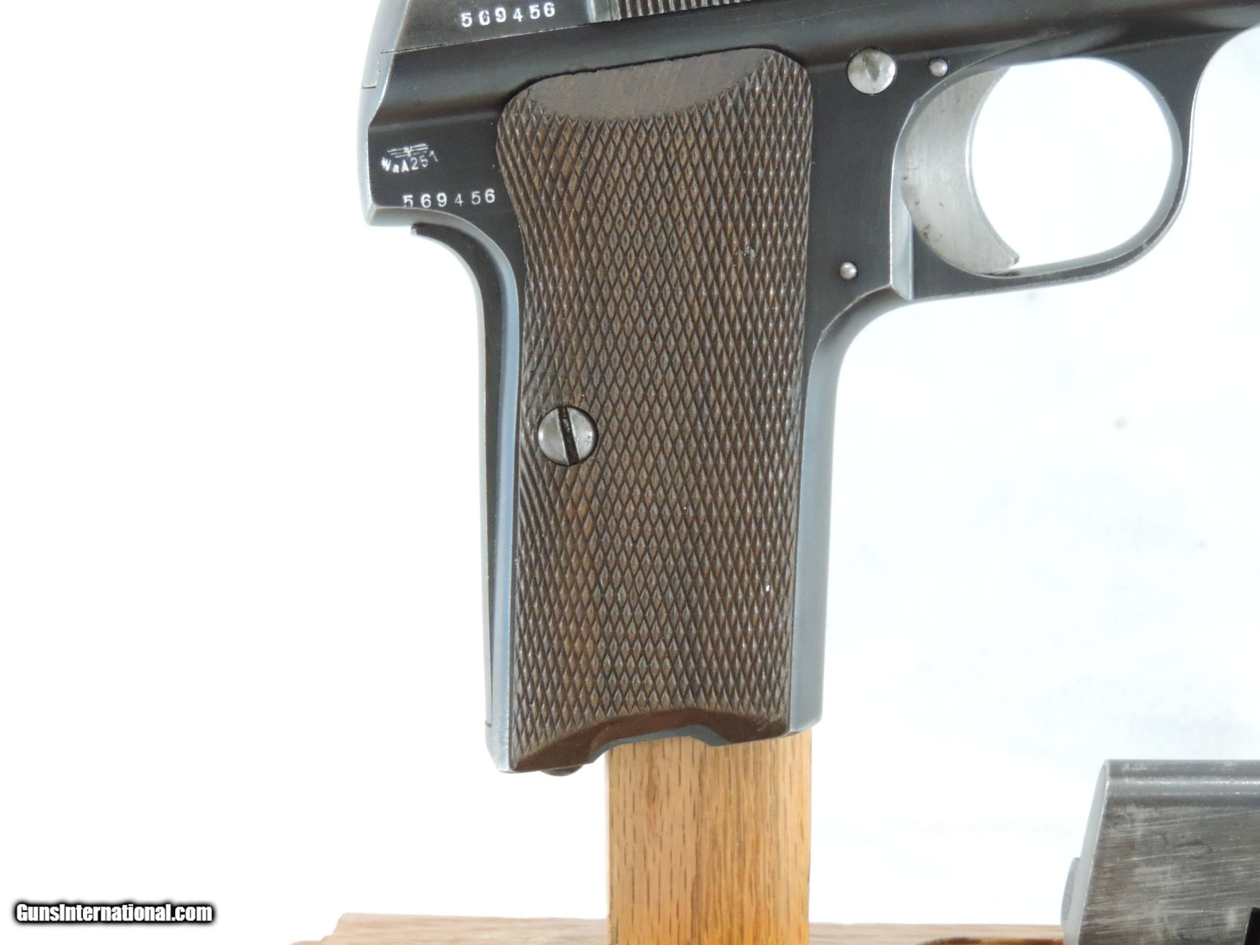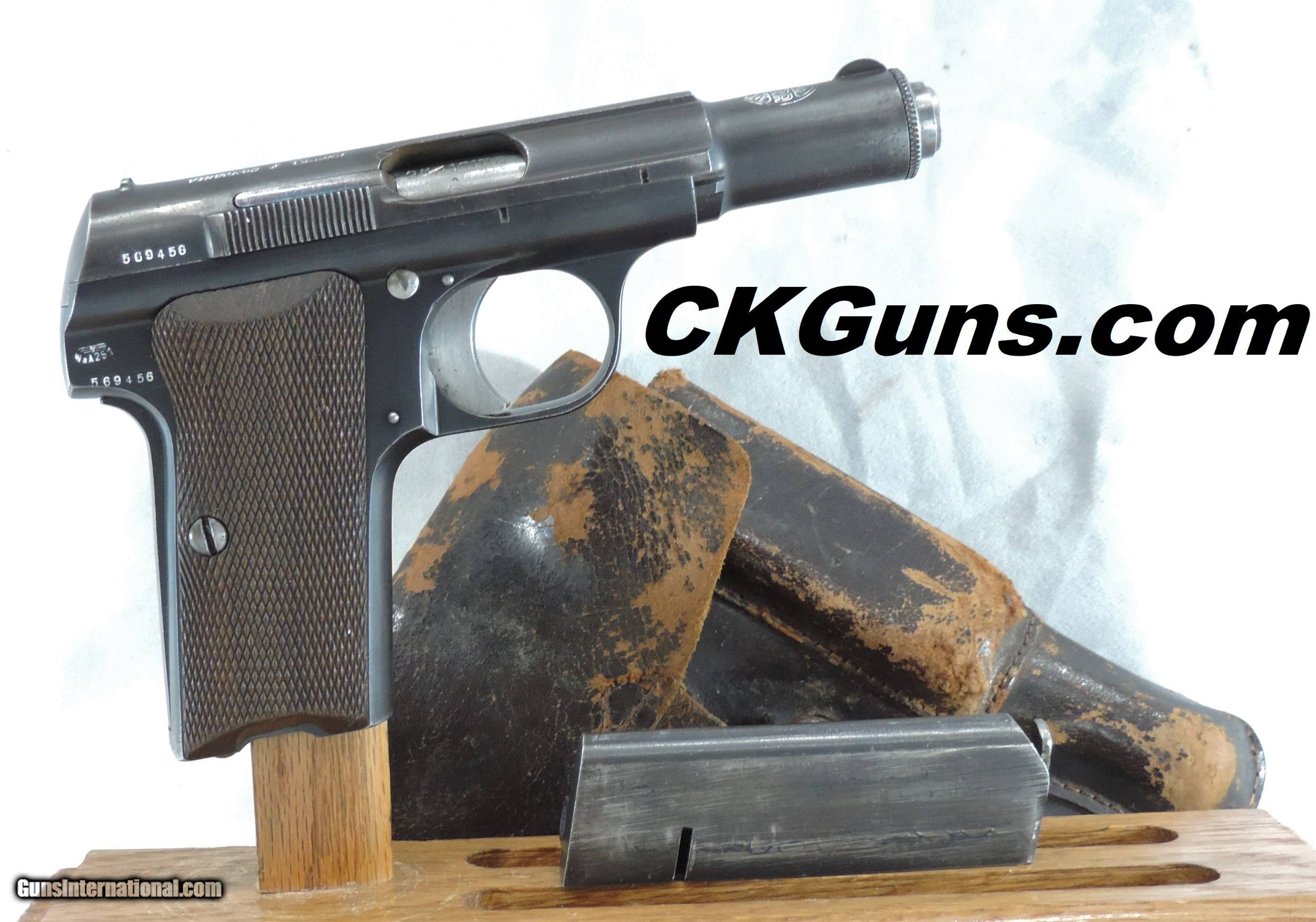 Description: INV 8216 NAZI ASTRA 300, CAL. 380, SER. 569456. THIS EARLY NAZI CONTRACT GUN HAS RETAINED 85+% OF THE ORIGNAL DULL WAR TIME FINISH. THE BULK OF THE LOSS IS DUE TO SOME SLIGHT THINNING, SHARP EDGE SILVERING AND A FEW SCATTERED PIN PRICKS. ALL FROM HOLSTER WEAR. THERE ARE NO RUST PATCHES, SCRATCHES OR RUB MARKS. ALL PARTS MATCH AND IT IS CORRECTLY STAMPED EAGLE/WaA351 ON THE RIGHT REAR. THE WOODEN GRIPS AND GRIP SCREWS ARE PERFECT. THE SLIDE RAILS, BOLT FACE AND FEED RAMP SHOW LITTLE IF ANY USE. THE BORE OF THIS "HOLSTER QUEEN" IS PRISTINE. MIRROR BRIGHT WITH RAZOR SHARP RIFLING. IT COMES WITH ONE CORRECT MAGAZINE AND THE ORIGINAL "300" WAR TATTERED HOLSTER WITH THE NAME "SCHMIDT" PENNED IN IT. THIS "300" RIG WOULD ENHANCE ANY COLLECTION. SOLD ***PURCHASE SATISFACTION GUARANTEED". To purchase this firearm or if you want to request more information contact us at: Email ckguns[at]ymail[dot]com Phone 201-512-0002 Cell 201-575-6838 FAX 201-215-4759 We accept most major credit cards. Prices shown are Discounted 3% for Cash or Check. The buyer must be familiar with all the laws governing the purchase and the ownership of firearms in their own city and state. The Yankee Armorer, Inc is not responsible for any failure to comply with or observe these laws. The Yankee Armorer, Inc will only ship after full payment and receipt of all required documents. Shipping: Add $35.00 for handguns, $45.00 for long guns. New Jersey buyers are subject to a 7% sales tax. The Yankee Armorer, Inc offers a 3 day inspection period with full refund upon return of intact firearm and in the original condition. The Yankee Armorer, Inc offers a no interest lay away program - 25% down; 25% in 30 days; 25% in 60 days; and full payment in 90 days. Any violation of this policy is subject to restocking and forfeiture of all payments. Any variation from this policy must be agreed to in advance. Unshipped Cancelled sales are subject to a 20% restocking fee. Be advised that all firearms sold by The Yankee Armorer, Inc. or the Gun Exchange, LLC (SELLER) are sold as collector’s items. They have not been fired or tested for safety and must be examined by a license gunsmith prior to use. By purchasing any item from the (SELLER), you are agreeing to hold the (SELLER) free from any damages or lawsuits of any nature. Any item left for transfer or storage will be charged to $25.00 per month, per item from the day of its receipt. Any variation from this policy must be agreed to in advance. Store hours 10:00 am to 5:00 pm Tuesday -Saturday. It's always best to call for appointment. Store 201-512-0002, cell 201-575-6838. SOLD Handgun Caliber: .380 ACP (9x17mm Browning Short) |