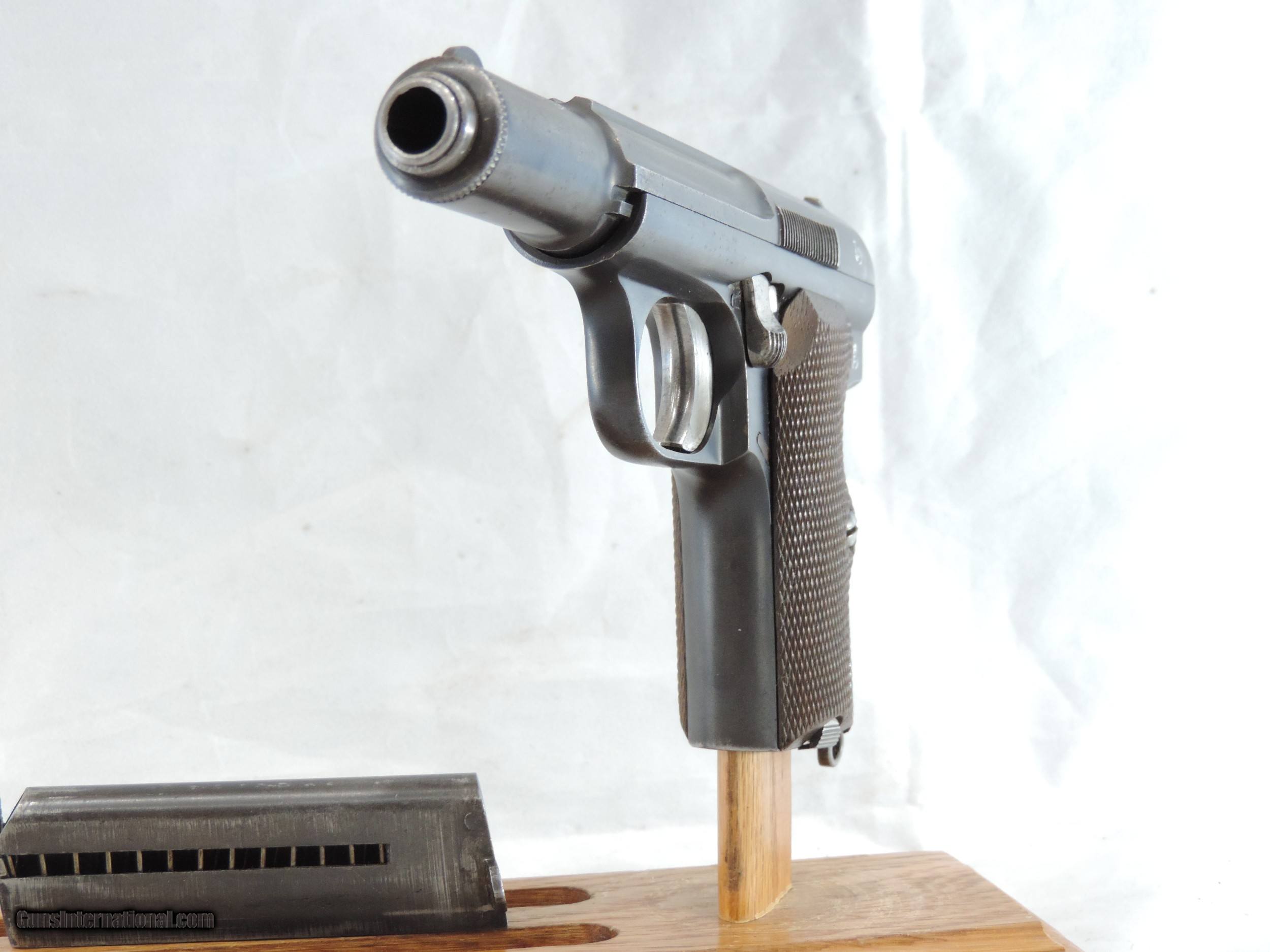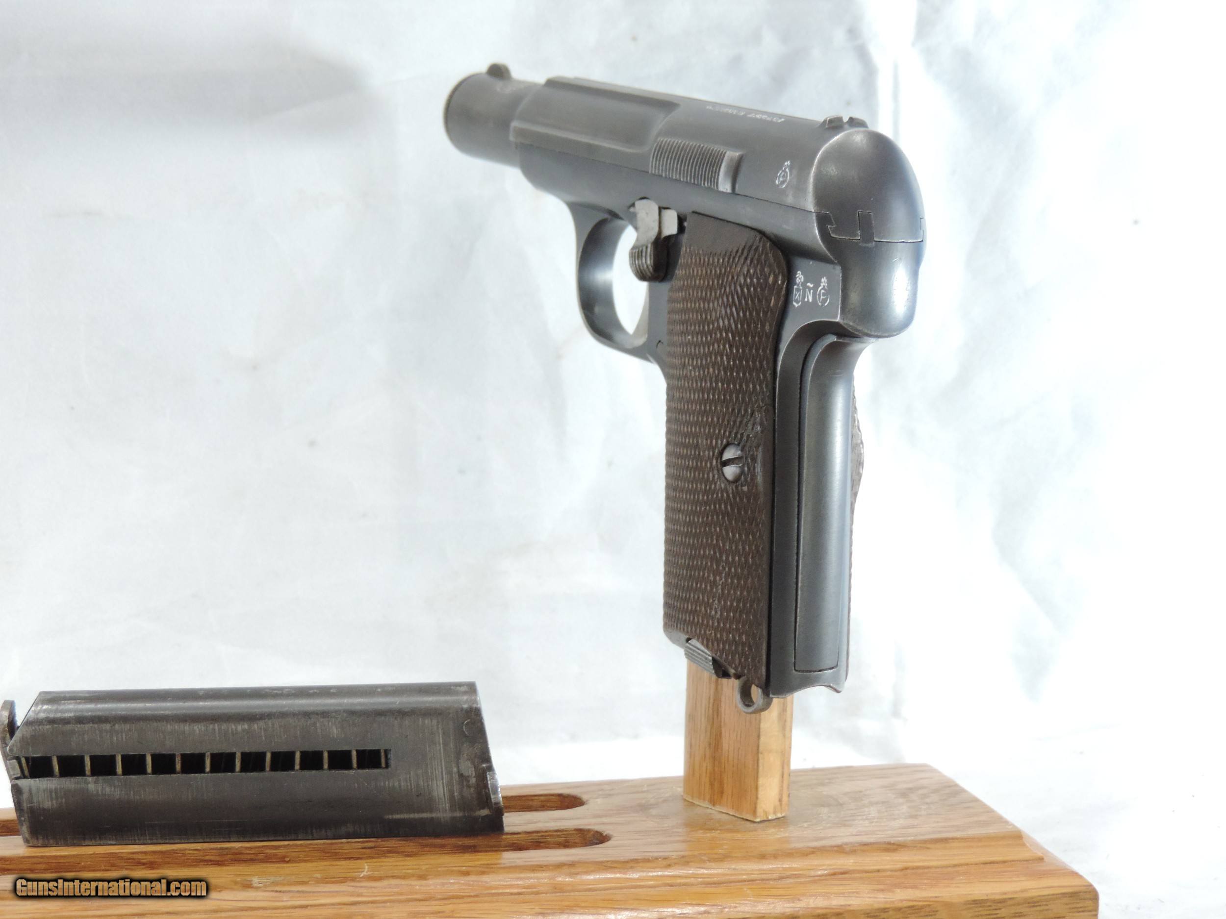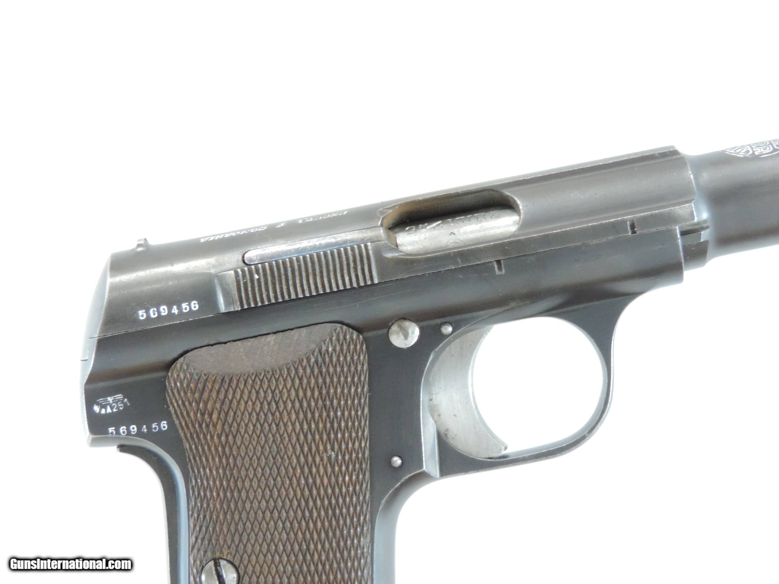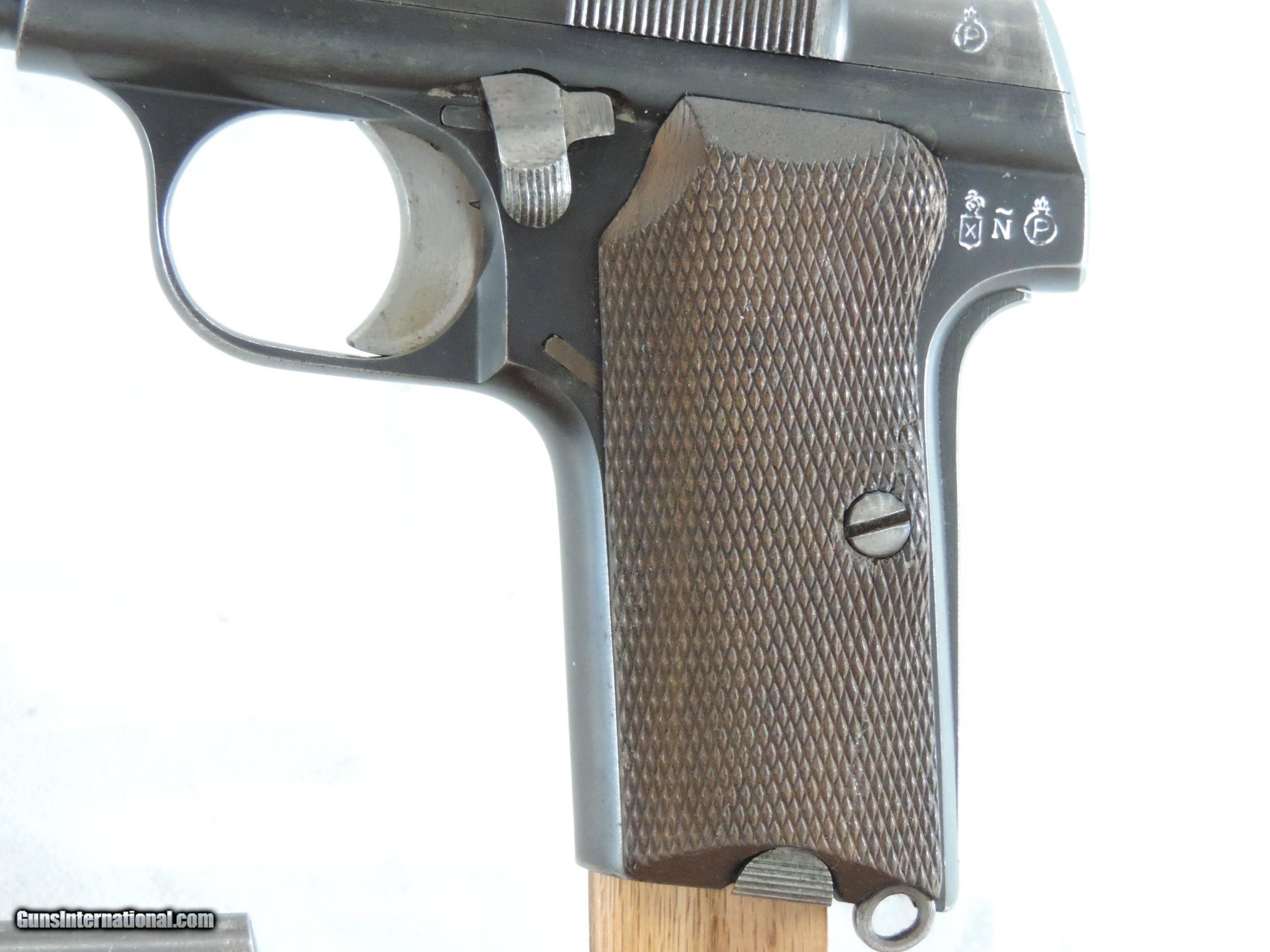 Description: INV 8216 NAZI ASTRA 300, CAL. 380, SER. 569456. THIS EARLY NAZI CONTRACT GUN HAS RETAINED 85+% OF THE ORIGNAL DULL WAR TIME FINISH. THE BULK OF THE LOSS IS DUE TO SOME SLIGHT THINNING, SHARP EDGE SILVERING AND A FEW SCATTERED PIN PRICKS. ALL FROM HOLSTER WEAR. THERE ARE NO RUST PATCHES, SCRATCHES OR RUB MARKS. ALL PARTS MATCH AND IT IS CORRECTLY STAMPED EAGLE/WaA351 ON THE RIGHT REAR. THE WOODEN GRIPS AND GRIP SCREWS ARE PERFECT. THE SLIDE RAILS, BOLT FACE AND FEED RAMP SHOW LITTLE IF ANY USE. THE BORE OF THIS "HOLSTER QUEEN" IS PRISTINE. MIRROR BRIGHT WITH RAZOR SHARP RIFLING. IT COMES WITH ONE CORRECT MAGAZINE AND THE ORIGINAL "300" WAR TATTERED HOLSTER WITH THE NAME "SCHMIDT" PENNED IN IT. THIS "300" RIG WOULD ENHANCE ANY COLLECTION. SOLD ***PURCHASE SATISFACTION GUARANTEED". To purchase this firearm or if you want to request more information contact us at: Email ckguns[at]ymail[dot]com Phone 201-512-0002 Cell 201-575-6838 FAX 201-215-4759 We accept most major credit cards. Prices shown are Discounted 3% for Cash or Check. The buyer must be familiar with all the laws governing the purchase and the ownership of firearms in their own city and state. The Yankee Armorer, Inc is not responsible for any failure to comply with or observe these laws. The Yankee Armorer, Inc will only ship after full payment and receipt of all required documents. Shipping: Add $35.00 for handguns, $45.00 for long guns. New Jersey buyers are subject to a 7% sales tax. The Yankee Armorer, Inc offers a 3 day inspection period with full refund upon return of intact firearm and in the original condition. The Yankee Armorer, Inc offers a no interest lay away program - 25% down; 25% in 30 days; 25% in 60 days; and full payment in 90 days. Any violation of this policy is subject to restocking and forfeiture of all payments. Any variation from this policy must be agreed to in advance. Unshipped Cancelled sales are subject to a 20% restocking fee. Be advised that all firearms sold by The Yankee Armorer, Inc. or the Gun Exchange, LLC (SELLER) are sold as collector’s items. They have not been fired or tested for safety and must be examined by a license gunsmith prior to use. By purchasing any item from the (SELLER), you are agreeing to hold the (SELLER) free from any damages or lawsuits of any nature. Any item left for transfer or storage will be charged to $25.00 per month, per item from the day of its receipt. Any variation from this policy must be agreed to in advance. Store hours 10:00 am to 5:00 pm Tuesday -Saturday. It's always best to call for appointment. Store 201-512-0002, cell 201-575-6838. SOLD Handgun Caliber: .380 ACP (9x17mm Browning Short) |