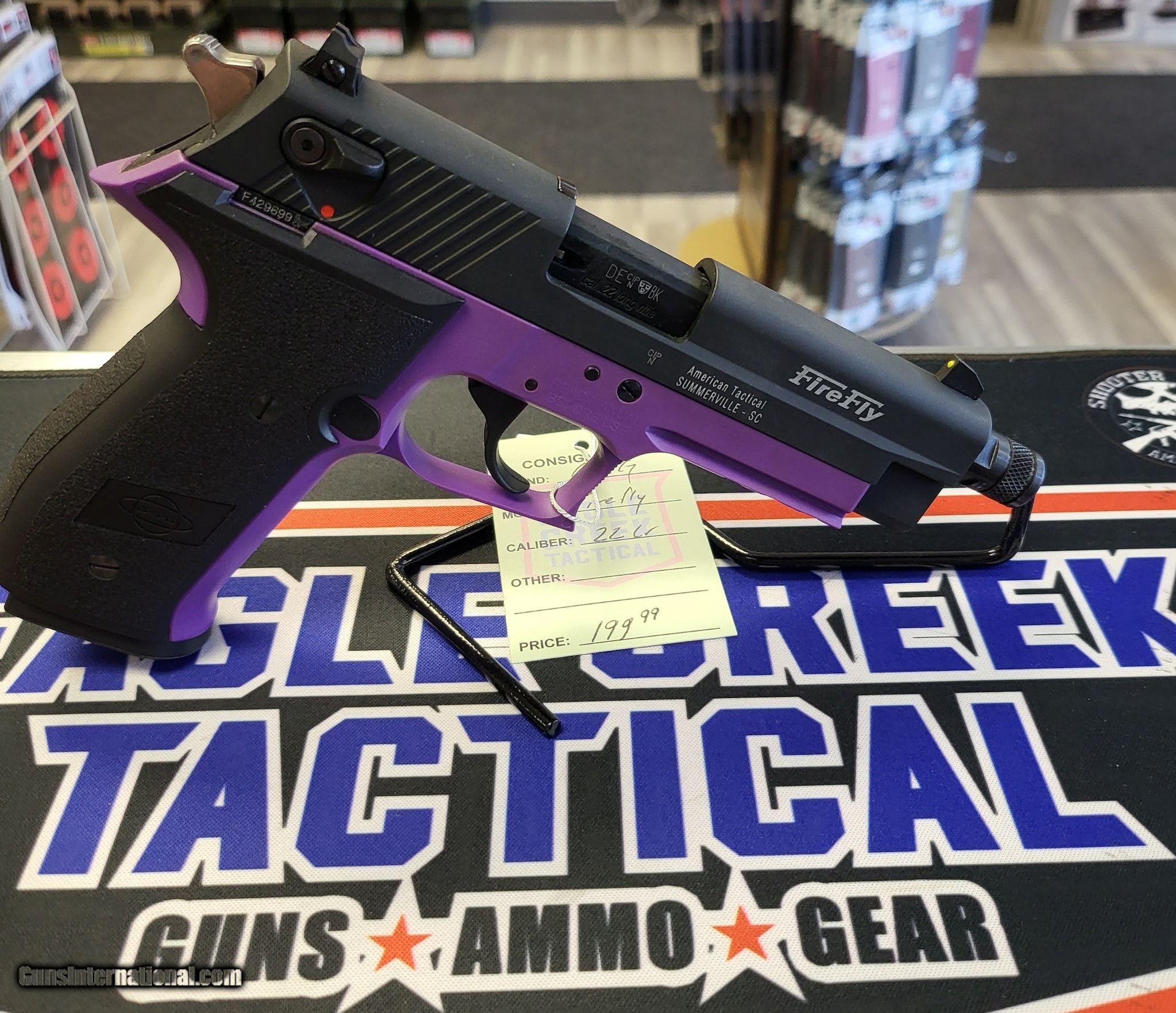Description: Guns Listing ID: 702081 GSG Firefly 1 Mag Gently Used comes with original box, wrench for threaded barrel, extra recoil spring and front dot sight SOLD Manufacturer: AMERICAN TACTICAL IMPORTS Model: FireFly Caliber Info: .22 LR Condition: Used - Non-Certified Barrels: 4.9" barrel Finish: PURPLE |