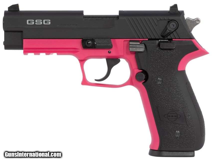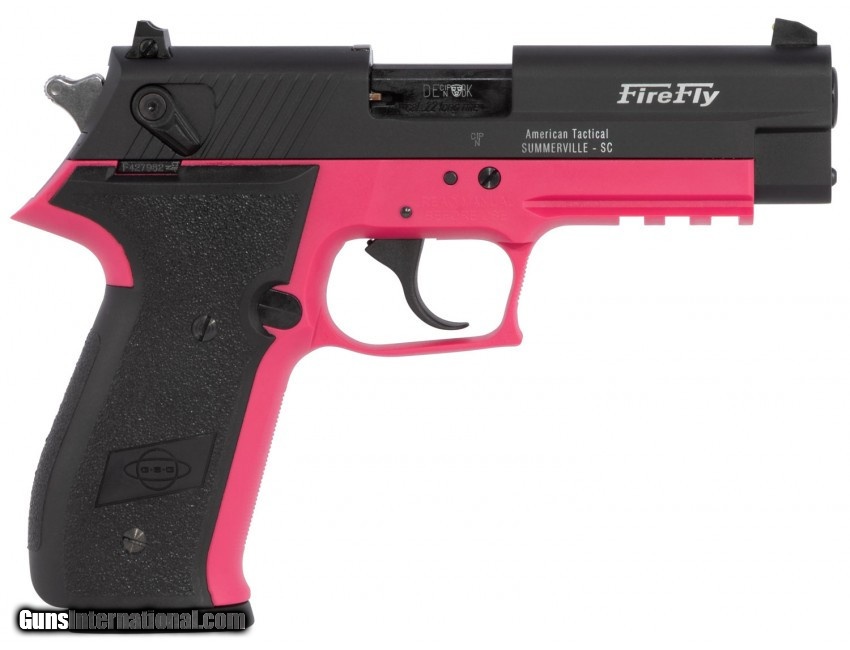 Description: Manufacturer: American Tactical Imports / German Sport Guns Model: GSG Firefly HGA SKU: GERG2210FFP Color: Pink Frame / Black Slide Caliber: .22 LR (High Velocity) Capacity: (1) 10 Round Magazine Barrel: 4" Overall Height: 5.3" Overall Length: 7.2" Weight: 24.6 Ounces Frame & Slide Material: Zinc Alloy Sights: Adjustable Rear, Fixed Front Grips: Black Polymer All items are factory new in box unless otherwise stated. Based on the information available to us, the above specifications describe this item to the best of our knowledge. For further information, please contact or visit the manufacturer's . SOLD |