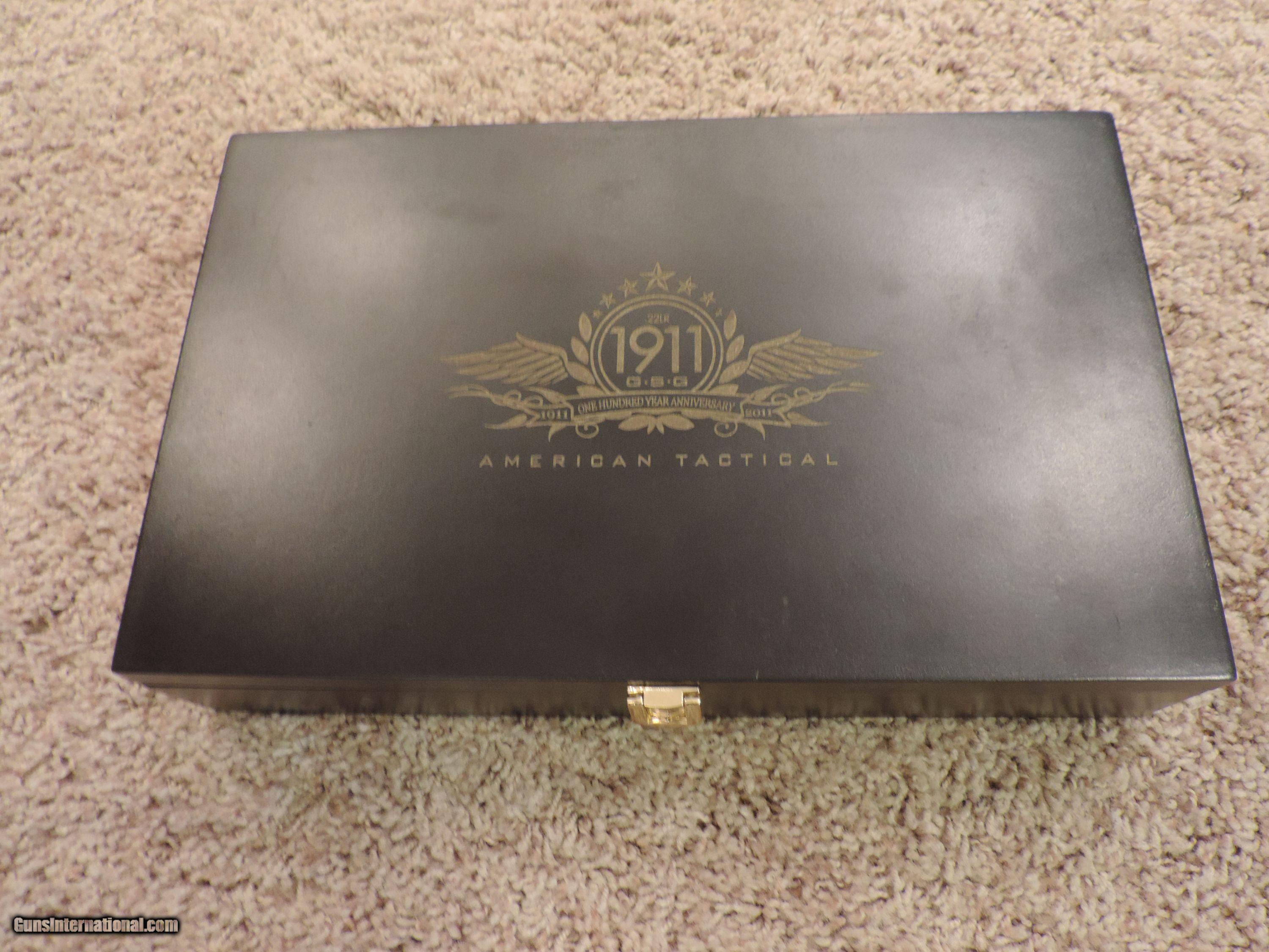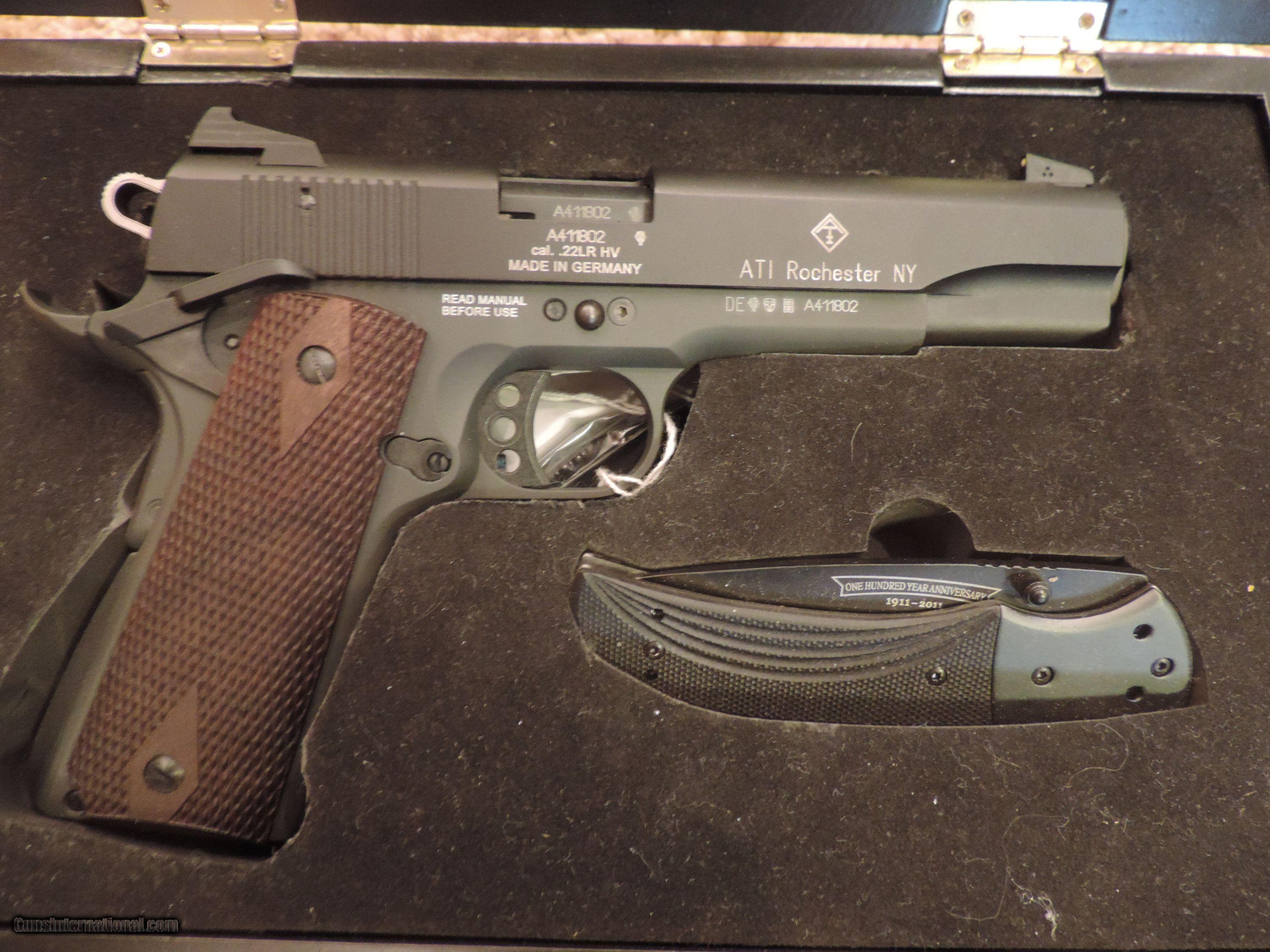 Description: GERG 1911ANV GSG(GERMAN SPORT GUNS) 100 YEAR ANNIVERSARY COMMEMORATIVE 1911 SEMI AUTO PISTOL IN 22LR FEATURES A 5-INCH THREADED BARREL, WOOD GRIPS, FIXED SIGHTS, DISPLAY CASE, ENGRAVED FOLDING KNIFE, UNIQUELY NUMBERED SLIDE, LIMITED EDITION #59 OF 1911 MADE. ONE (10) ROUND MAGAZINE. SINGLE ACTION. NEW IN BOX. SUBJECT TO PRIOR STORE SALE. BUYER RESPONSIBLE TO DETERMINE IF THIS FIREARM IS LEGAL IN HIS/HER STATE. SHIP TO FFL ONLY. BUYER PAYS 3% CREDIT CARD FEE. BUYER PAYS $25.00 SHIPPING TO LOWER 48 STATES. ARIZONA RESIDENTS PAY 6.712% SALES TAX. SOLD Manufacturer: GERMAN SPORT GUNS Model: GERG1911ANV Serial Number: A411802 Caliber Info: 22LR Condition: New in Box |